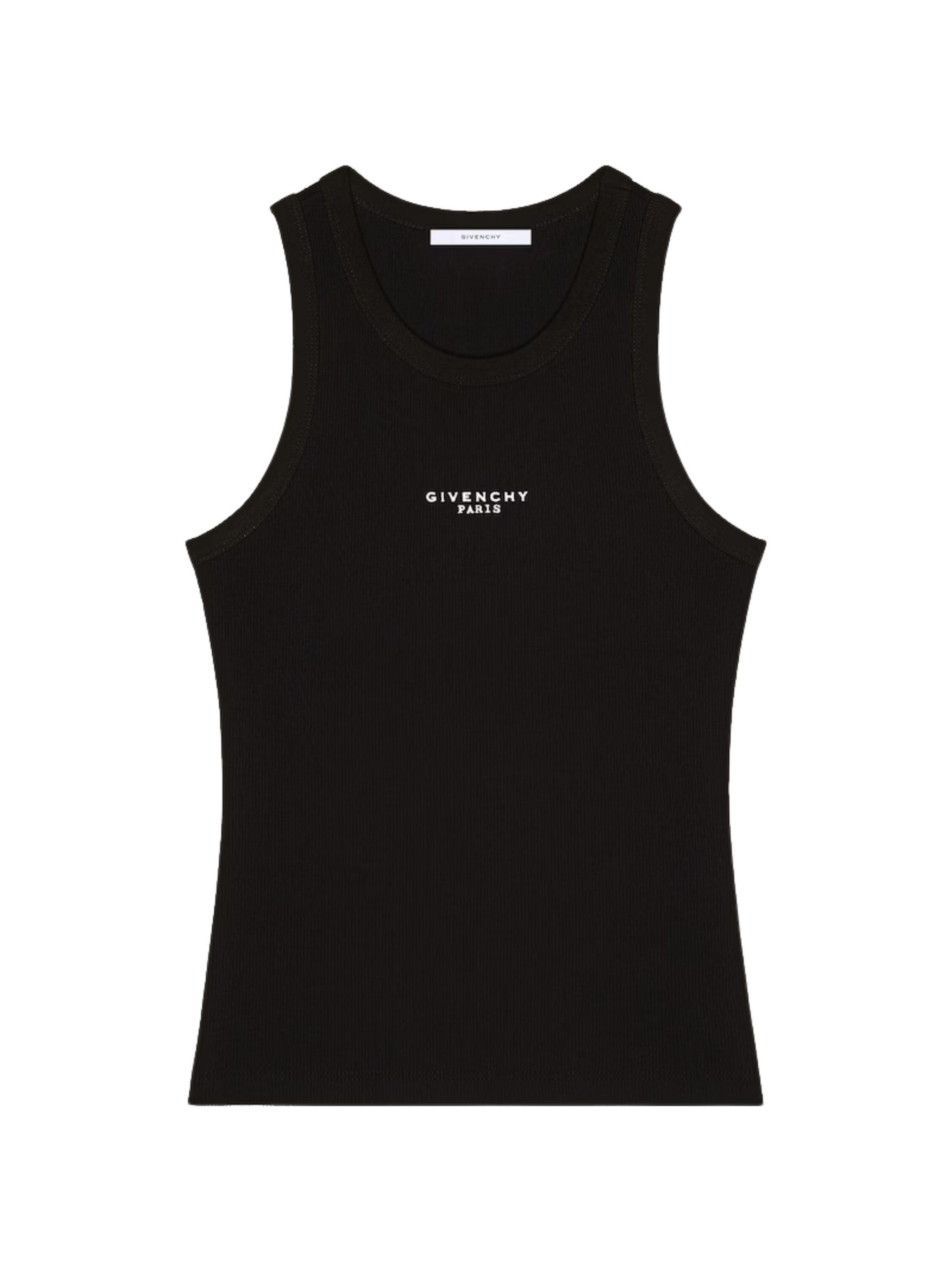 Top con logo di GIVENCHY nero in cotone, caratterizzato da girocollo e logo Givenchy Paris sul petto.