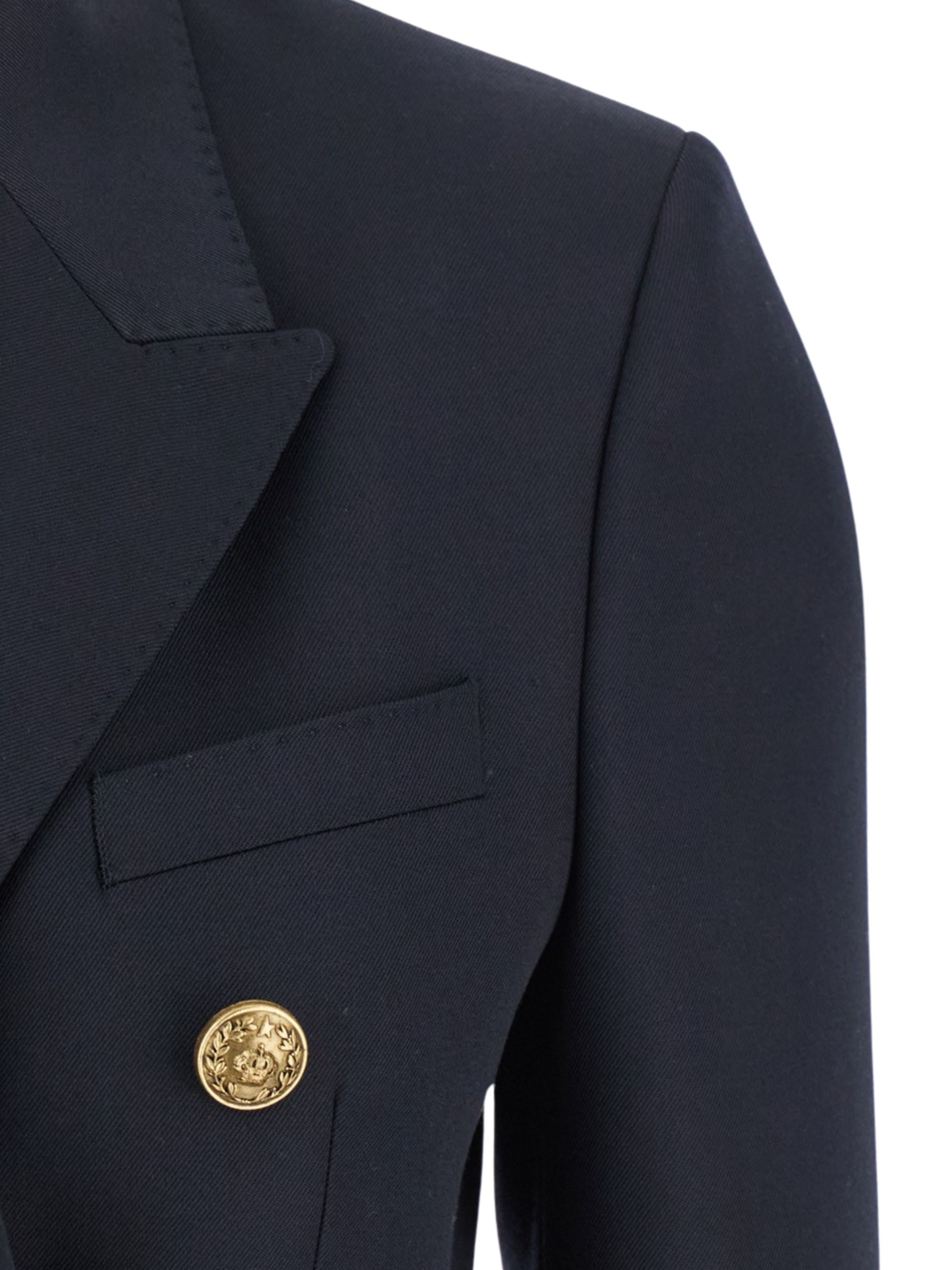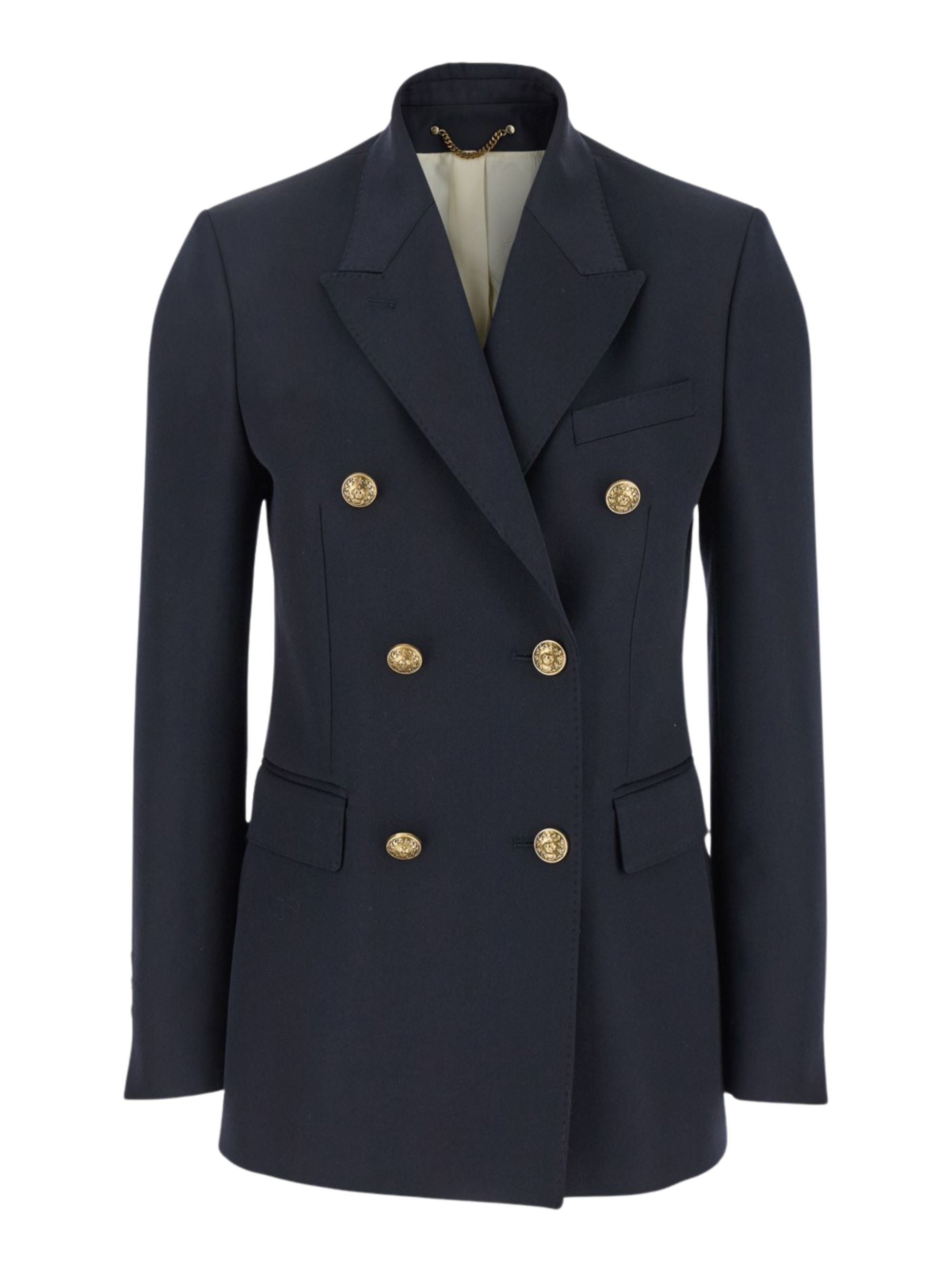Blazer Diva di GOLDEN GOOSE blu in lana, caratterizzato da chiusura con bottoni a doppiopetto, tasche con patta, patch logo ricamato sulla manica e revers classico.