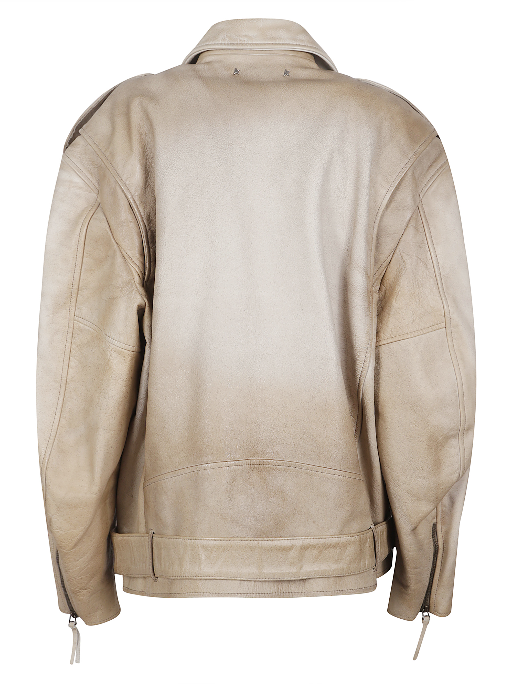 Giacca Biker di GOLDEN GOOSE beige in pelle, caratterizzata da chiusura con zip, cintura con fibbia, tasca sul petto con cerniera, tasca applicata sul davanti e spalline.