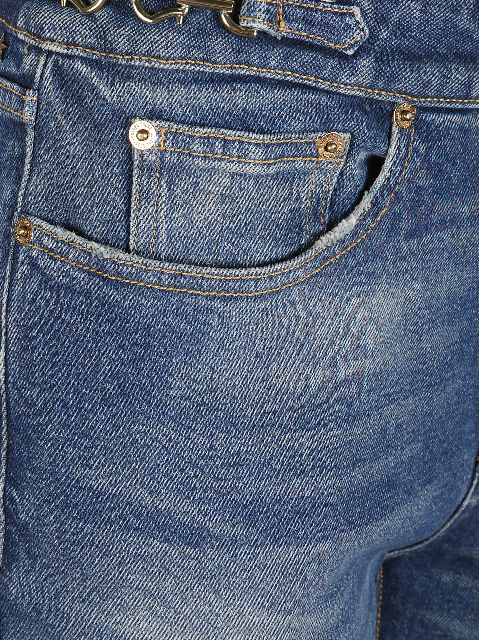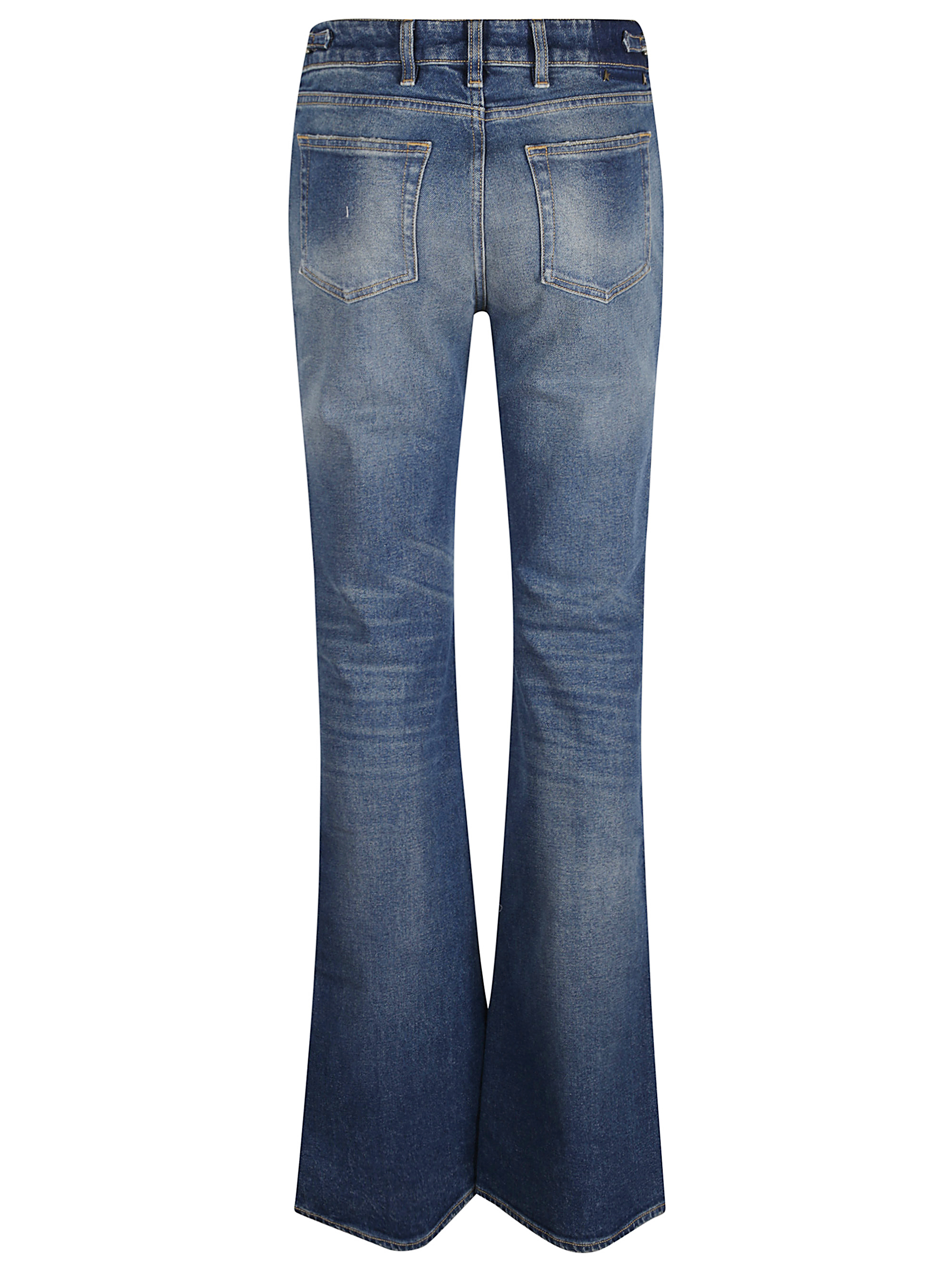 Jeans Ophelia Bootcut di GOLDEN GOOSE blu in cotone, caratterizzato da cinque tasche classiche, chiusura conbottone e zip e dettagli metallici in vita.