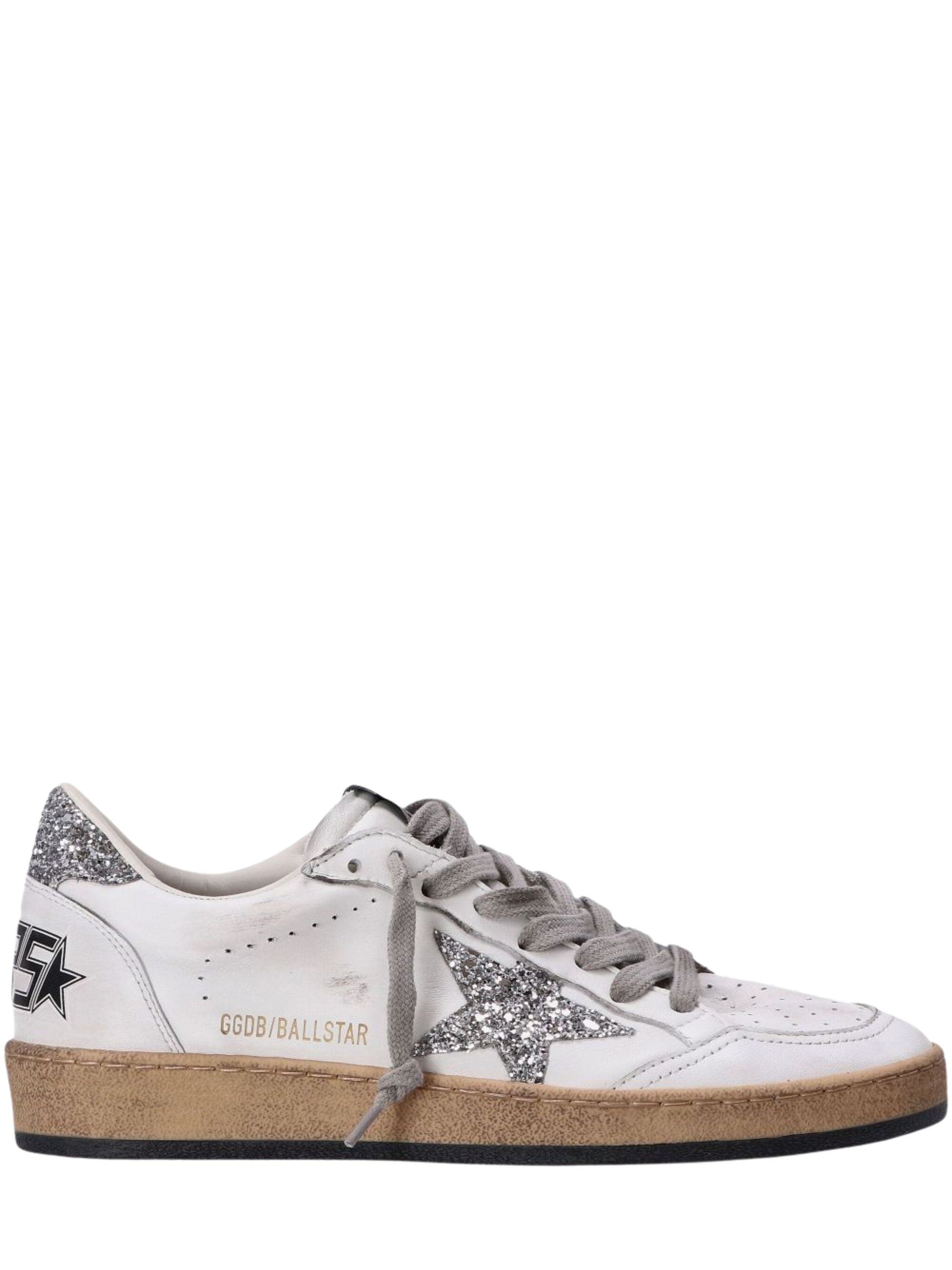 Sneaker Ballstar di GOLDEN GOOSE bianca in pelle, caratterizzata da suola in gomma, stella glitterata argento, chiusura con lacci e inserto in nappa bianca sul retro.