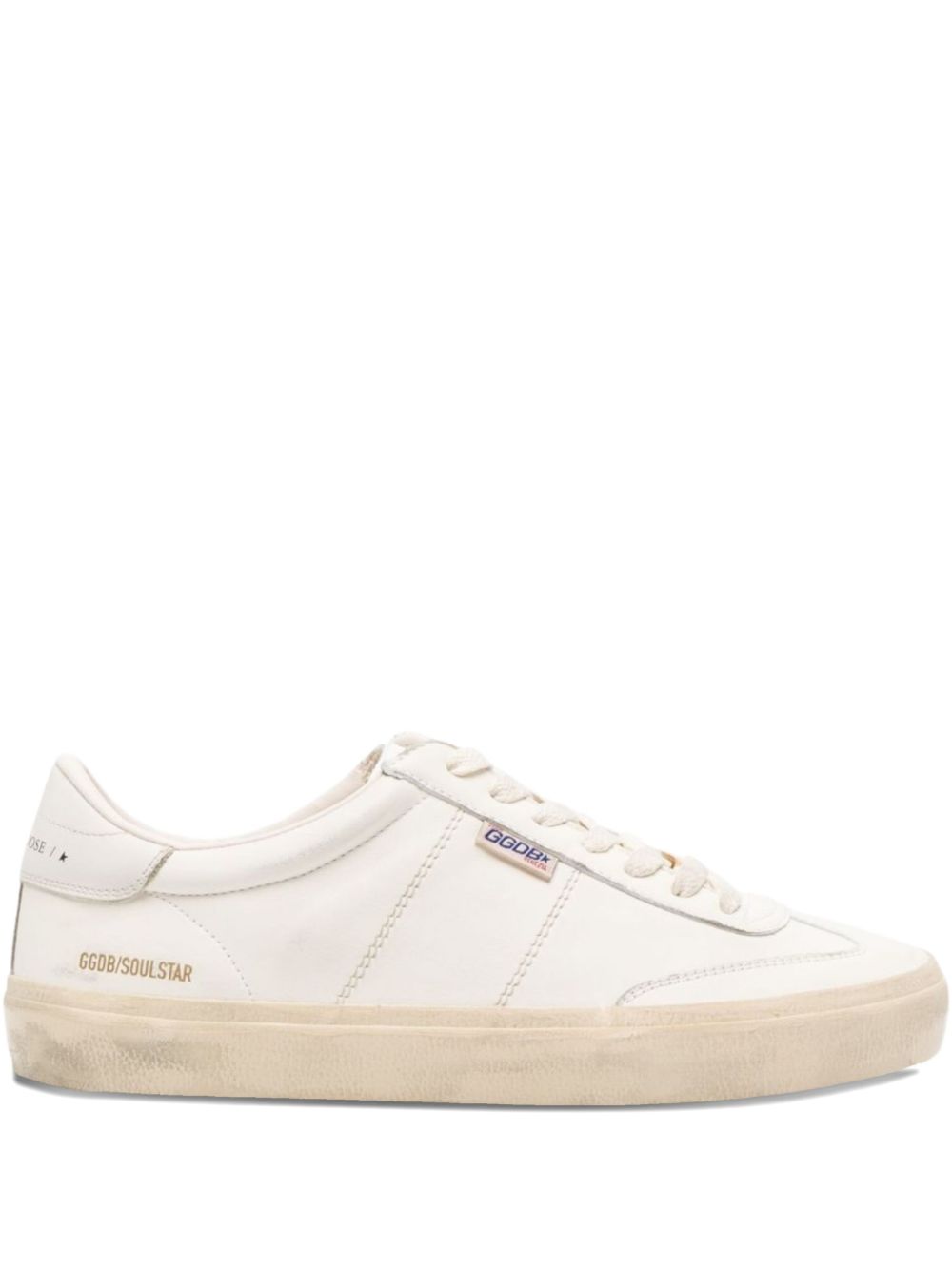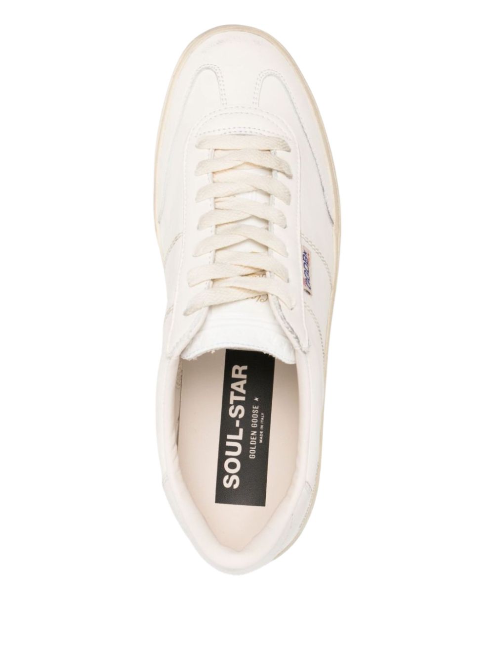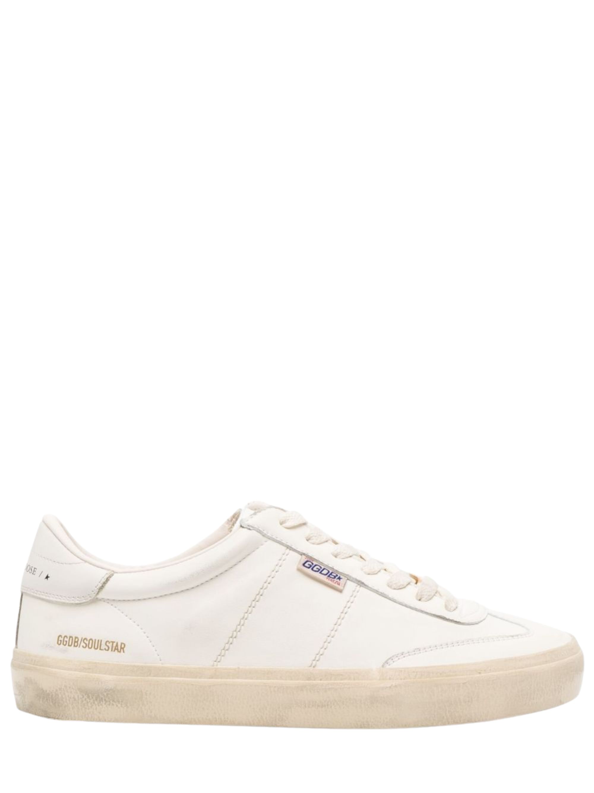 Sneaker Soul Star di GOLDEN GOOSE bianca in pelle, caratterizzata da chiusura con lacci, suola in gomma, logo sul retro, effetto used e punta tonda.