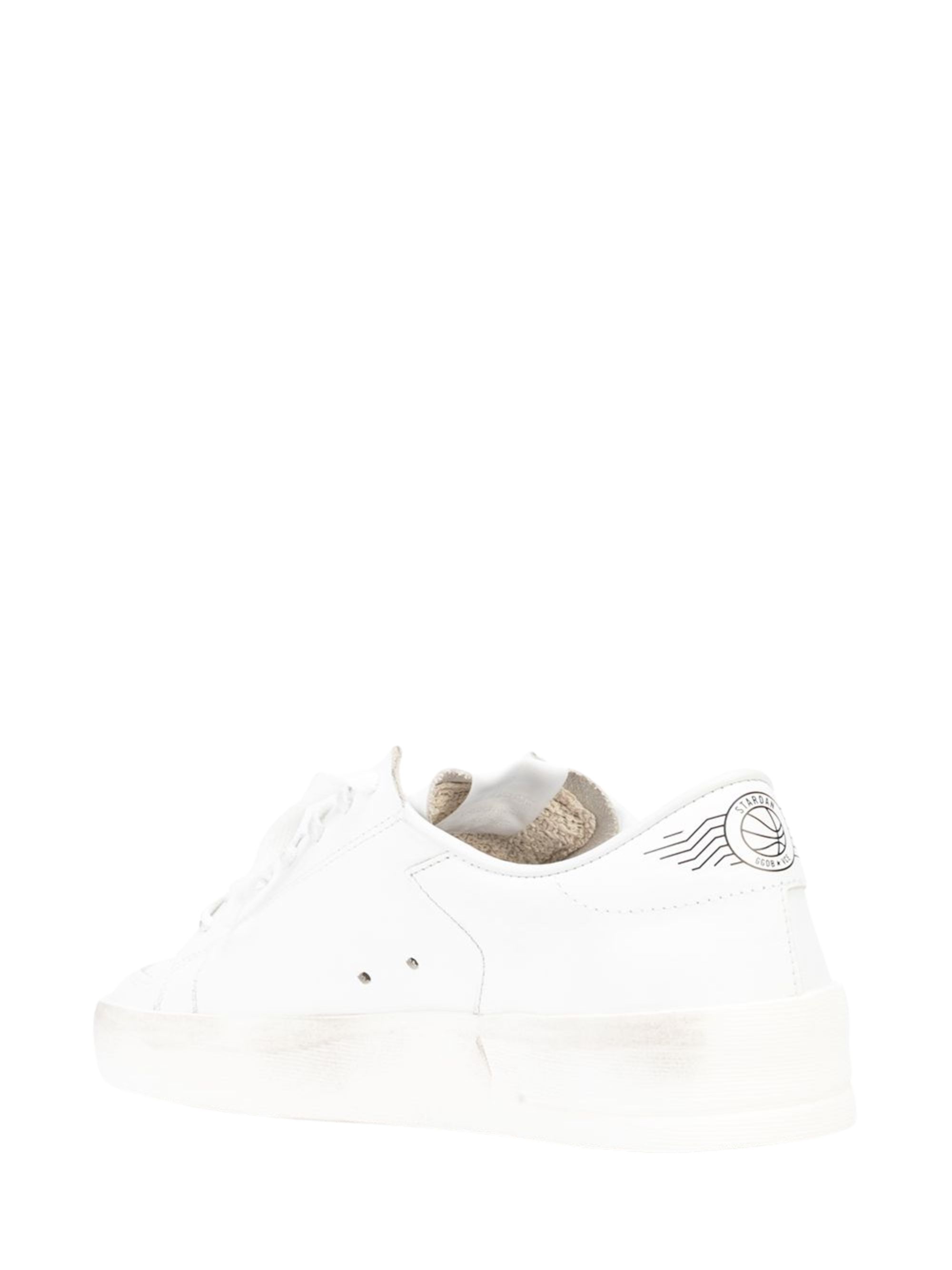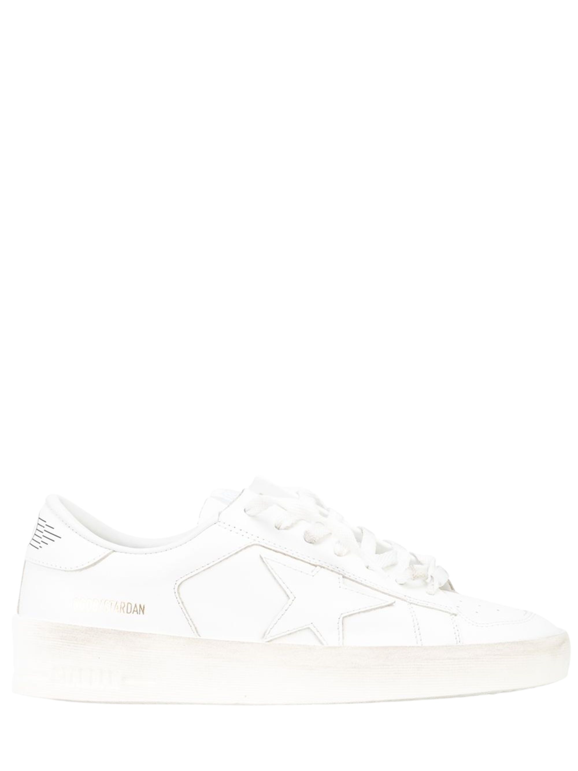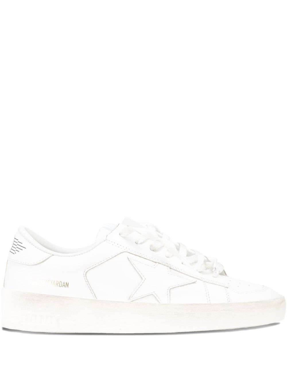 Sneaker Stardan di GOLDEN GOOSE bianca in pelle, caratterizzata da effetto vintage, punta traforata, stella logo laterale, etichetta logata sulla linguetta, interno in spugna e pelle e suola in gomma.
