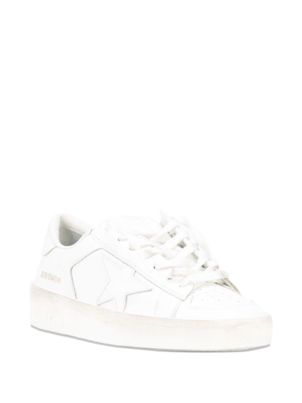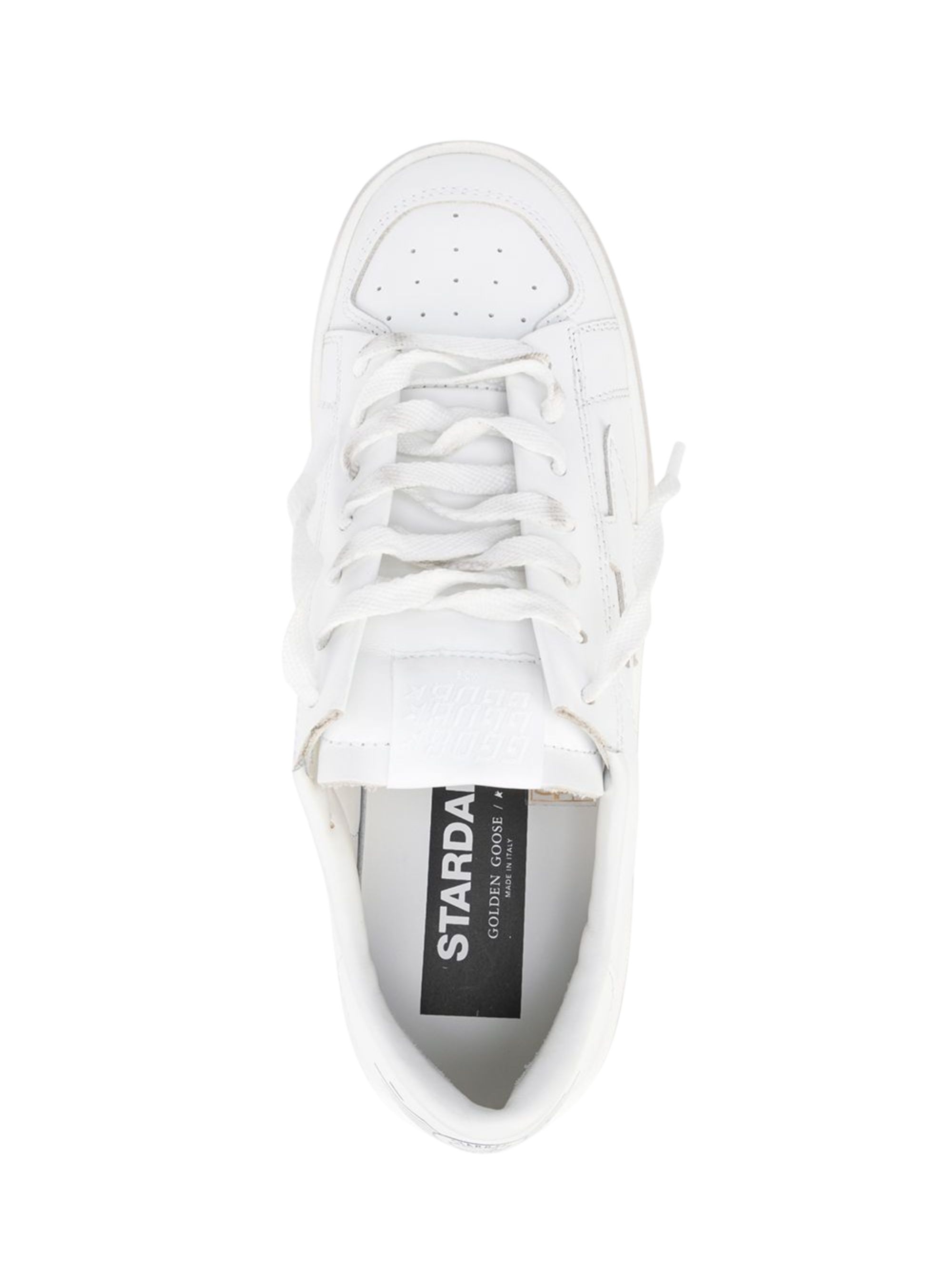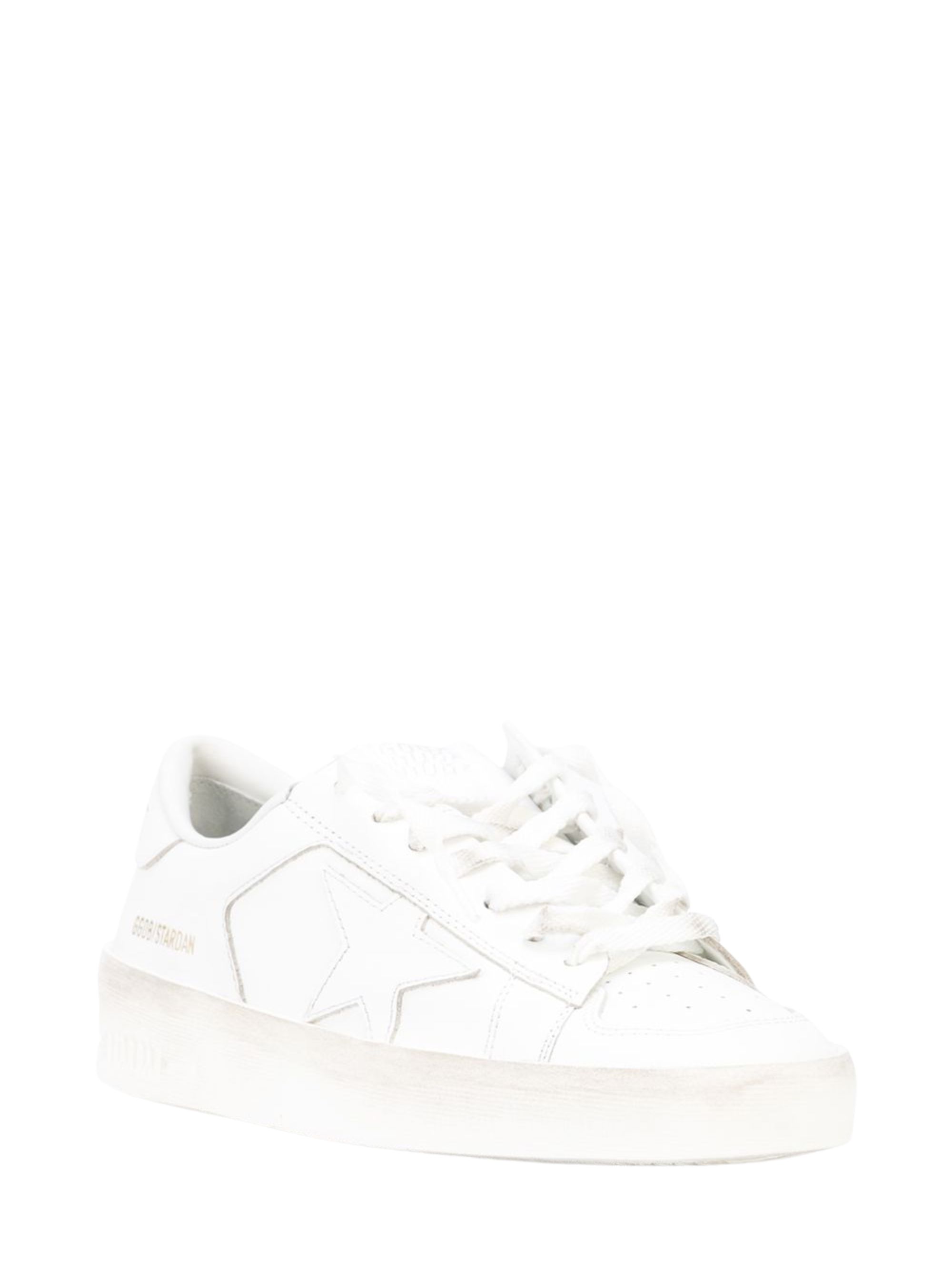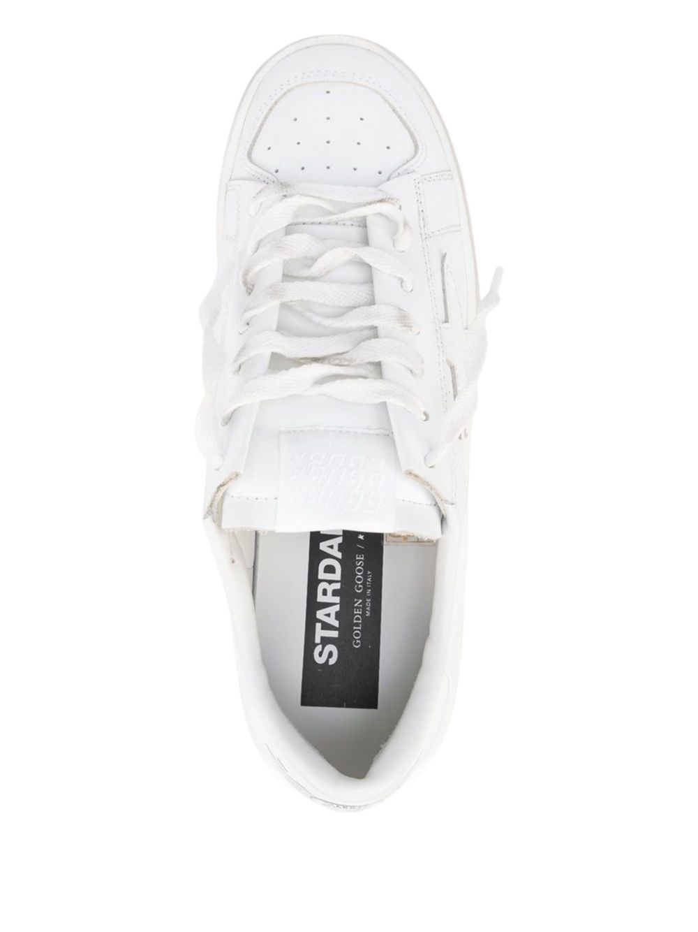 Sneaker Stardan di GOLDEN GOOSE bianca in pelle, caratterizzata da effetto vintage, punta traforata, stella logo laterale, etichetta logata sulla linguetta, interno in spugna e pelle e suola in gomma.