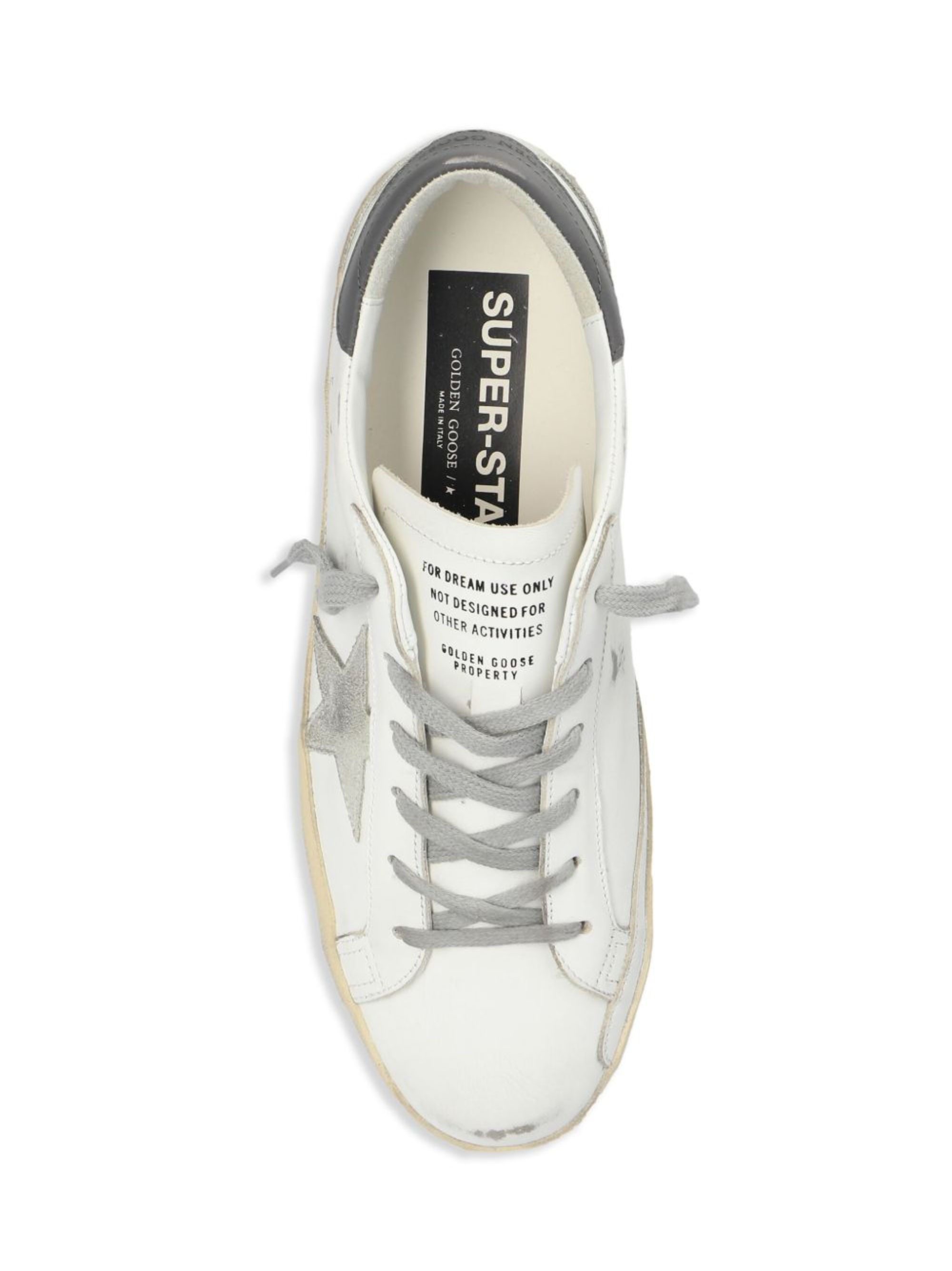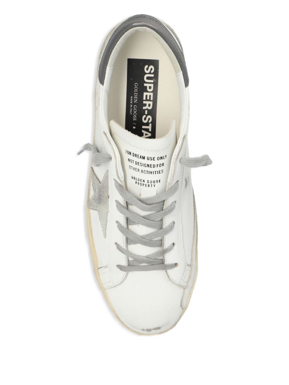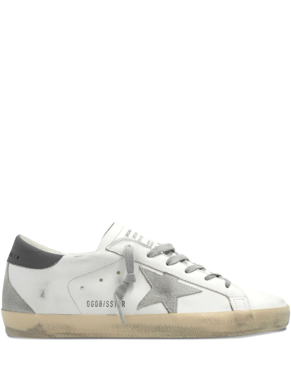 Sneaker Super Star di GOLDEN GOOSE bianca e grigia in pelle, caratterizzata da chiusura con lacci, stella Golden Goose, effetto invecchiato sui lati e logo.