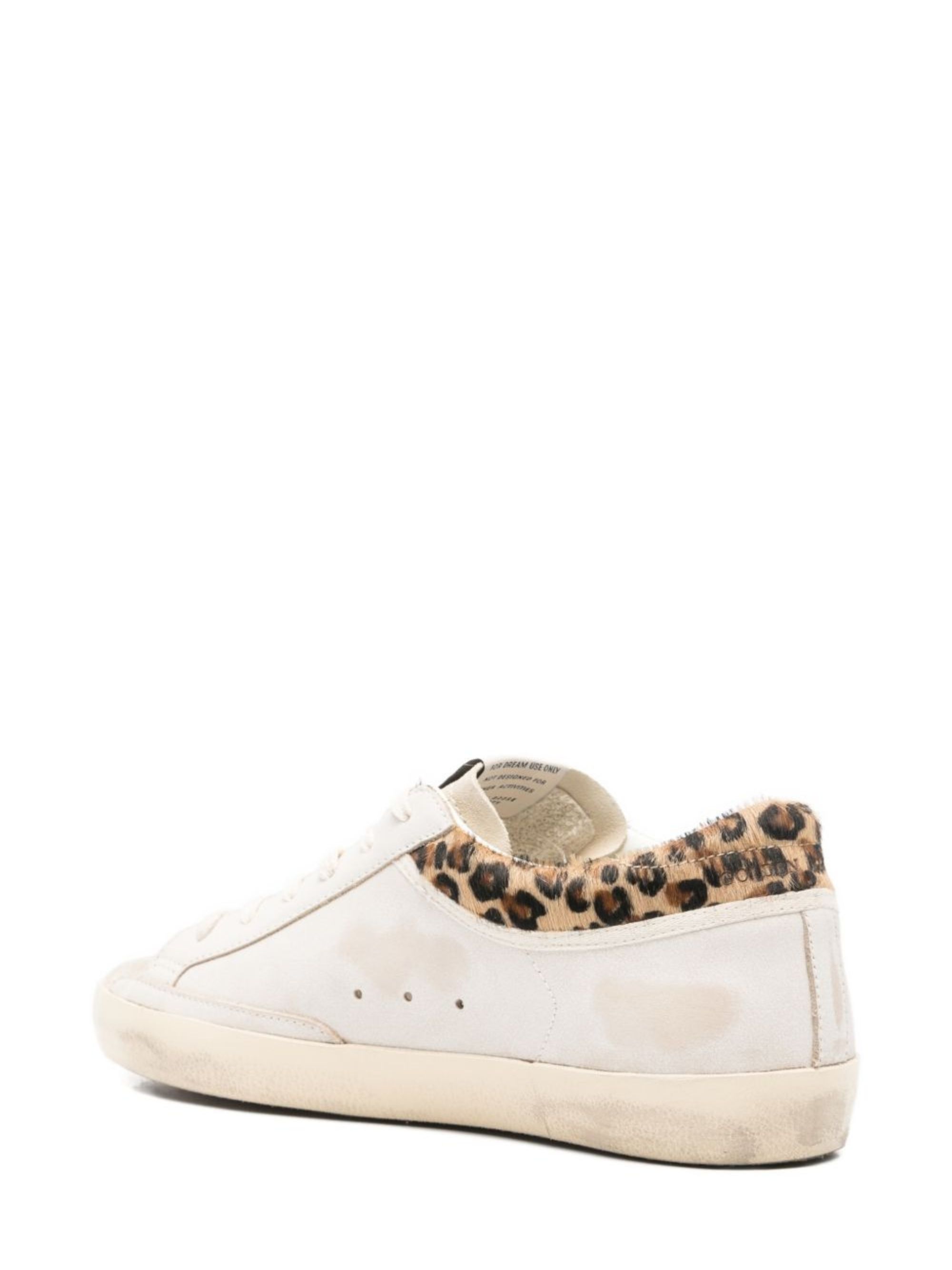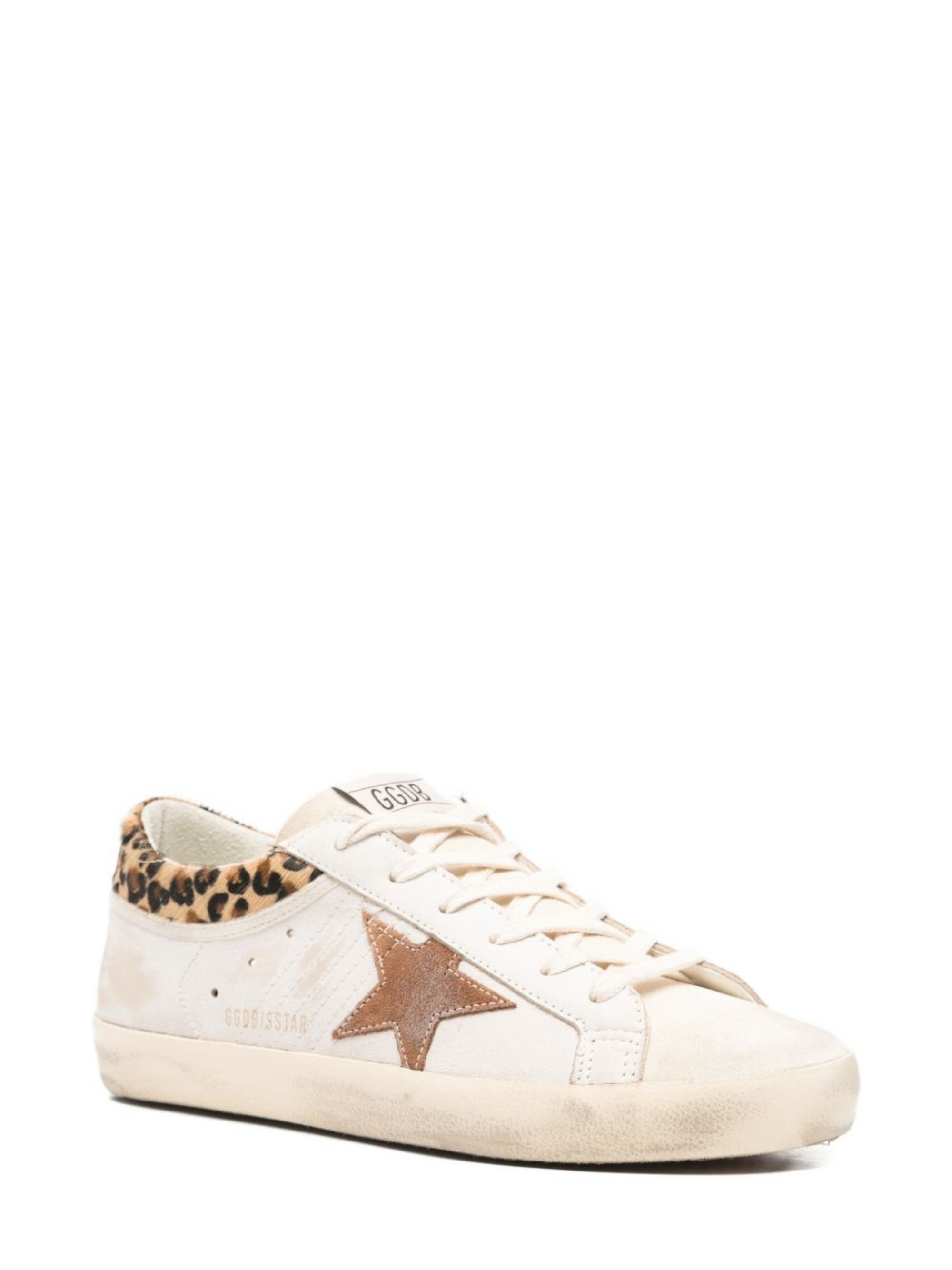Sneaker Super-Star di GOLDEN GOOSE bianca in pelle, caratterizzata da effetto vintage, stella laterale in suede marrone, talloncino maculato con effetto cavallino, chiusura con lacci, linguetta logata, logo laterale e suola in gomma.
