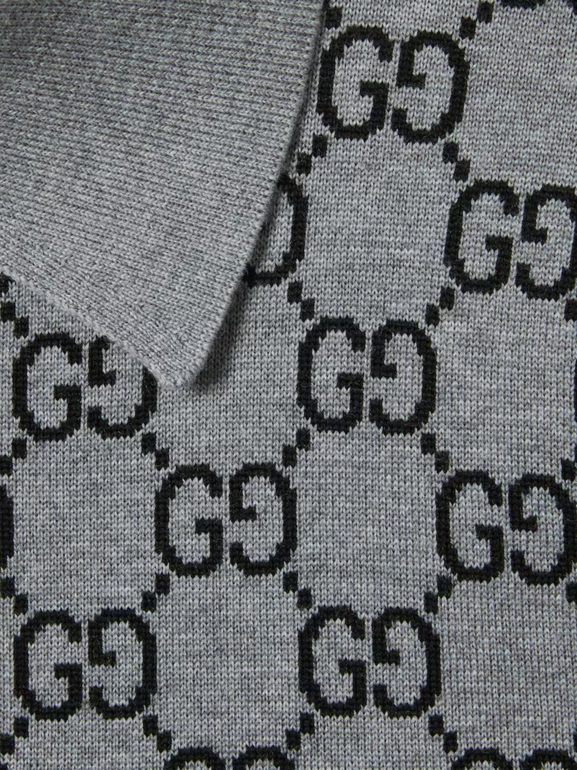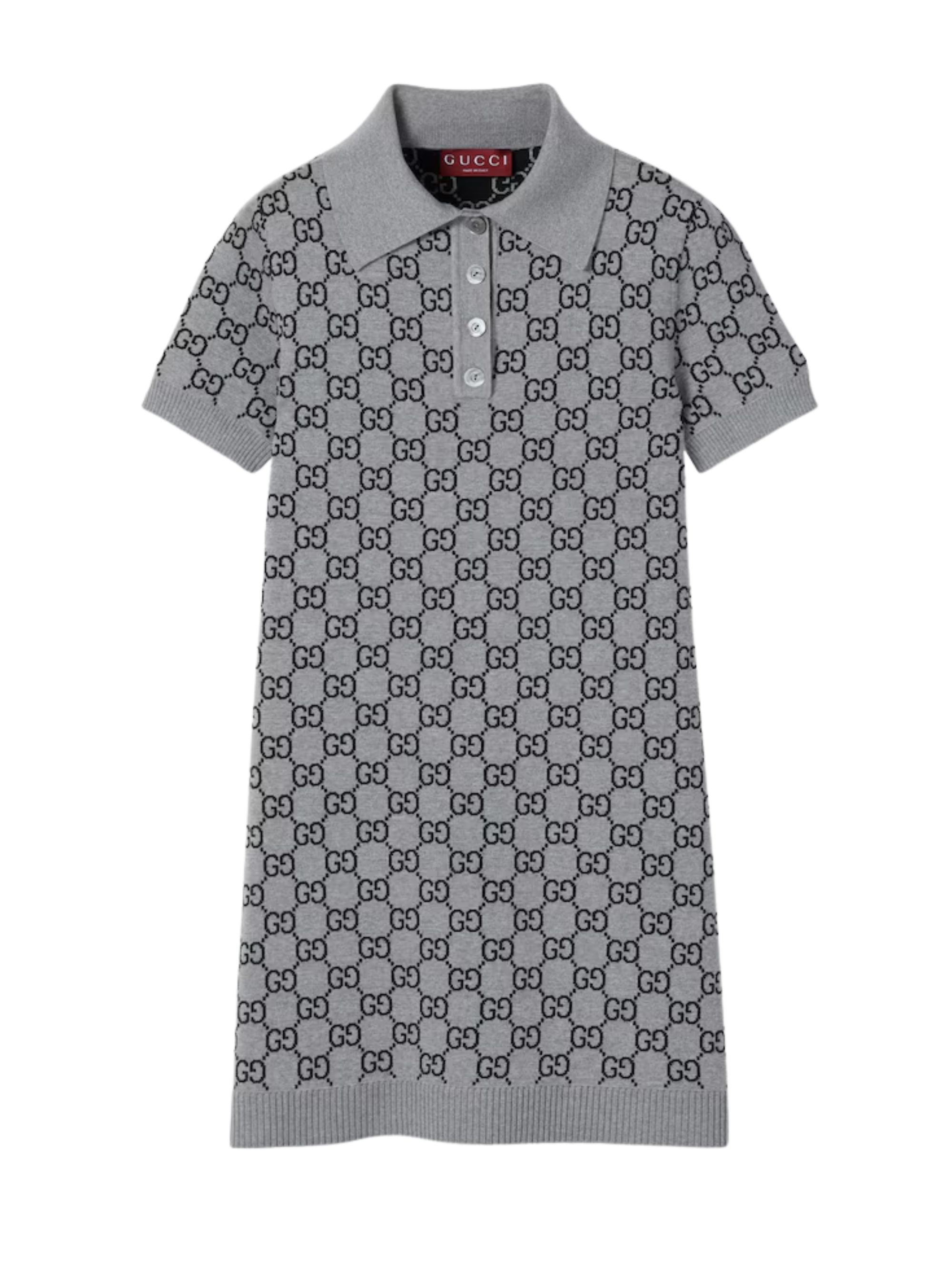 Abito polo di GUCCI grigio e nero in lana ultrafine GG jacquard, con colletto, maniche corte, finiture a coste e falsatura corta con bottoni.