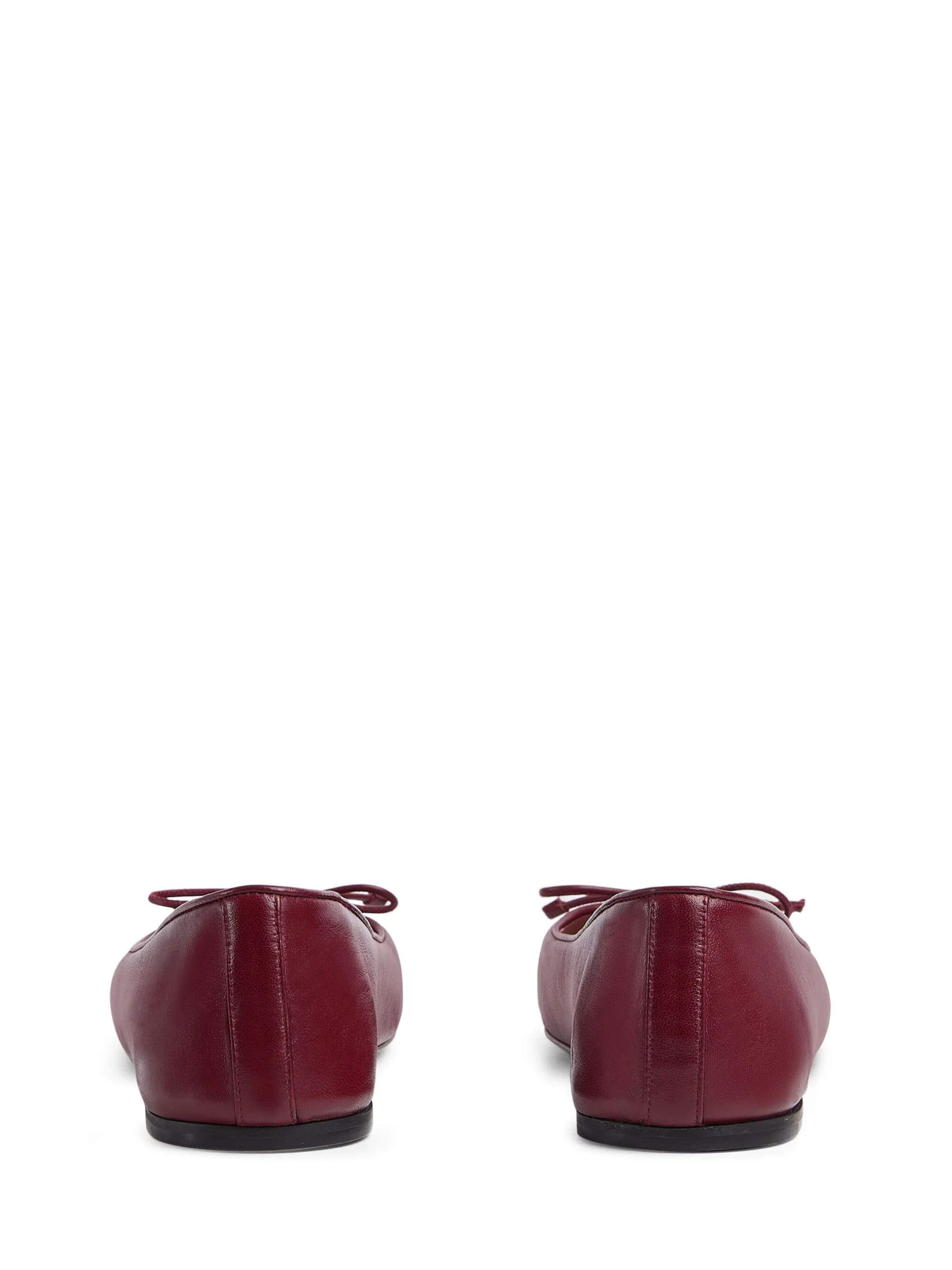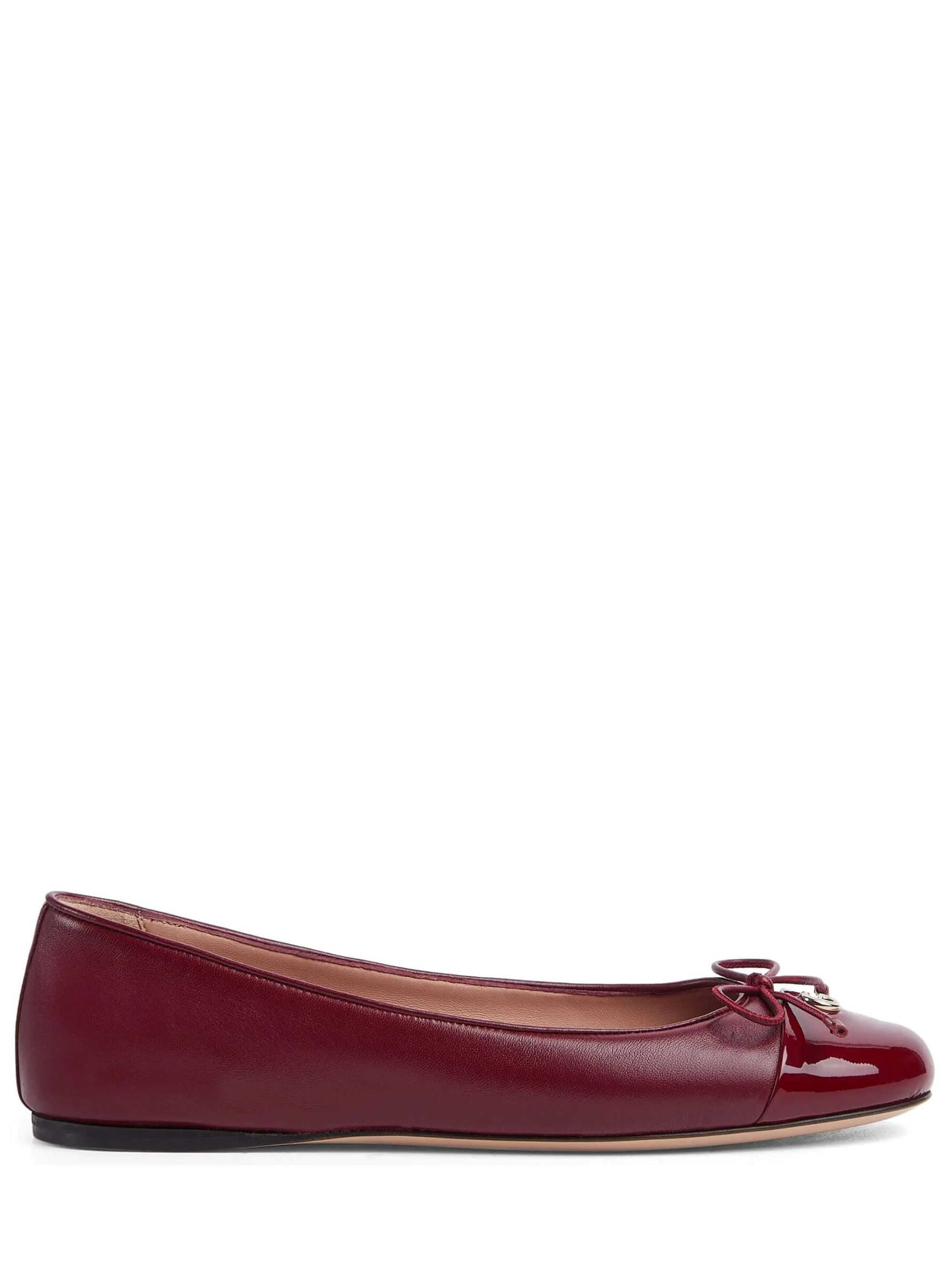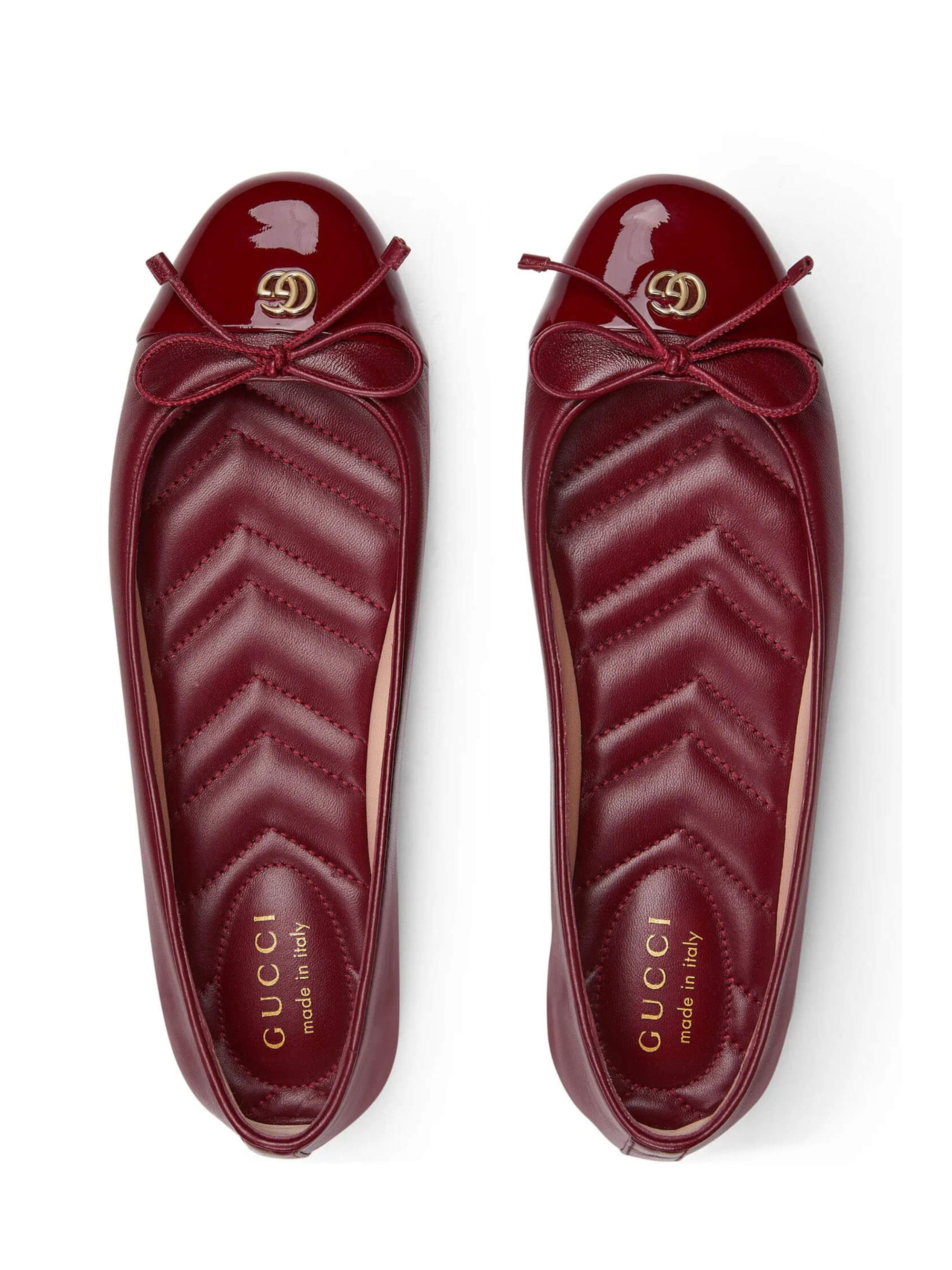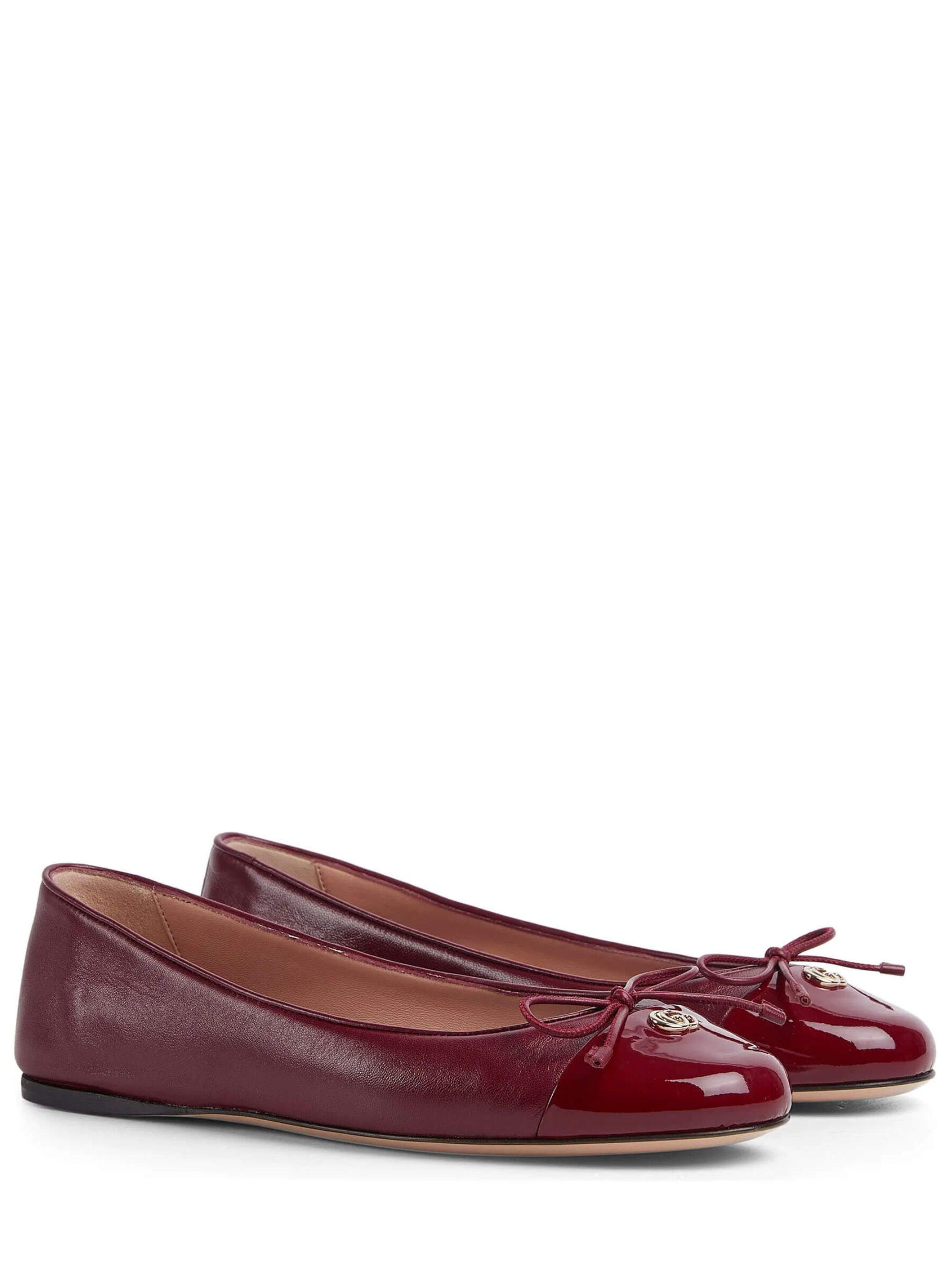 Ballerina Marmont GG di GUCCI rosso Ancora in pelle con hardware oro, punta in vernice, fiocco, doppia G e suola in cuoio piatta.