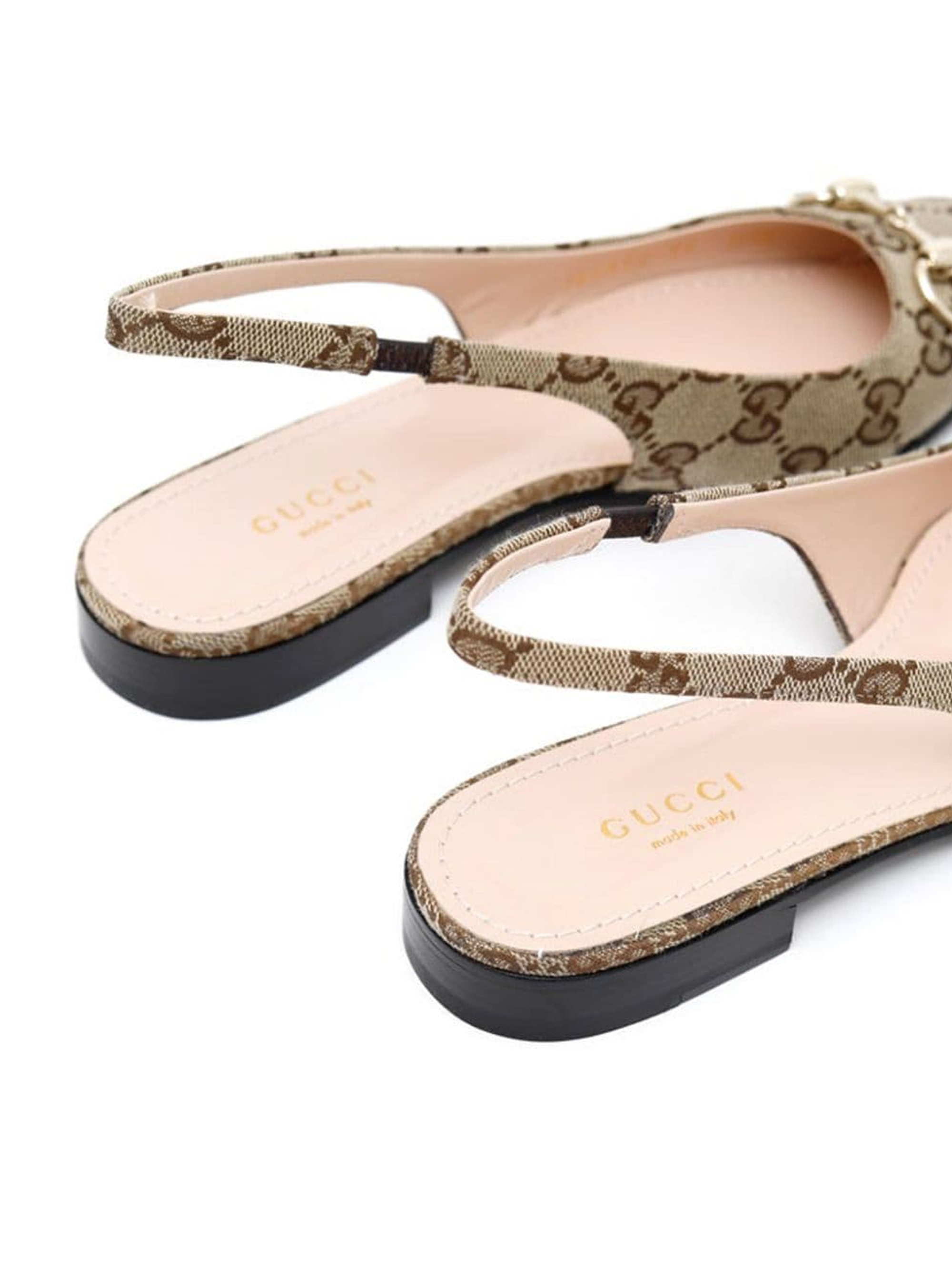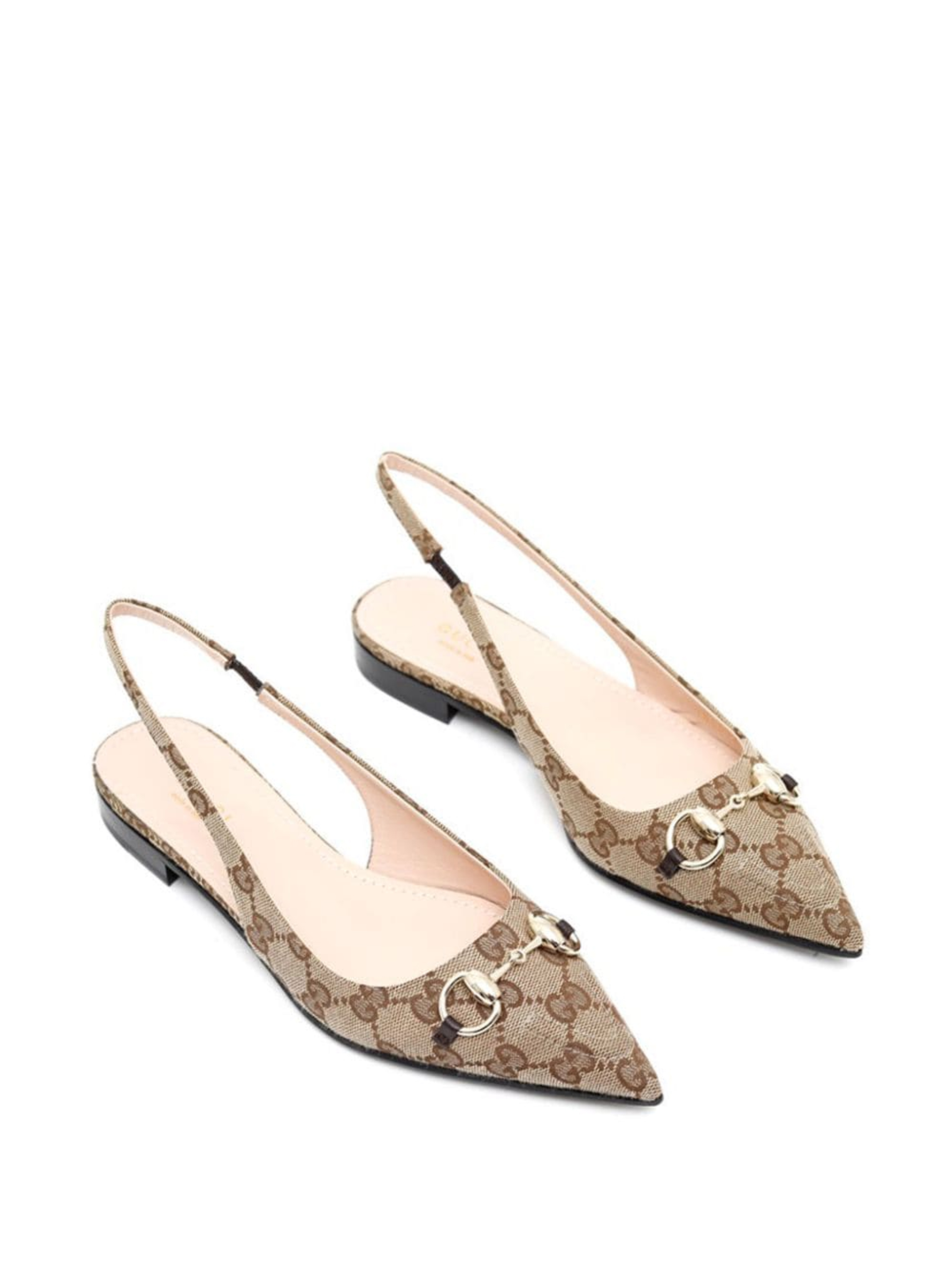Ballerina slingback di GUCCI beige con stampa con monogramma, caratteristico dettaglio con morsetto, design a punta, cinturino posteriore e tacco lamellato.