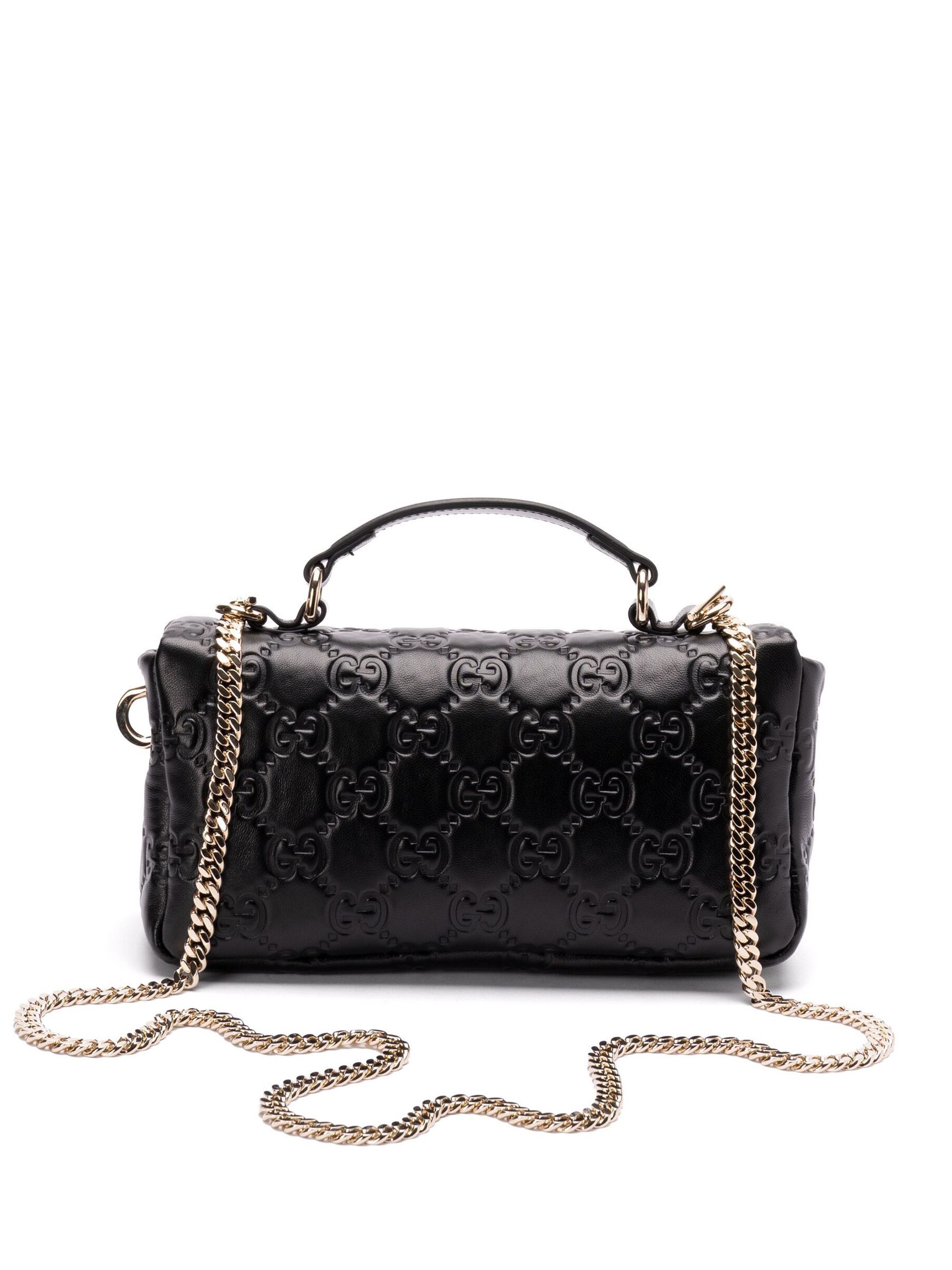Borsa a mano GG Milano mini di GUCCI nera in pelle con manico superiore, tracolla rimovibile con catena, motivo monogram, tasca interna con zip e tasca a soffietto e chiusura con bottone a pressione.