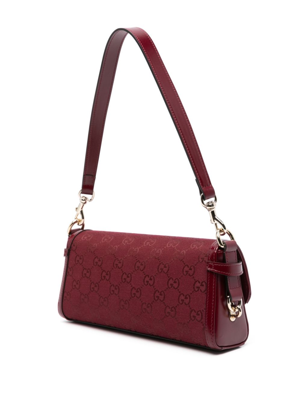 Borsa a spalla Luce piccola di GUCCI borgogna in tela con motivo GG, rifiniture in pelle, tracolla removibile, chiusura a girello, tasca interna con zip e hardware oro.