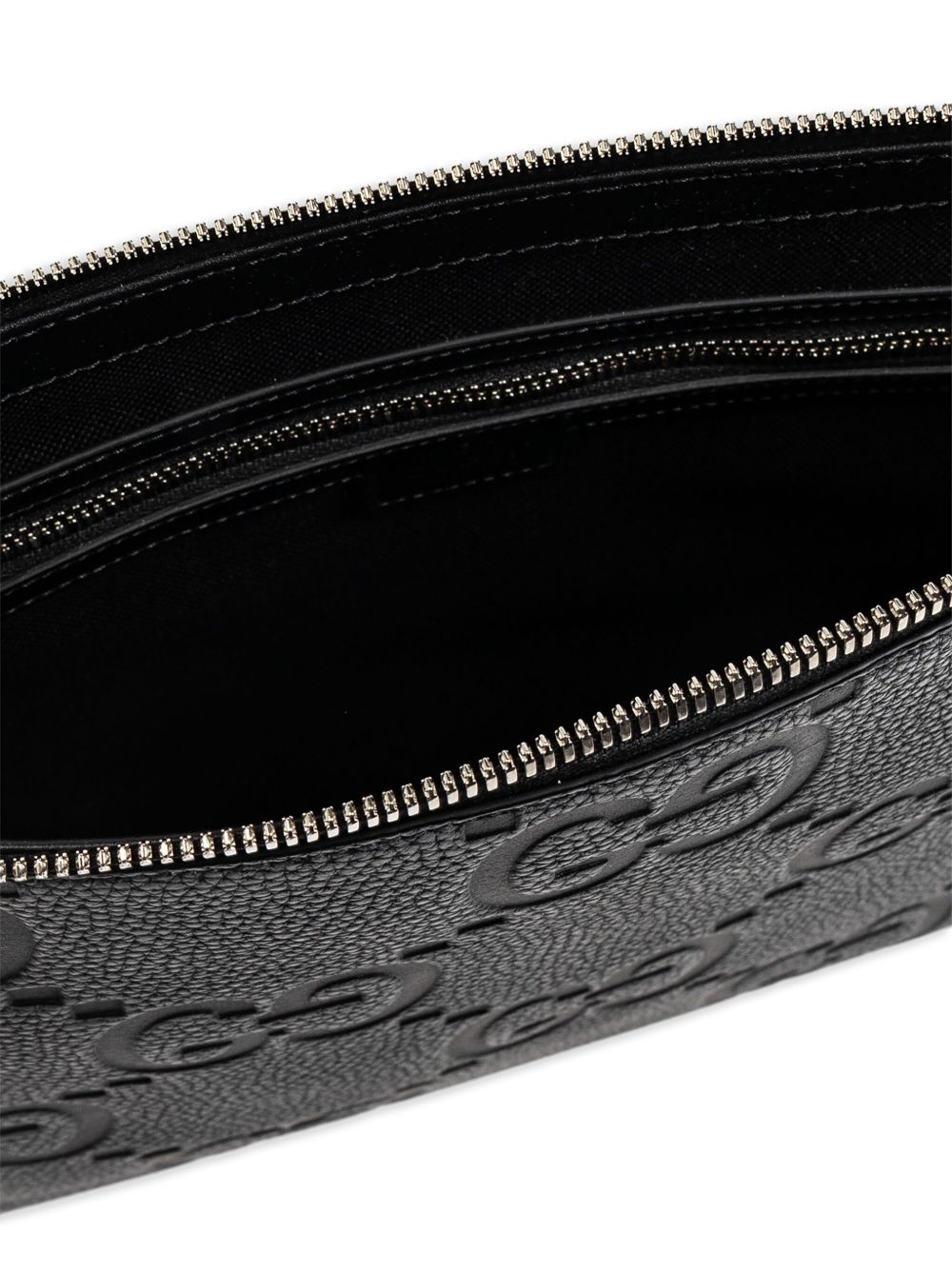 Borsa a tracolla GG Jumbo di GUCCI nera in pelle con fodera in cotone e lino, monogram all over, tracolla in tessuto e chiusura con zip.