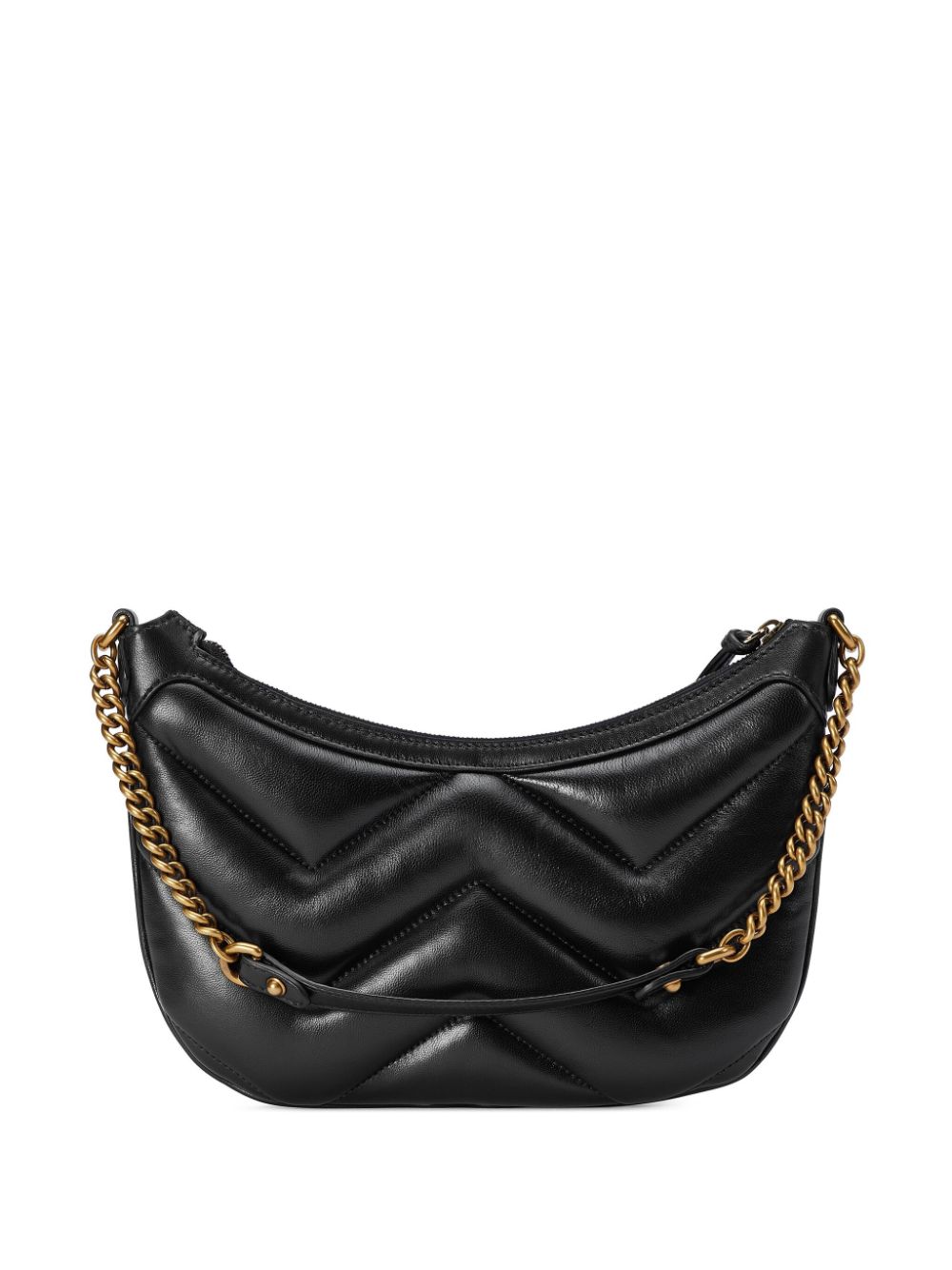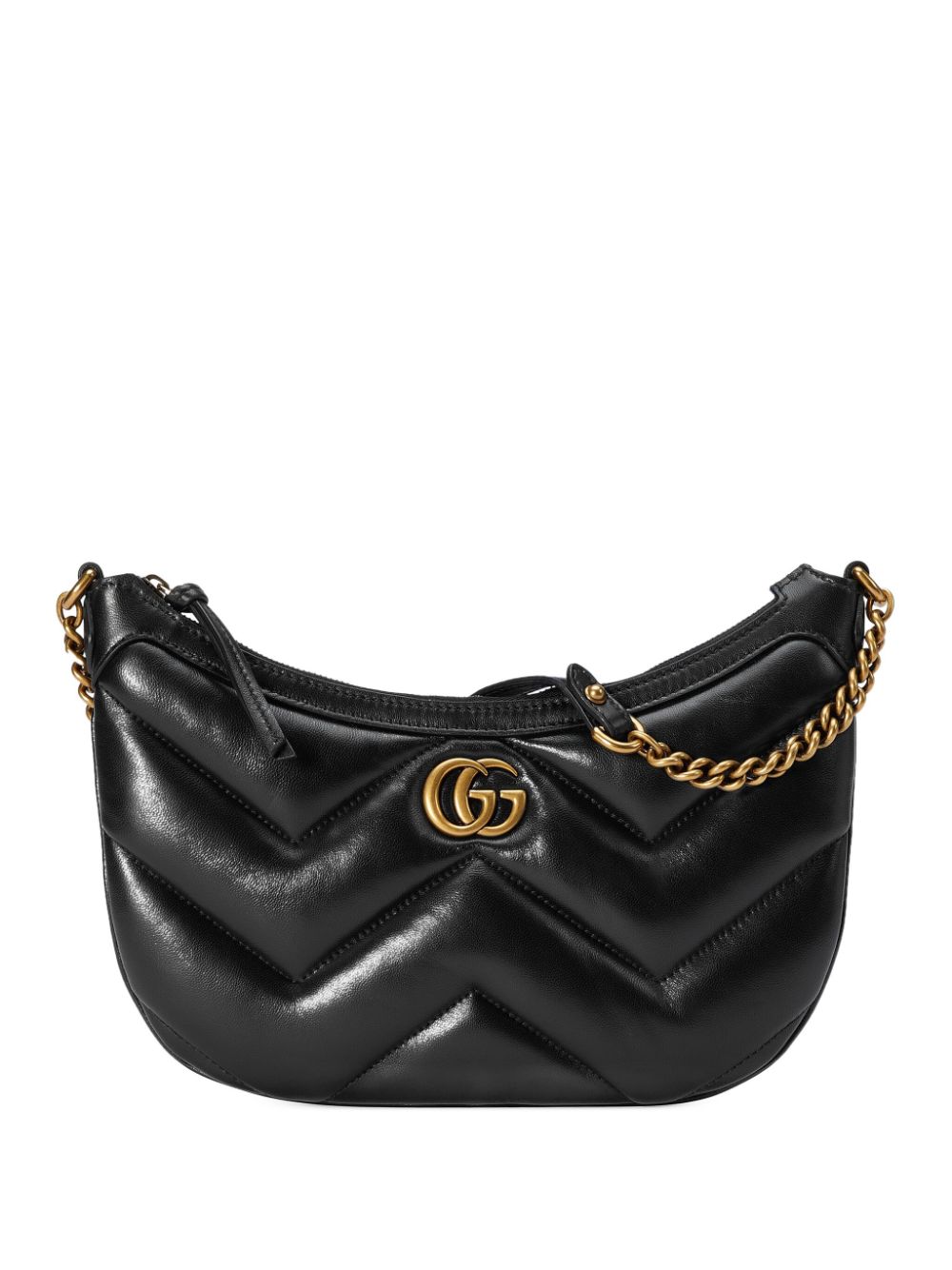 Borsa GG Marmont di GUCCI colore nero, caratterizzata da design imbottito, logo frontale sulla tonalità dell'oro, chiusura con zip, manico a catena.