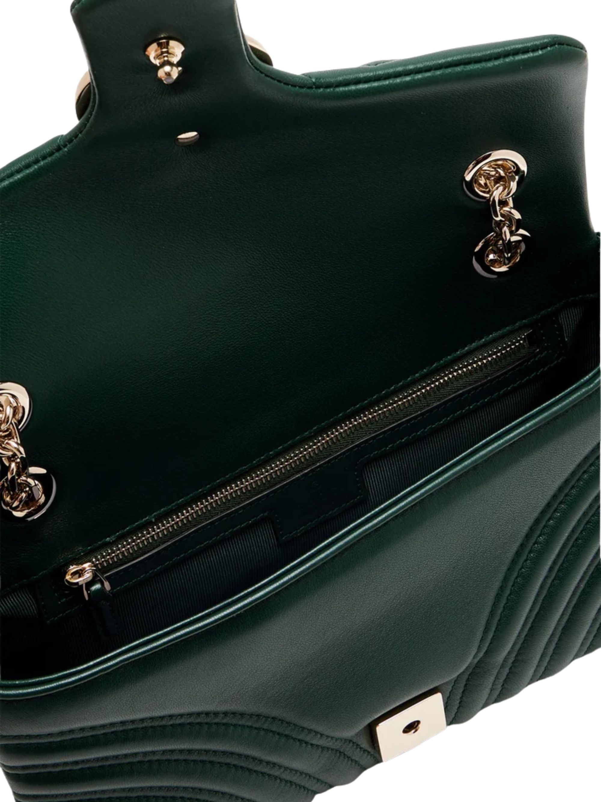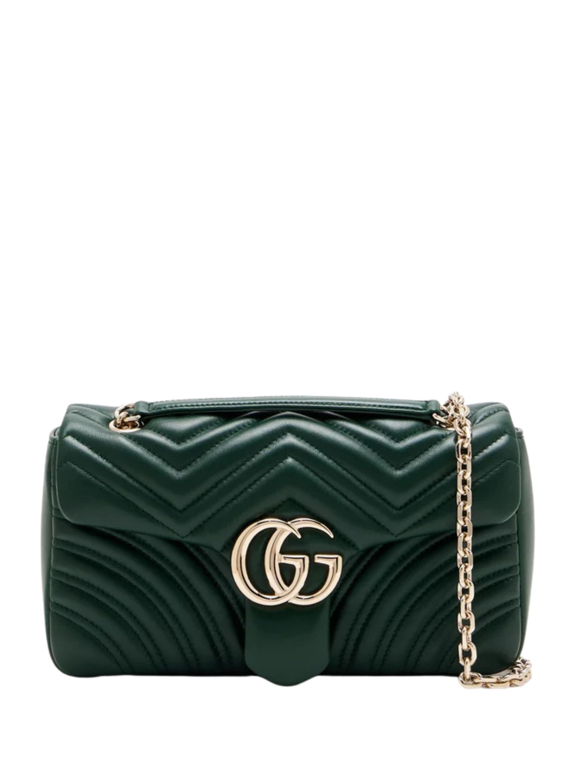 Borsa GG Marmont media di GUCCI verde in nappa con motivo chevron, caratterizzato da hardware oro, doppia G, tracolla a catena, pattina con chiusura a scatto e fodera in viscosa. Dimensioni: 26 x 15 x 7 CM.