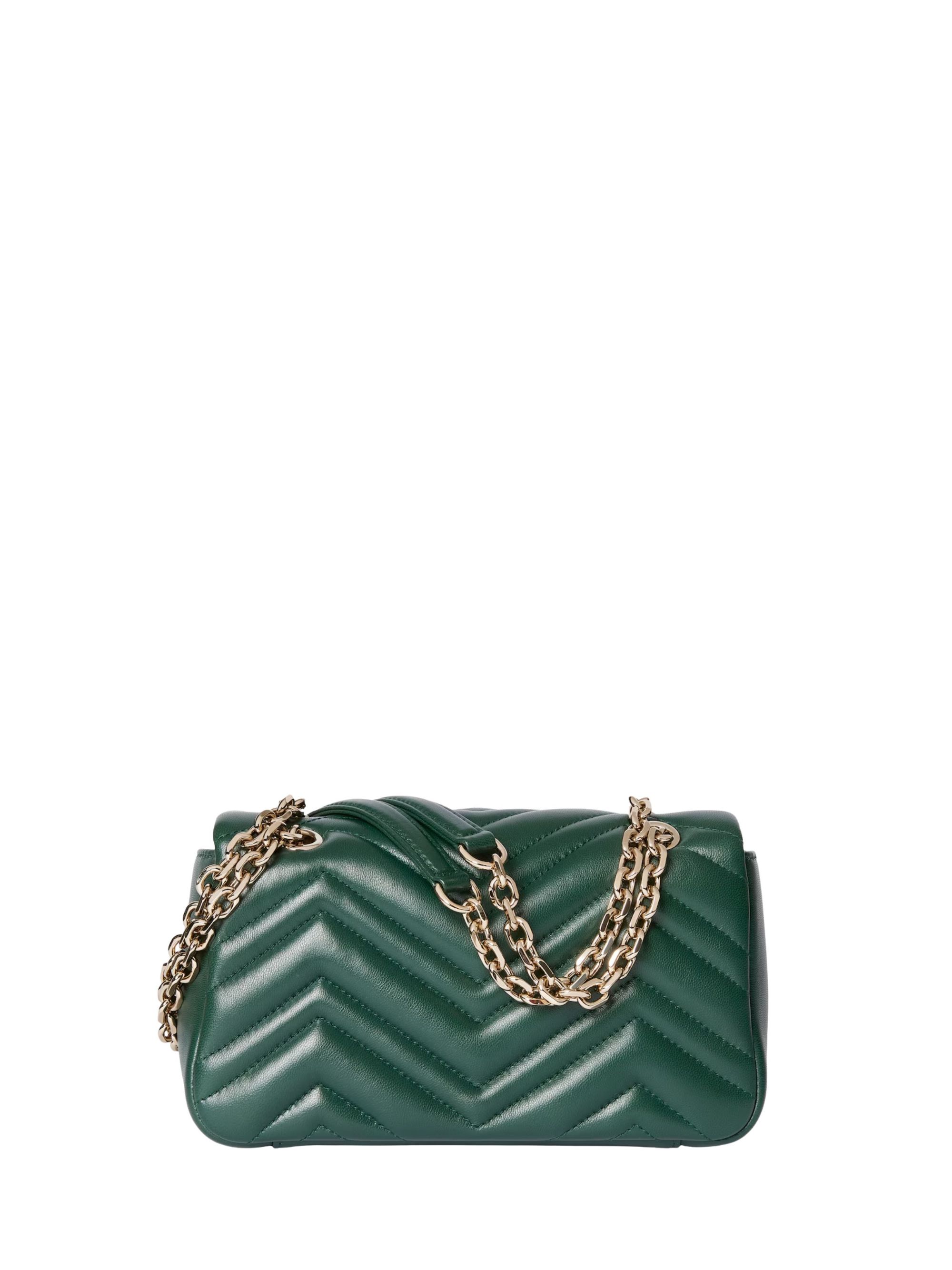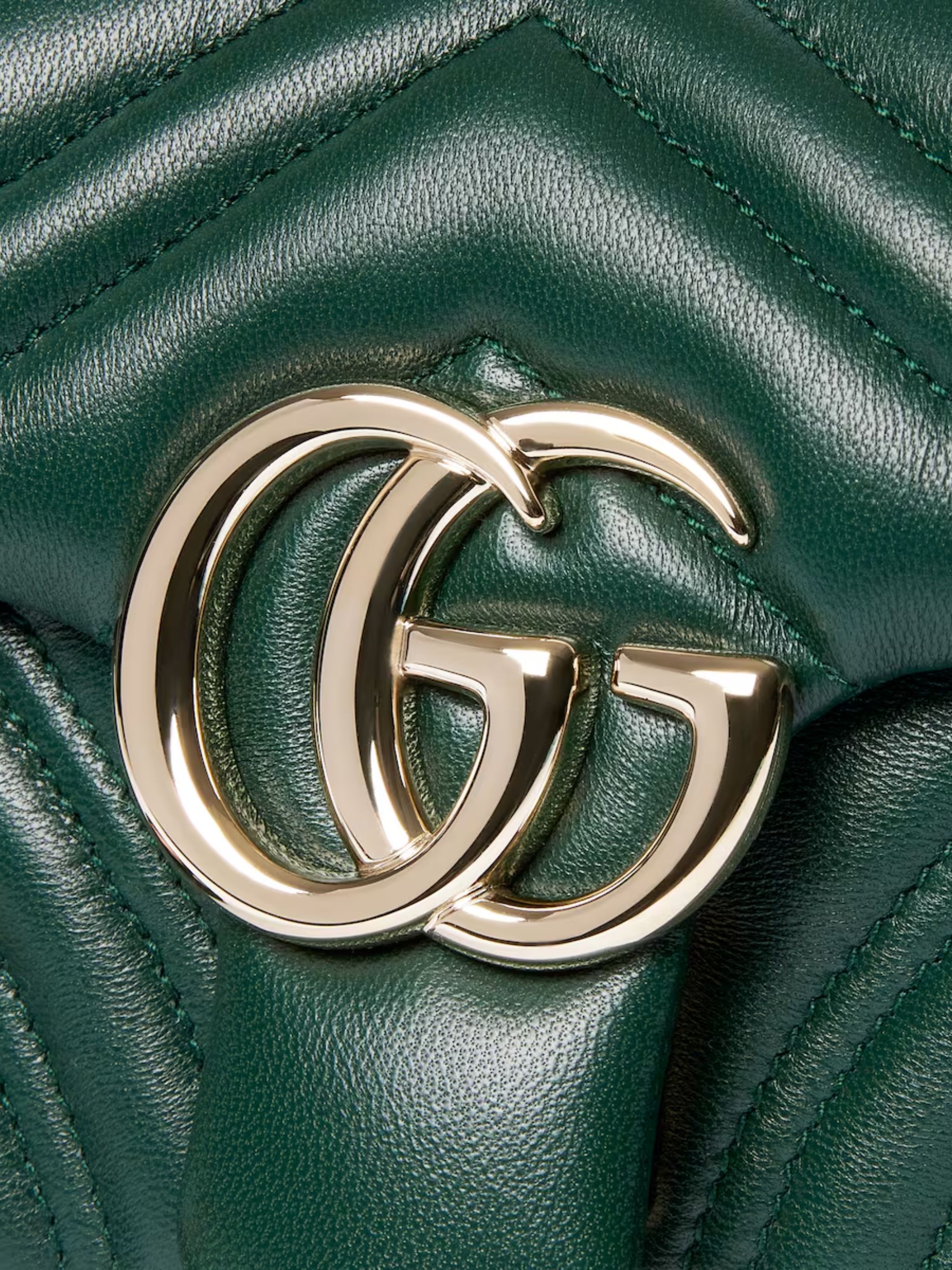 Borsa GG Marmont piccola di GUCCI verde in pelle con motivo chevron, caratterizzato da hardware oro, doppia G, tracolla a catena, pattina con chiusura a scatto e fodera in viscosa. Dimensioni: 22 x 12,5 x 6 CM.