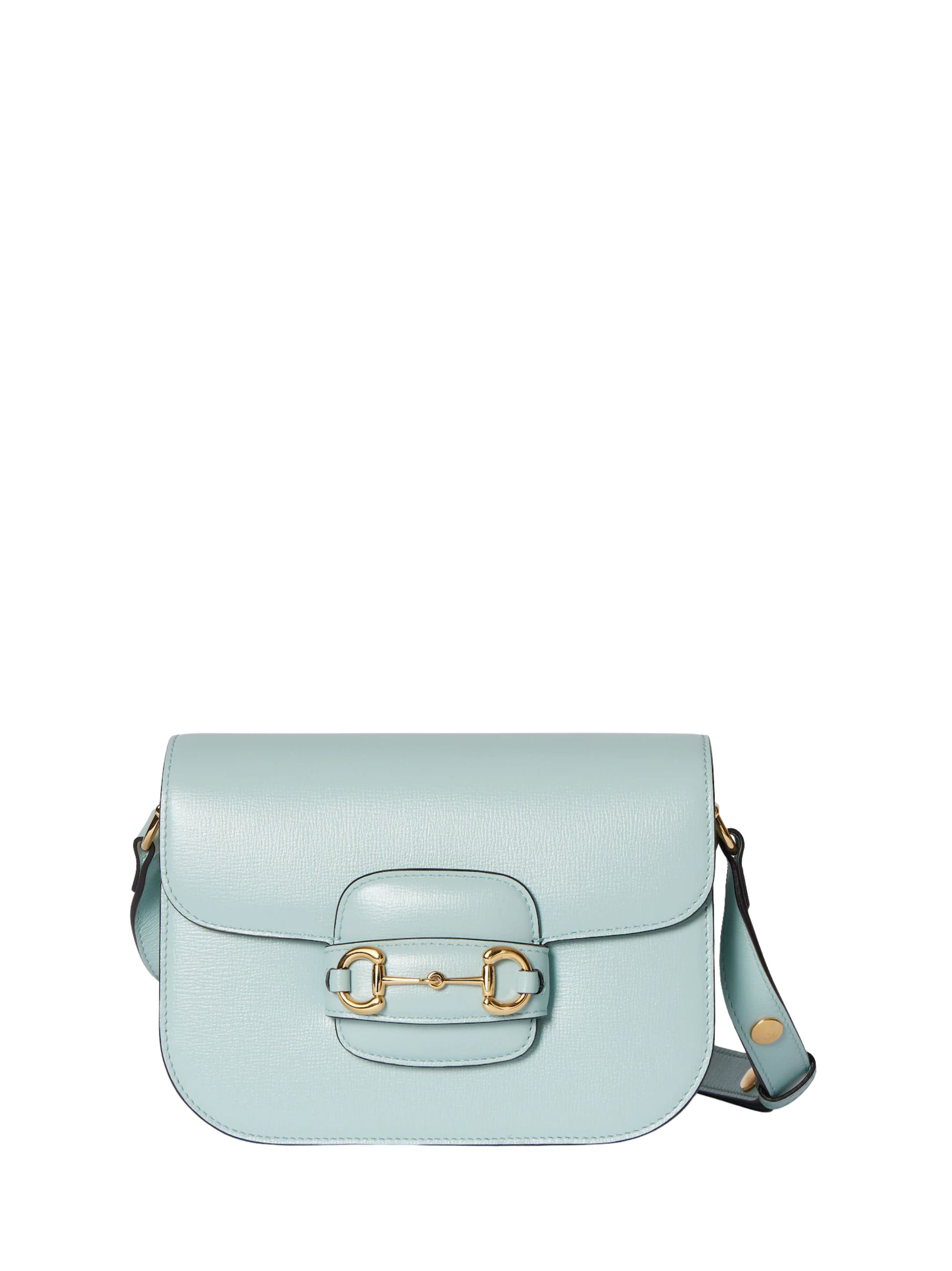 Borsa Horsebit 1955 piccola di GUCCI azzurra in pelle, caratterizzata da hardware oro, dettaglio morsetto sul davanti, dettaglio mezzo morsetto sui lati, tracolla regolabile e chiusura con pattina. Dimensioni: 20 x 14 x 7 CM.