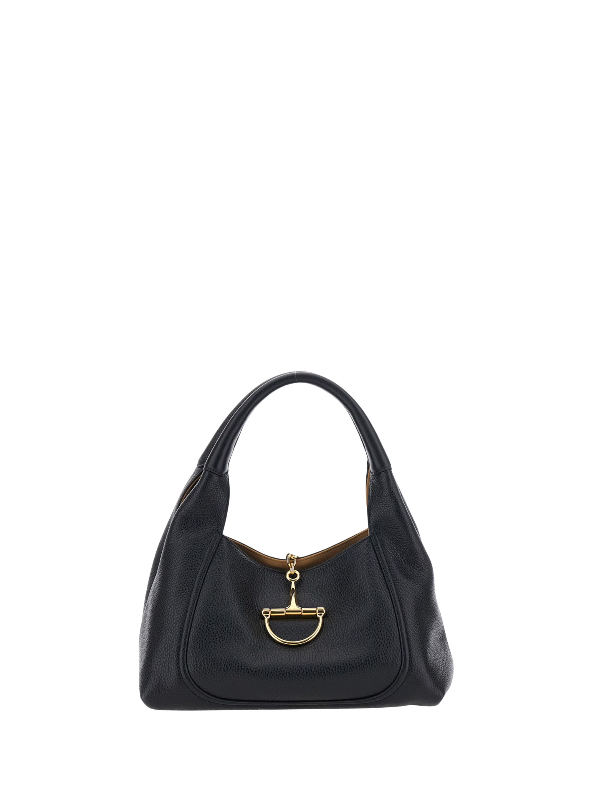 Borsa Horsebit di GUCCI nera in pelle martellata, caratterizzata da morsetto oro, hardware oro, manico singolo, fodera in microfibra marrone e pochette interna staccabile.