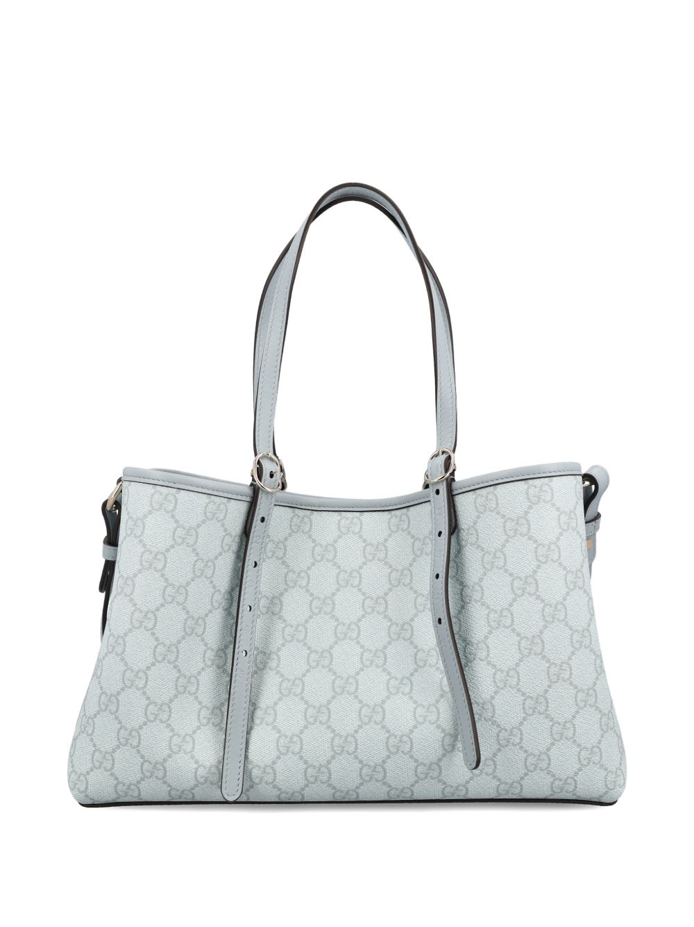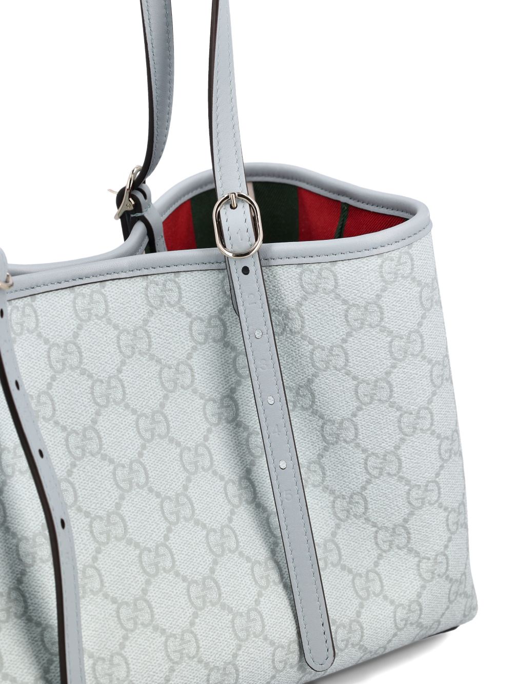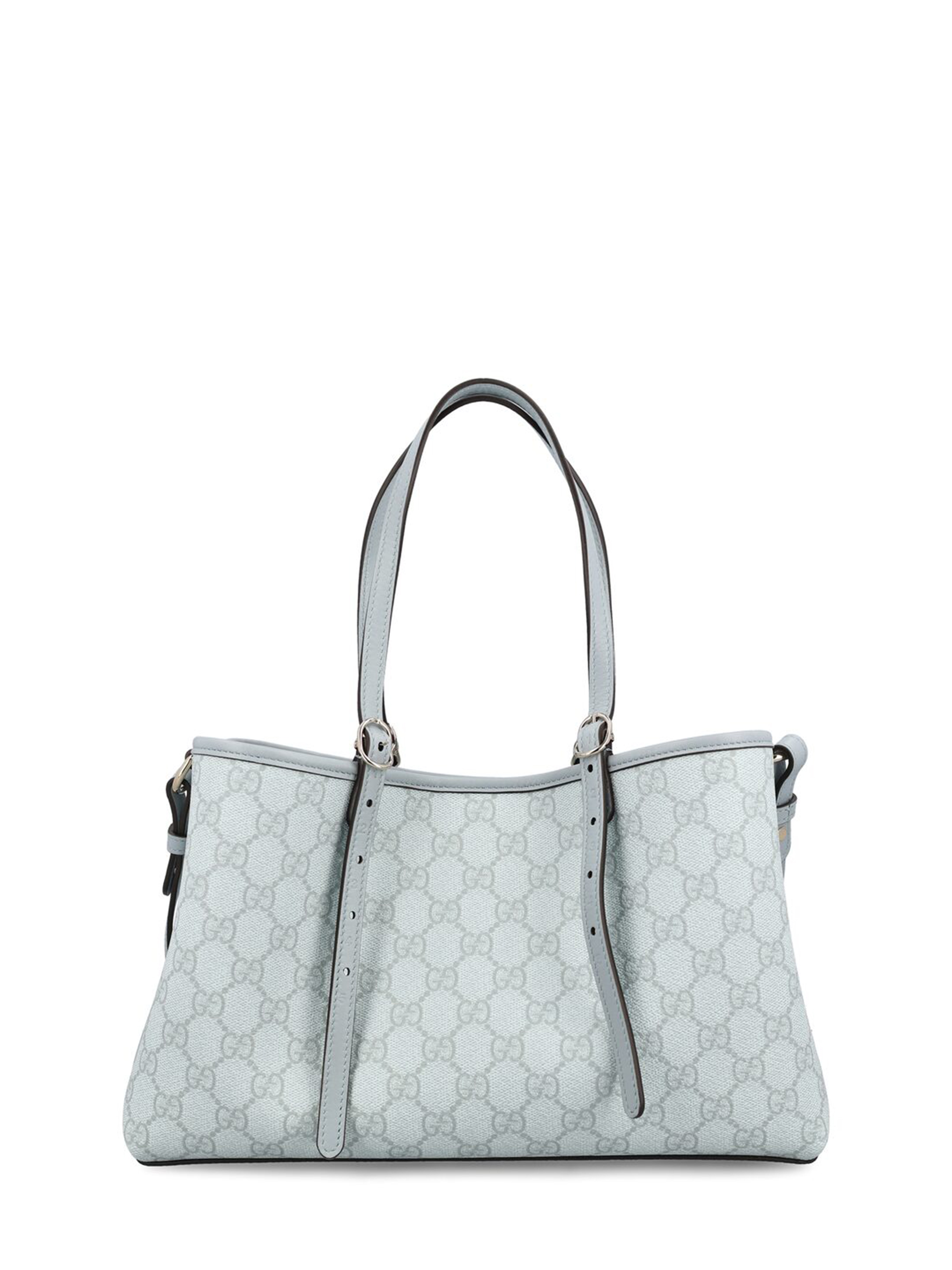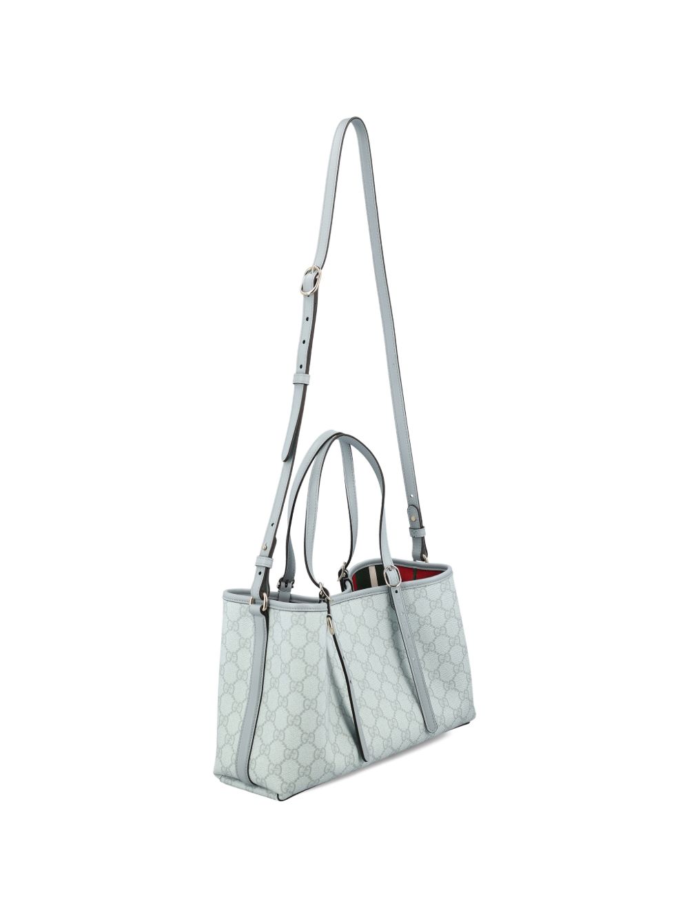 Borsa Tote GG Emblem di GUCCI azzurra in pelle, caratterizzata da motivo GG all-over, due manici regolabili, hardware oro e tracolla regolabile.