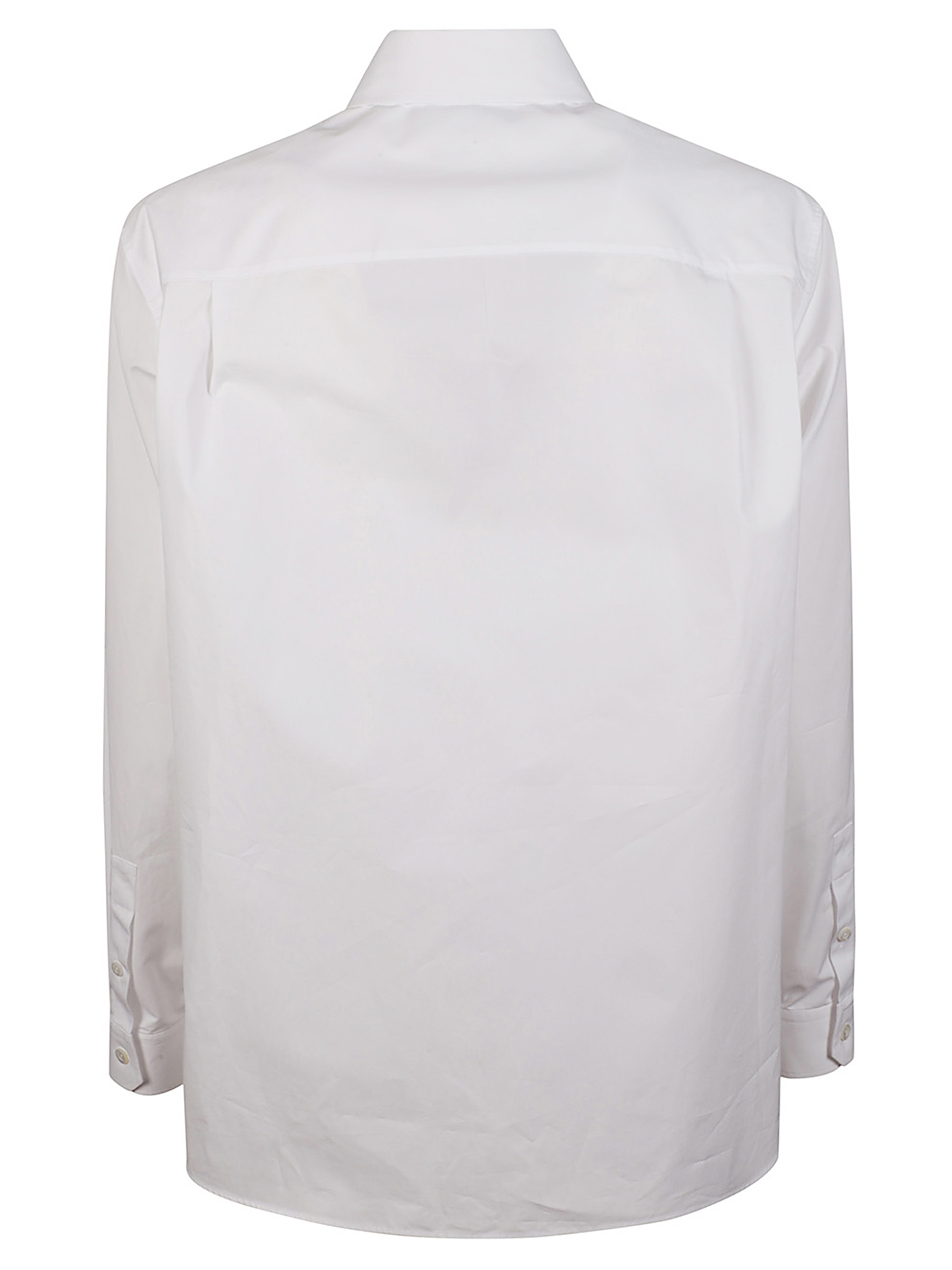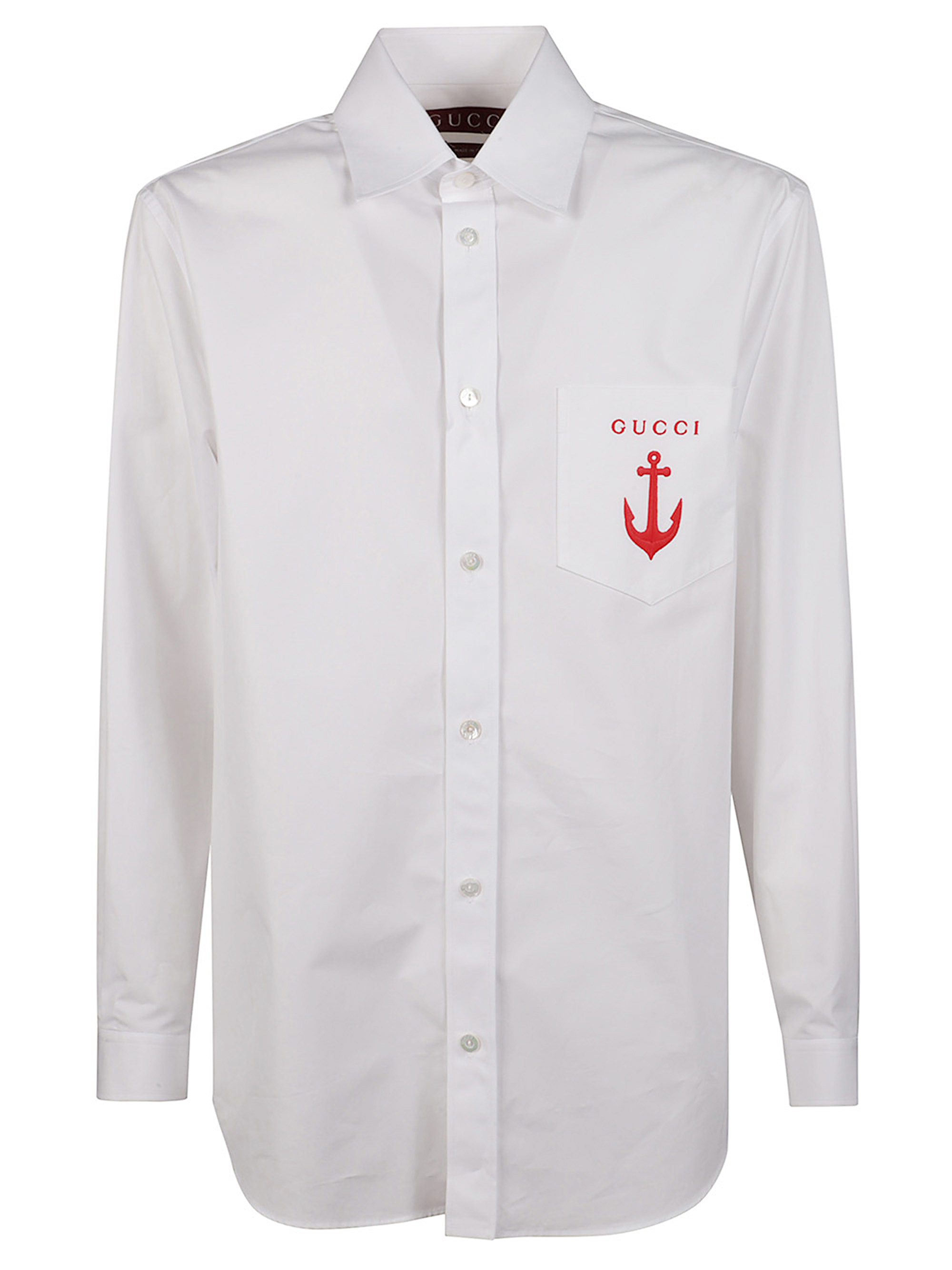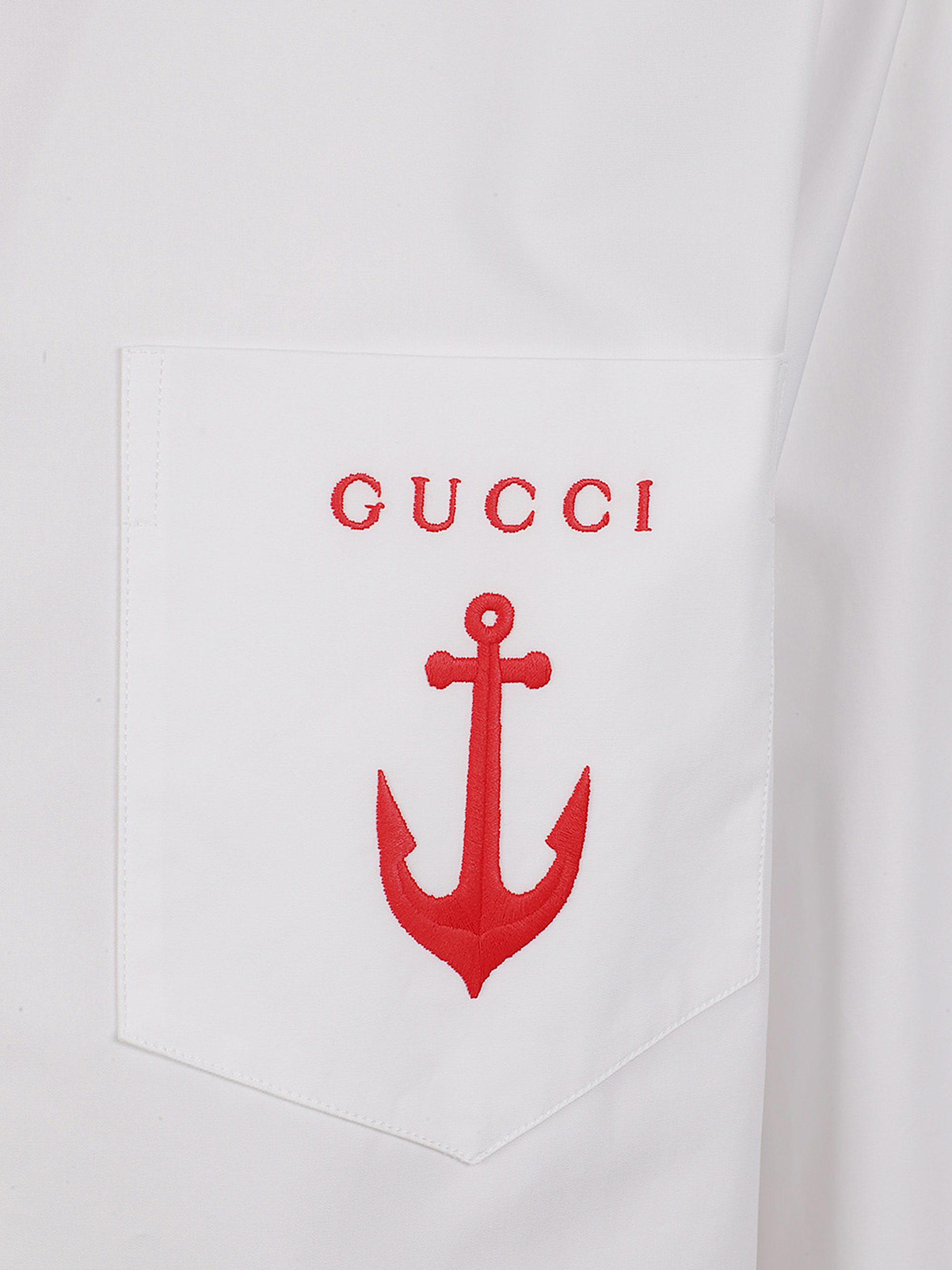 Camicia di GUCCI bianca in cotone con ricamo ancora, colletto a punta, tasca sul petto e chiusura frontale con bottoni.