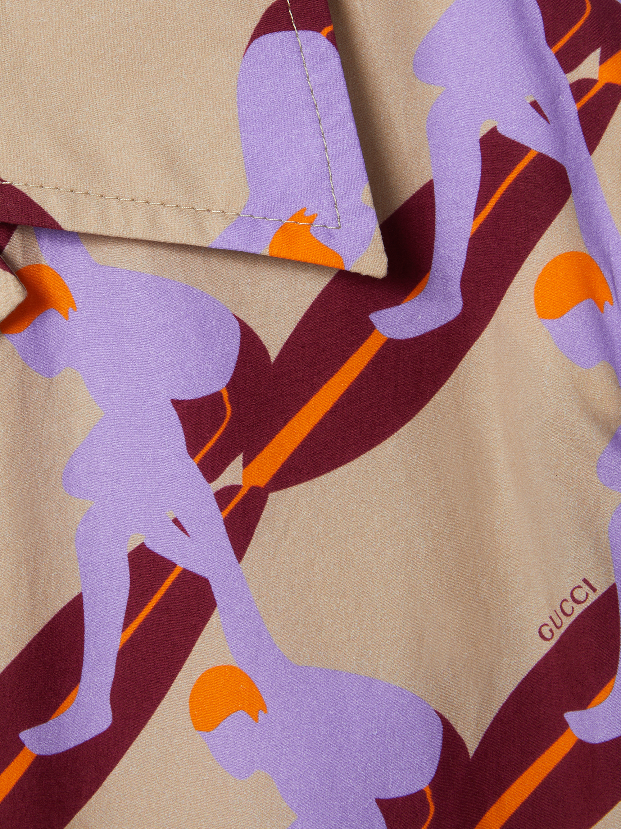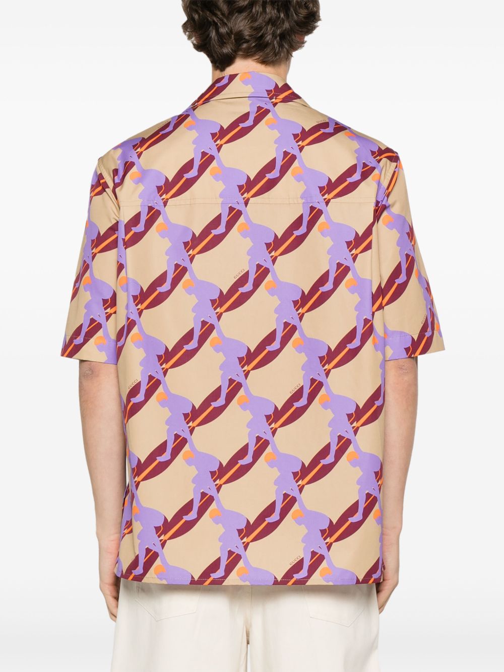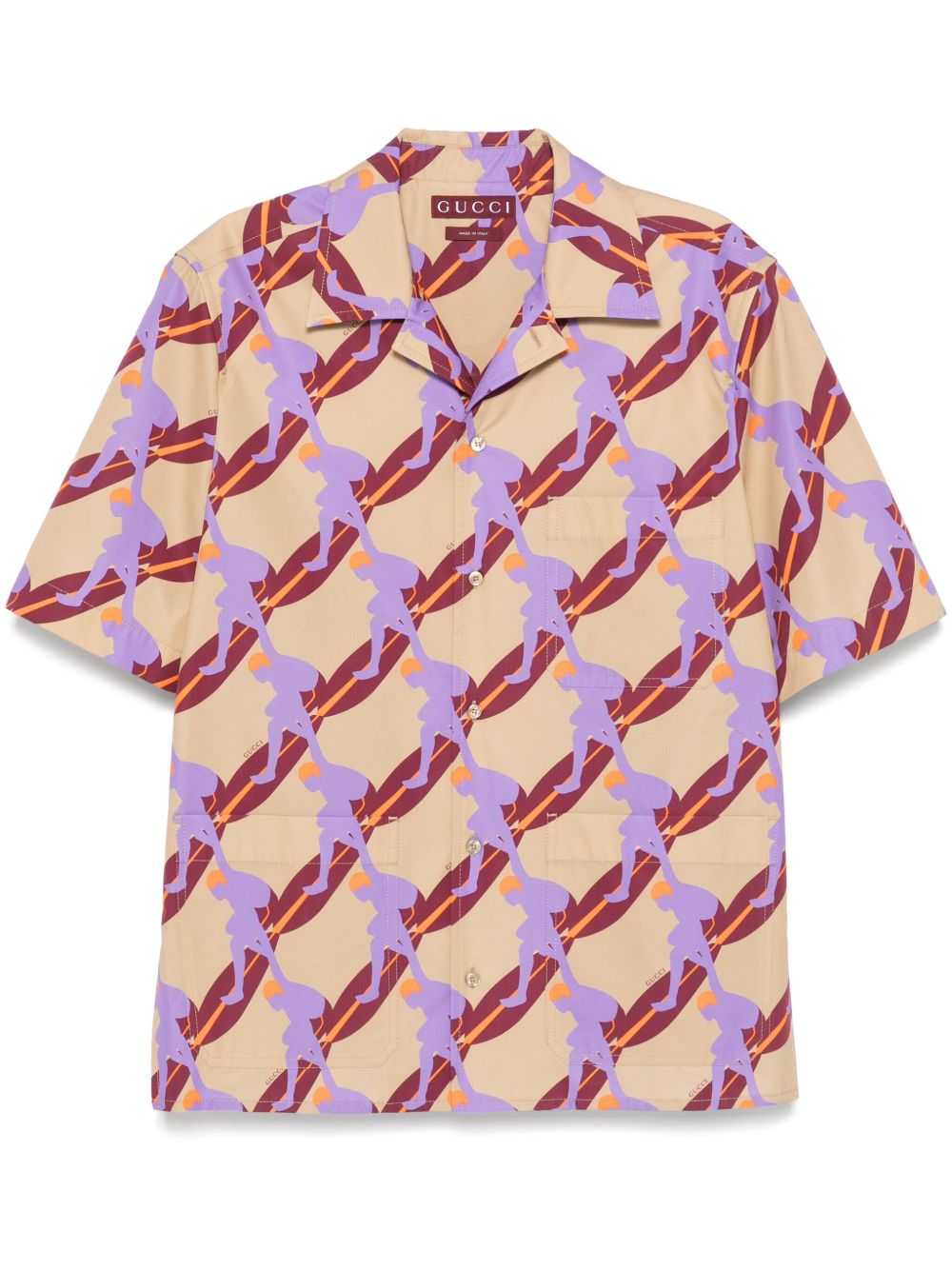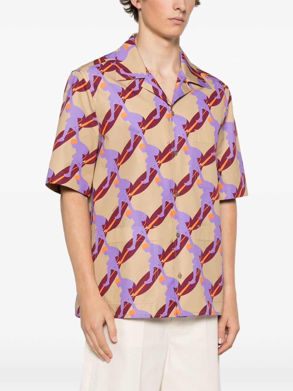 Camicia con stampa di GUCCI beige e multicolore in cotone con stampa surfista all-over, colletto a lancia, maniche corte, tasca sul petto, due tasche frontali, effetto pieghettato e chiusura con bottoni.