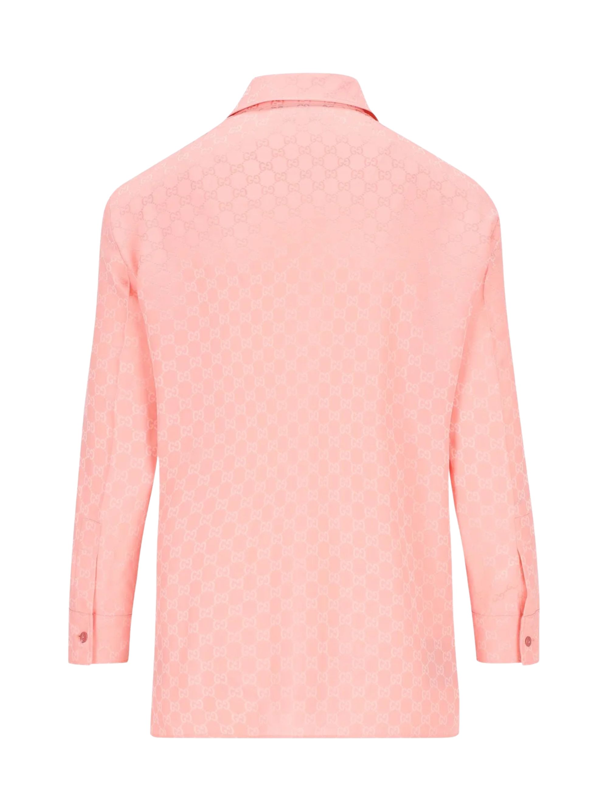Camicia GG di GUCCI rosa in seta jacquard con colletto a punta lunga, polsini con bottone e chiusura con bottoni.