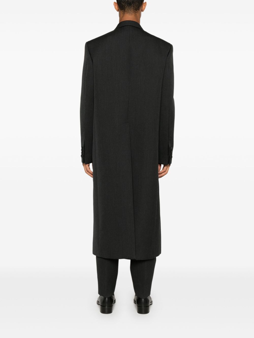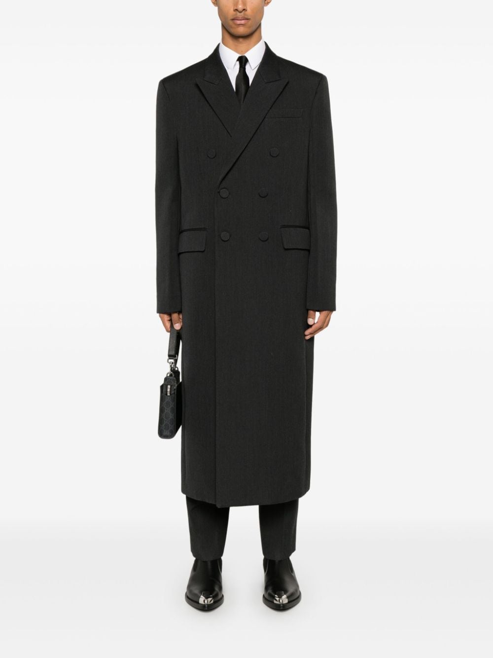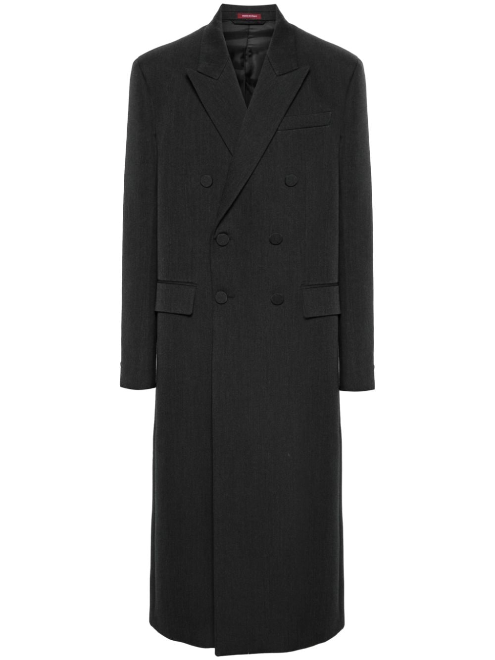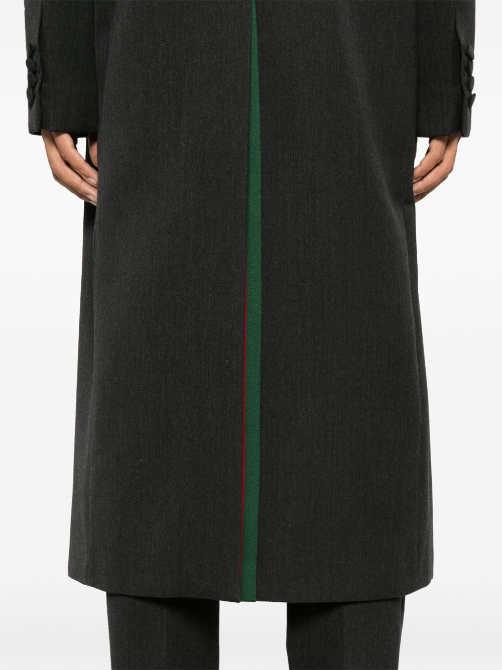 Cappotto Ancora di GUCCI grigio antracite in lana con ricamo con revers a punta, spalline, tasche a filetto sul petto, tasche frontali con pattina, spacco centrale sul retro, caratteristico bordo con righe Web, fodera integrale e chiusura con bottoni rive