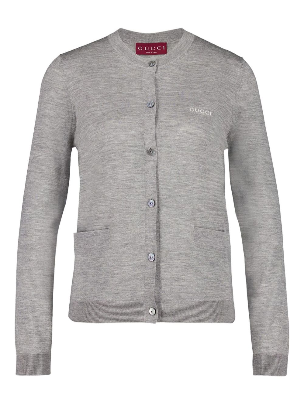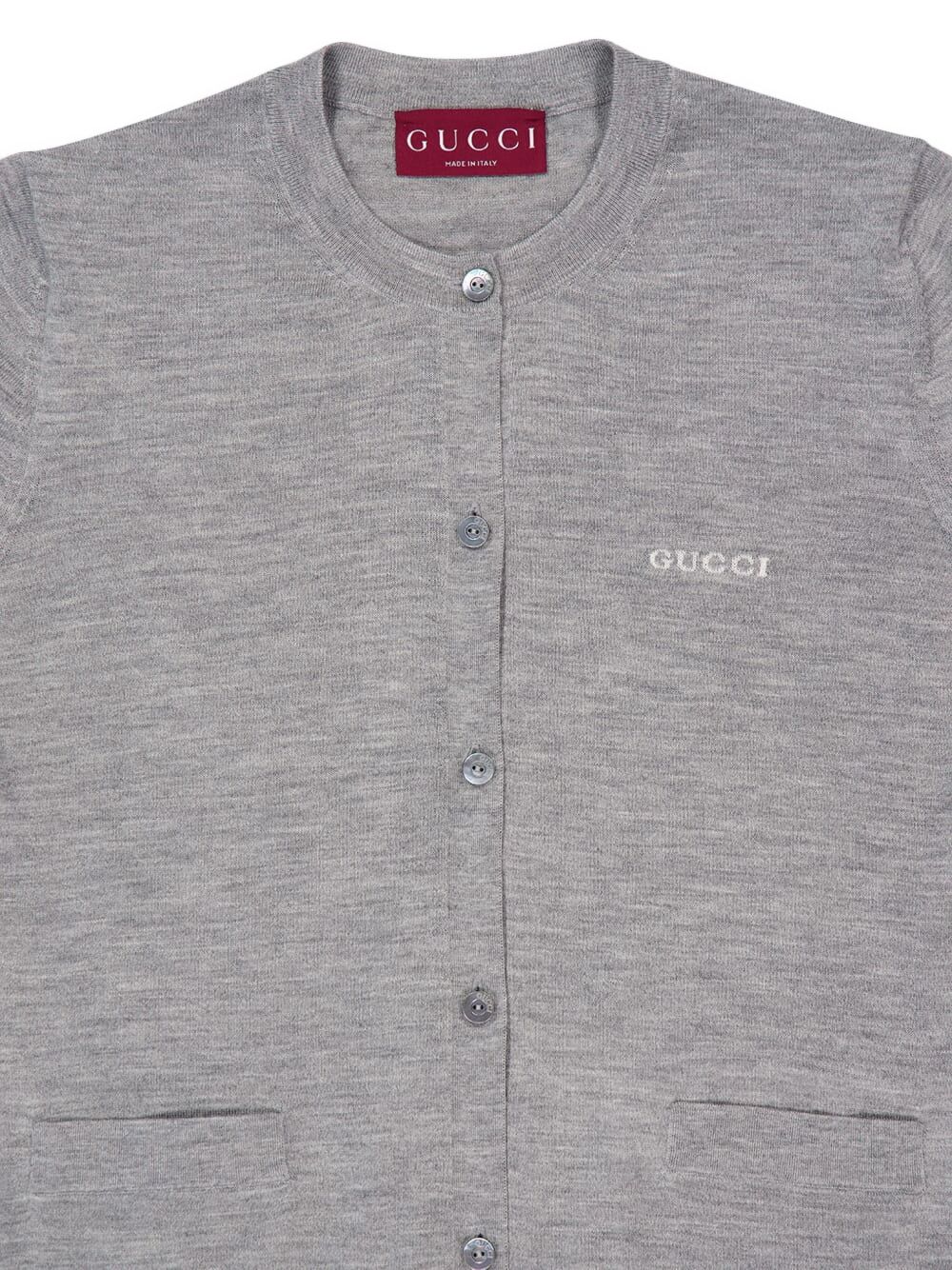 Cardigan grigio di GUCCI caratterizzato da logo sul petto, maniche lunghe e chiusura a bottoni.