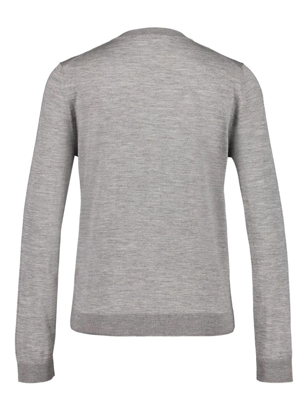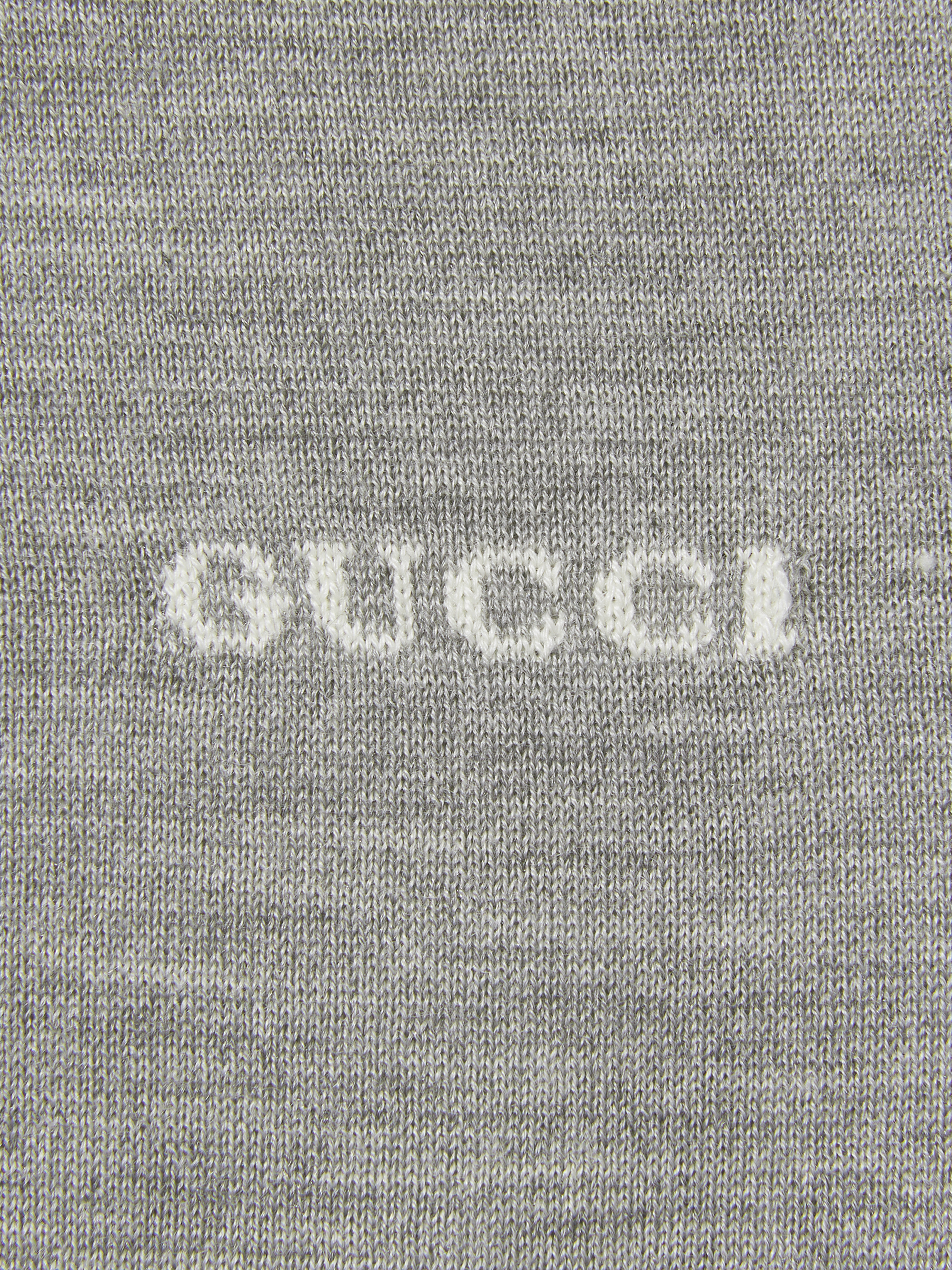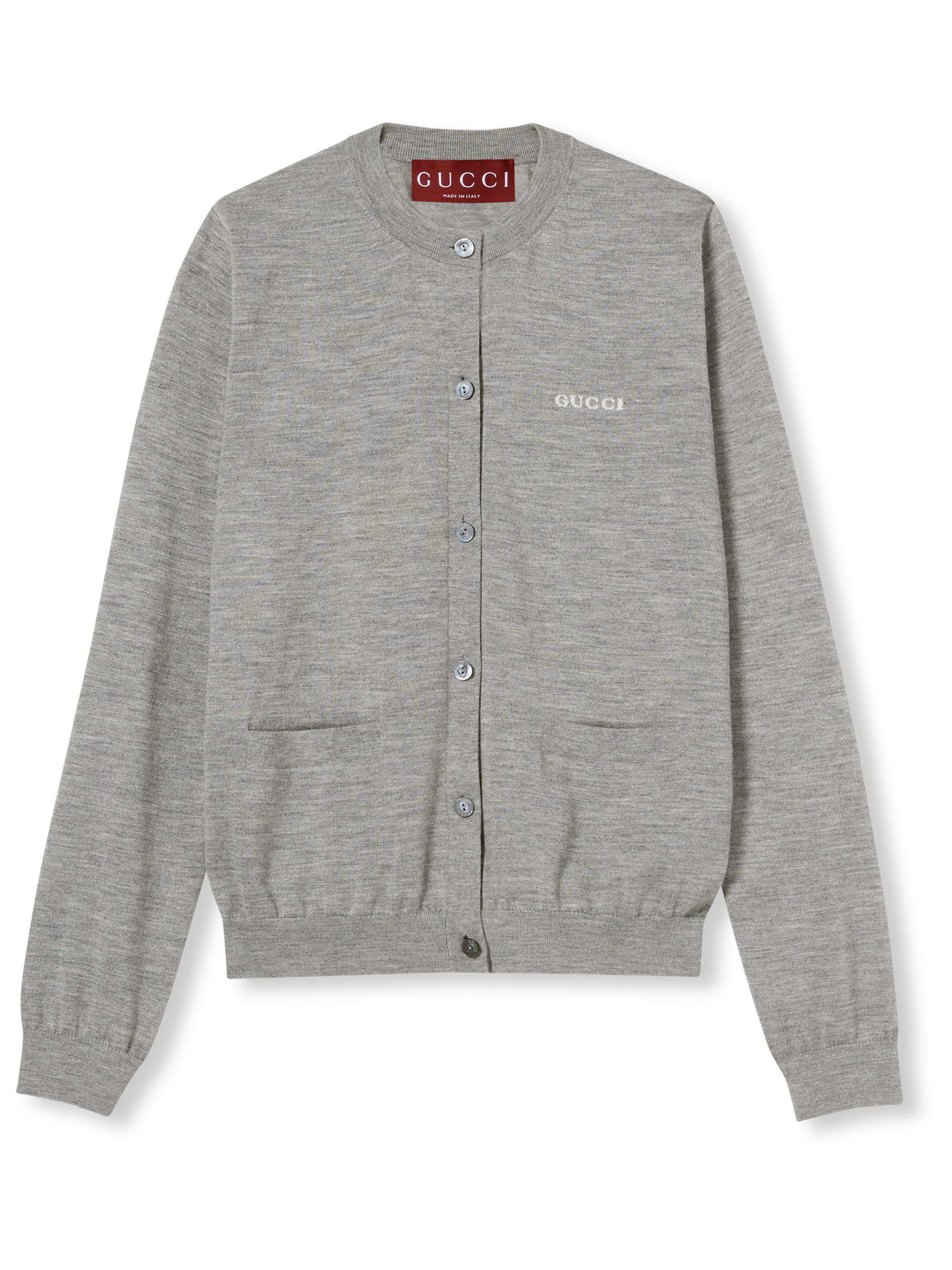 Cardigan in cashmere e seta di GUCCI grigio mélange a girocollo con intarsio Gucci, tasche frontali e chiusura con bottoni.