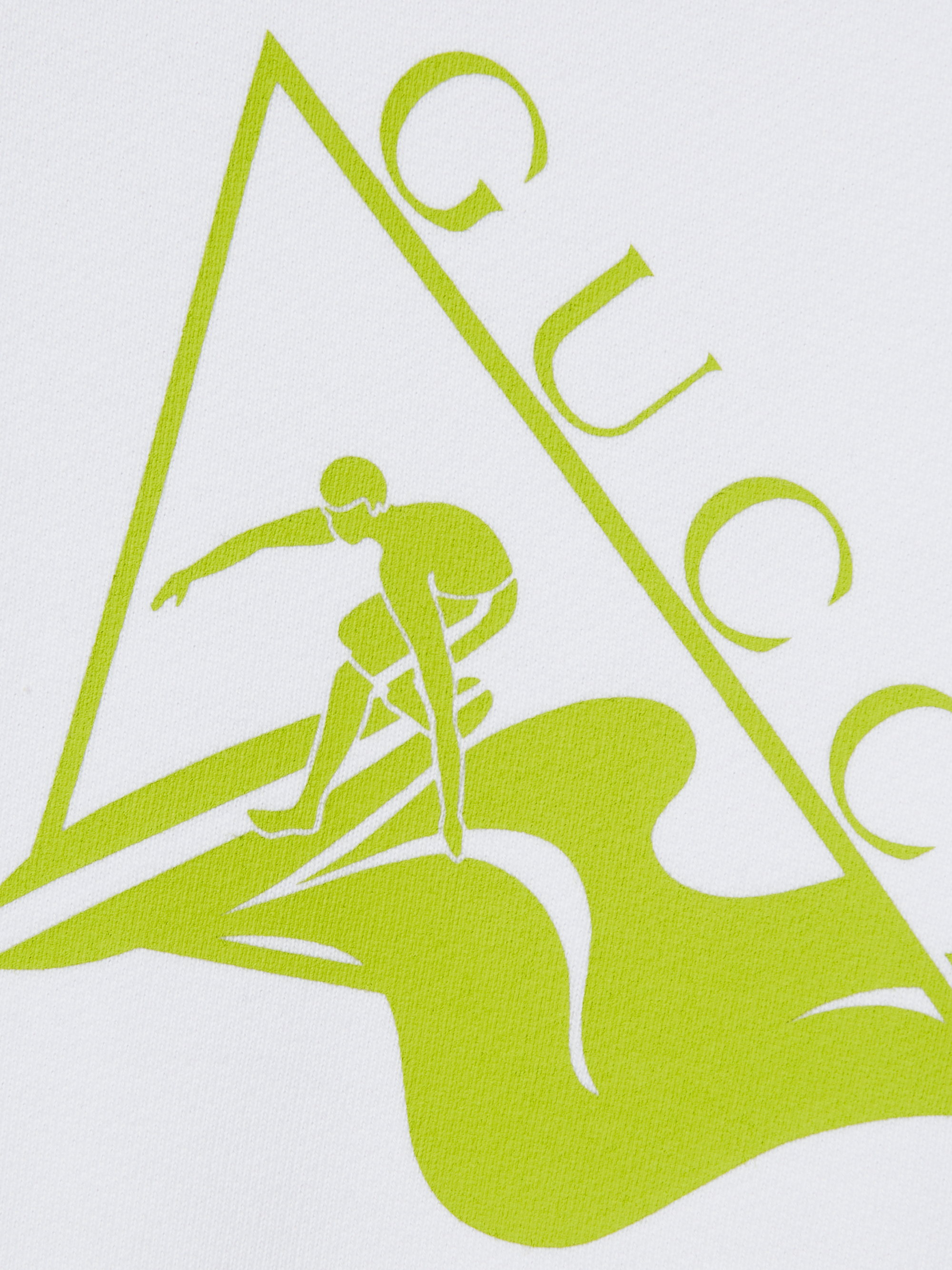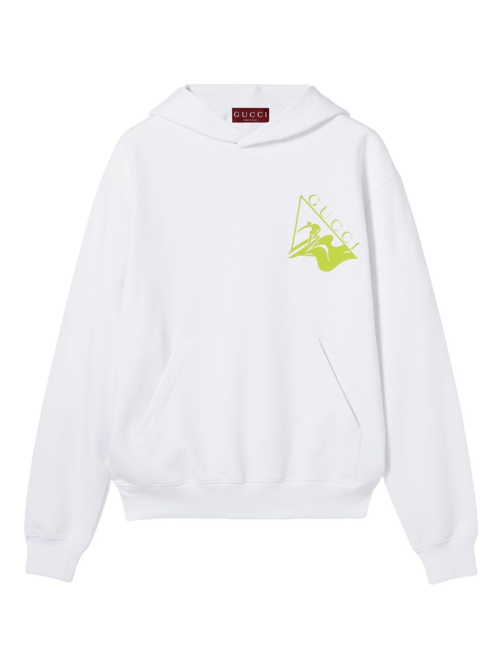 Felpa con cappuccio in cotone jersey di GUCCI bianca con stampa sul davanti e sul retro, tasca a marsupio e finiture a coste.