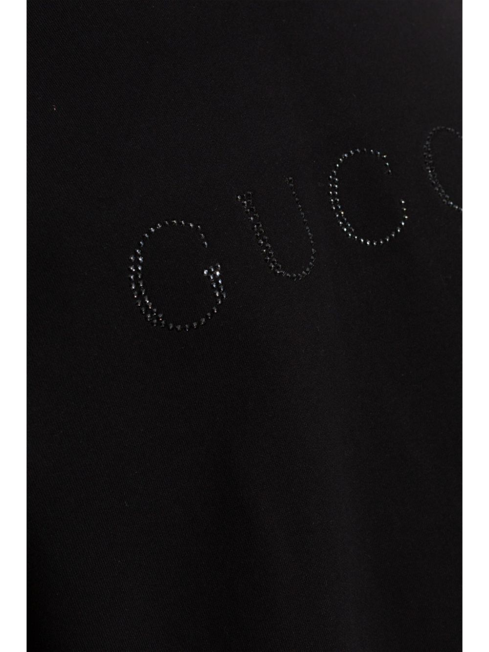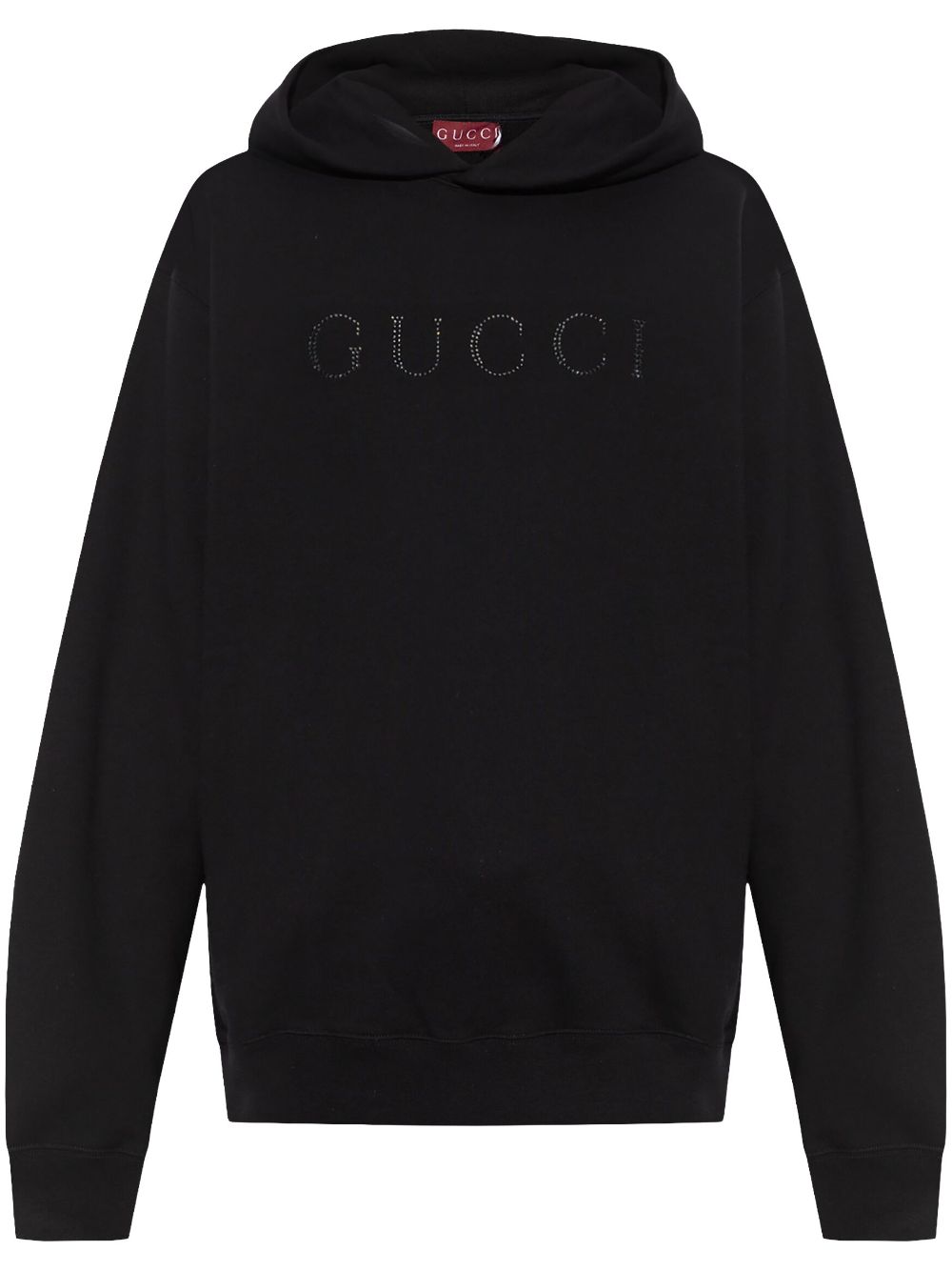 Felpa nera GUCCI caratterizzata da logo ricamato con cristalli, maniche lunghe e cappuccio.