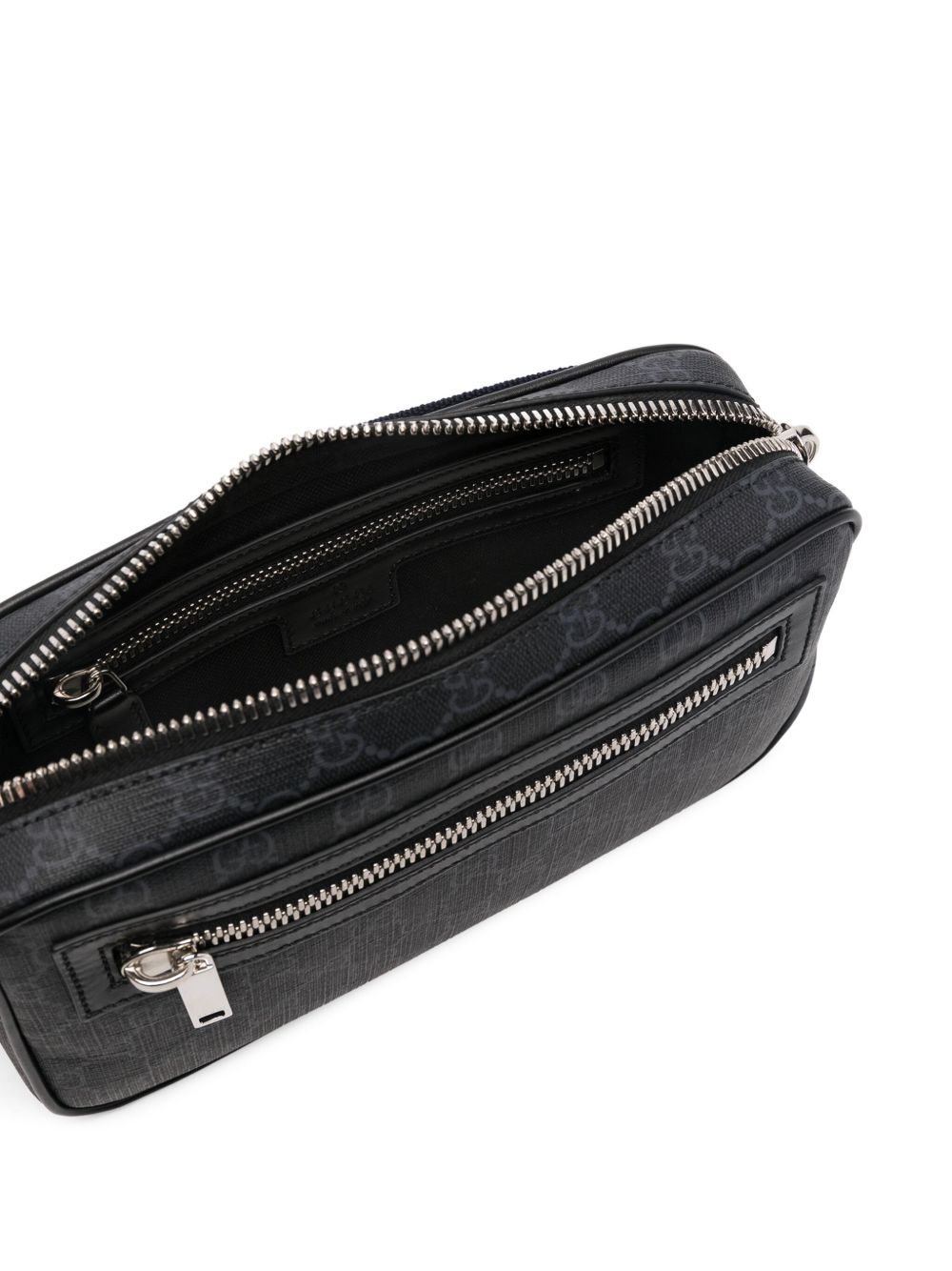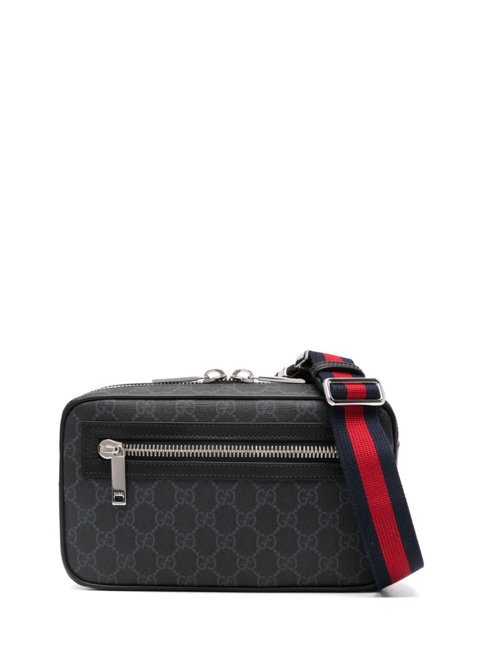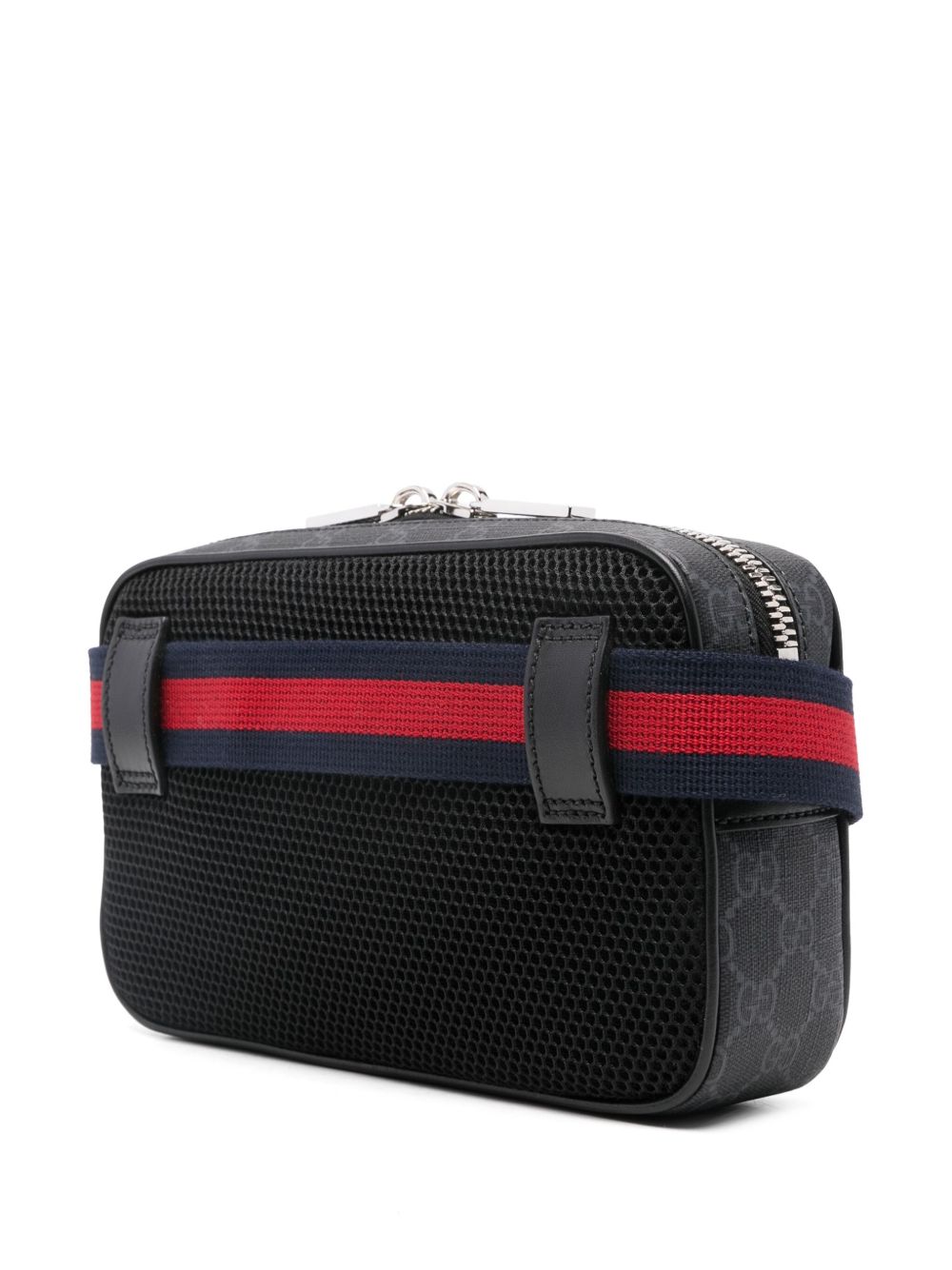 Marsupio nero di GUCCI caratterizzato da rivestimento in microfibra, logo allover, rifiniture in pelle, tasca con zip frontale e cintura con motivo Web regolabile.