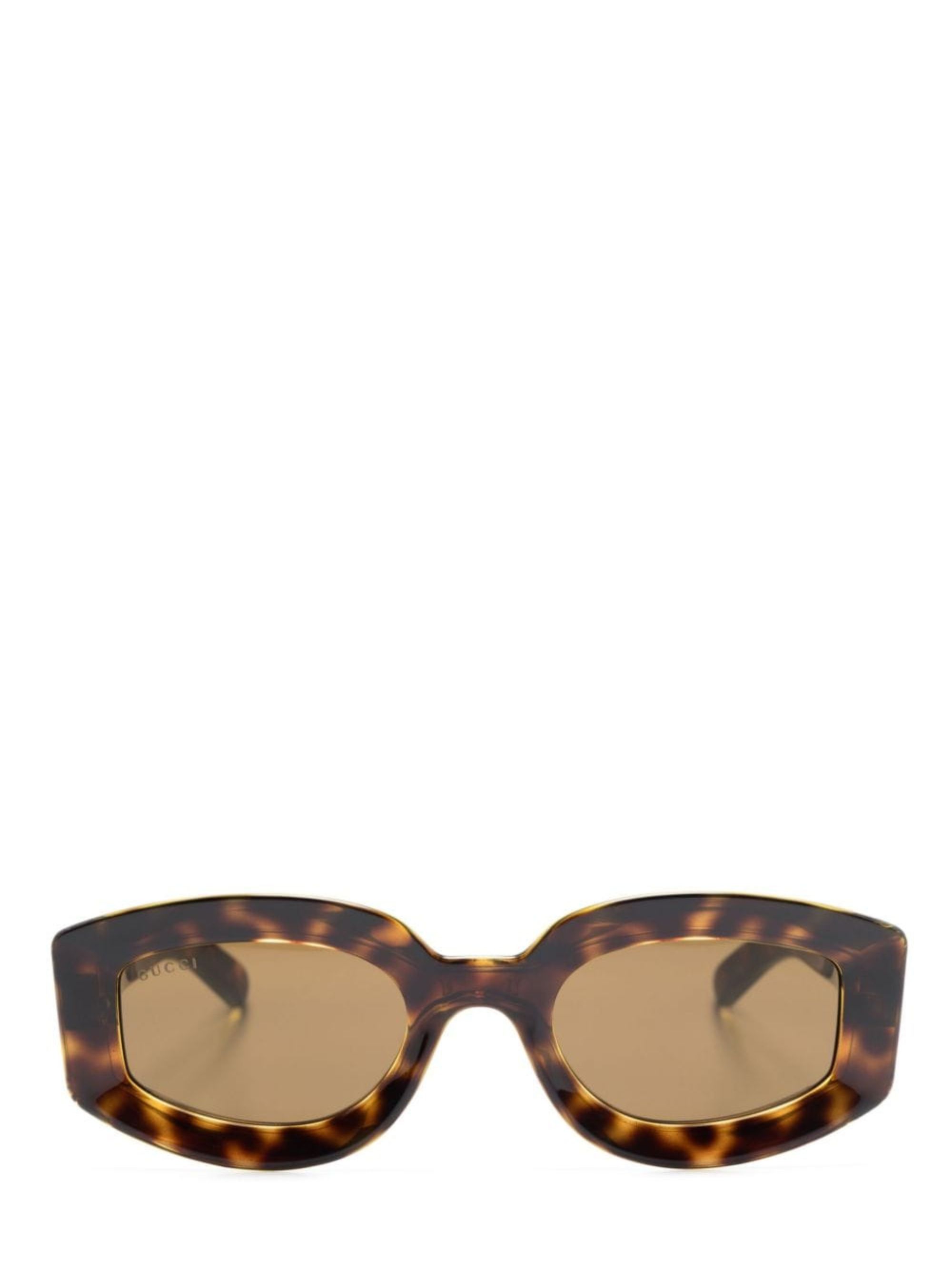 Occhiali da sole con logo di GUCCI marrone Havana con effetto tartarugato, montatura geometrica, lenti marroni con protezione UV e asta con logo con punta curva.