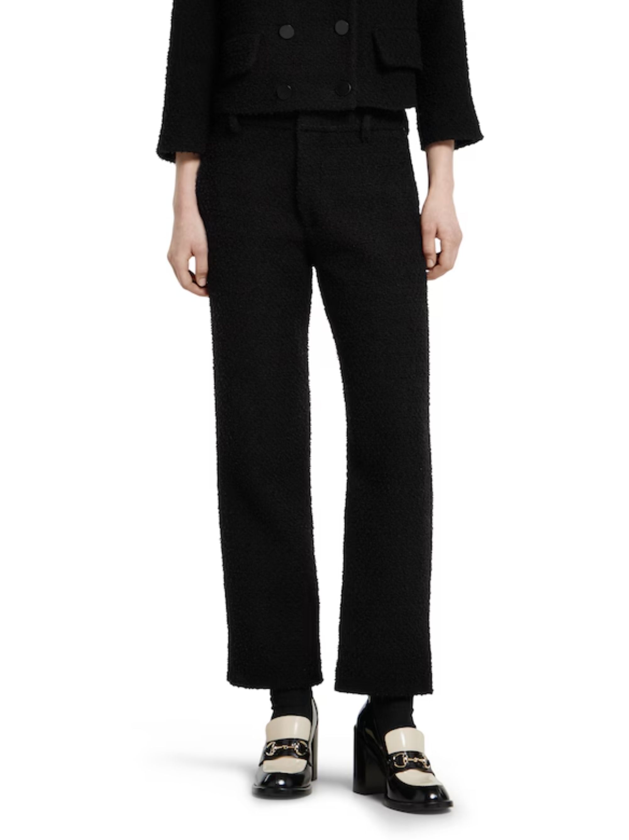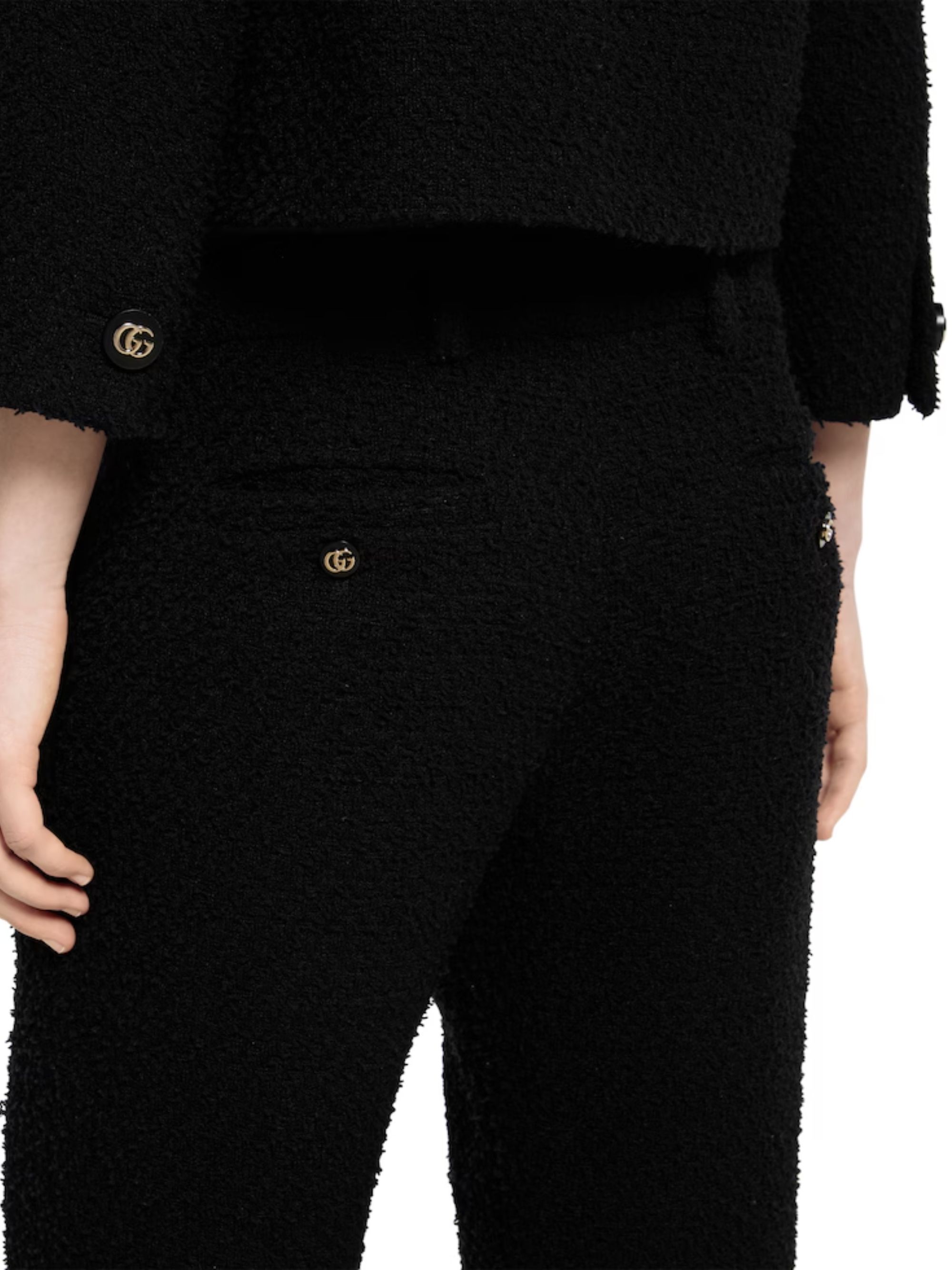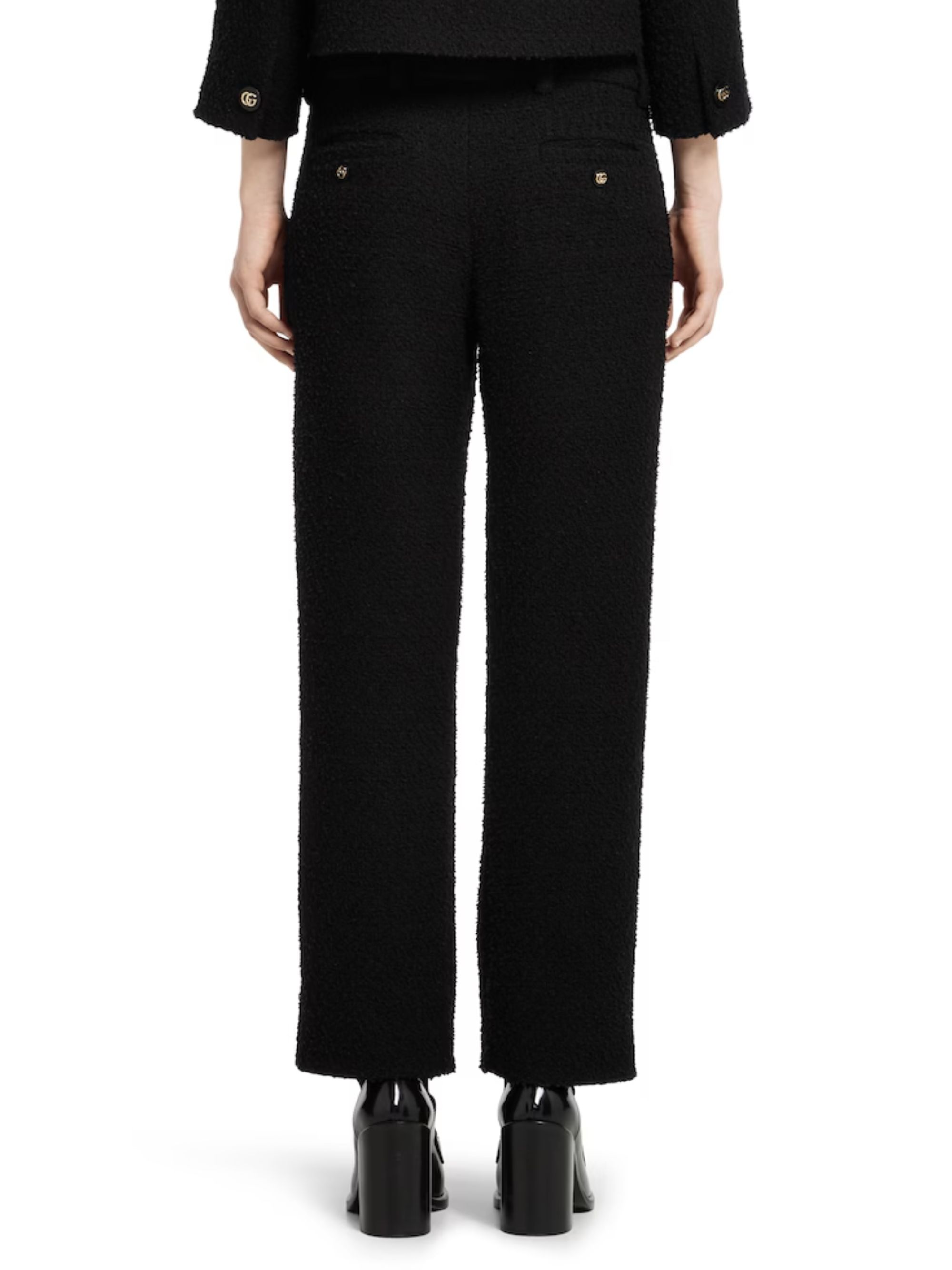 Pantalone alla caviglia di GUCCI nero in lana bouclé con passanti per la cintura, tasche laterali e posteriori e chiusura con listino con gancio e cerniera.