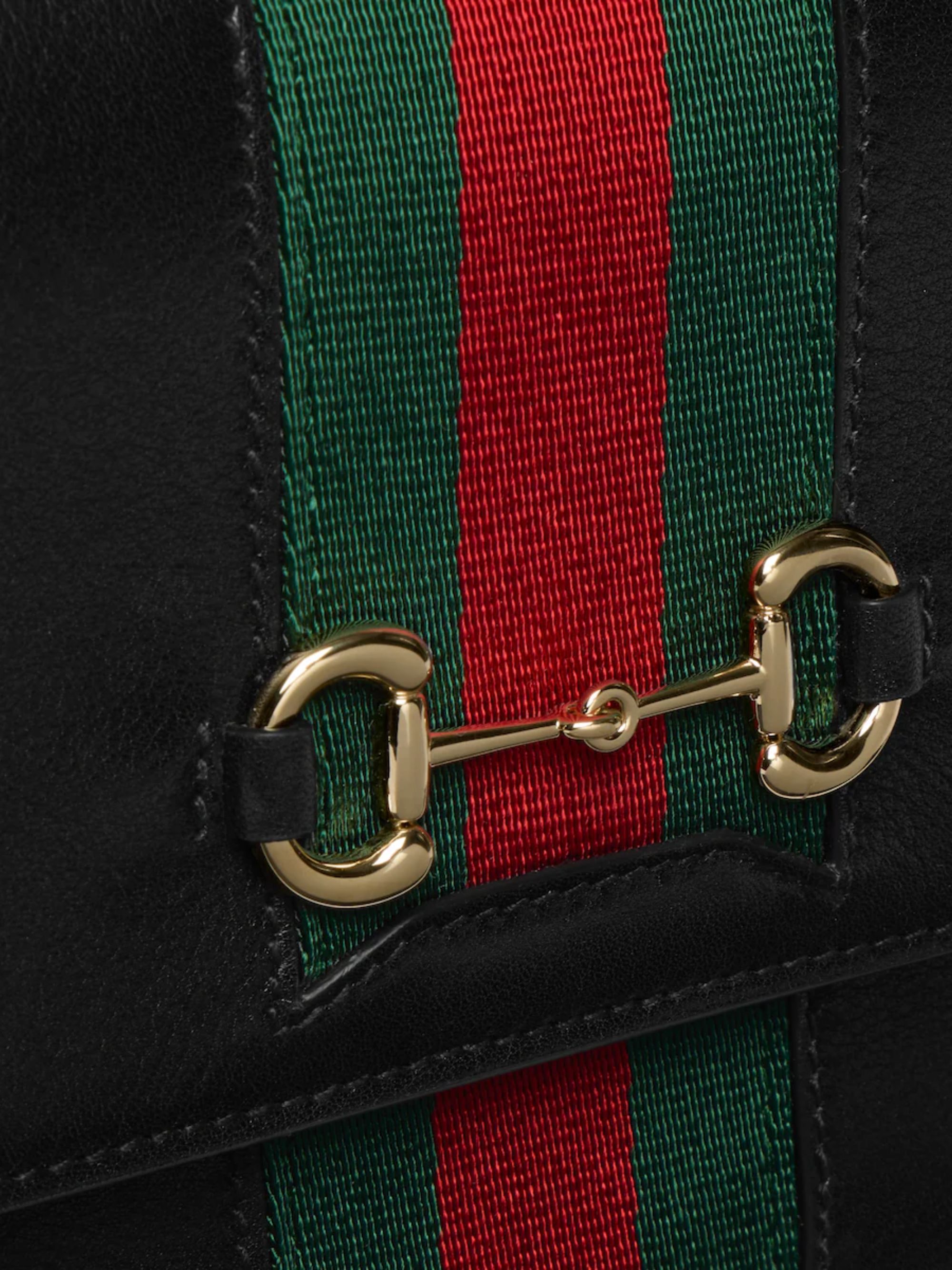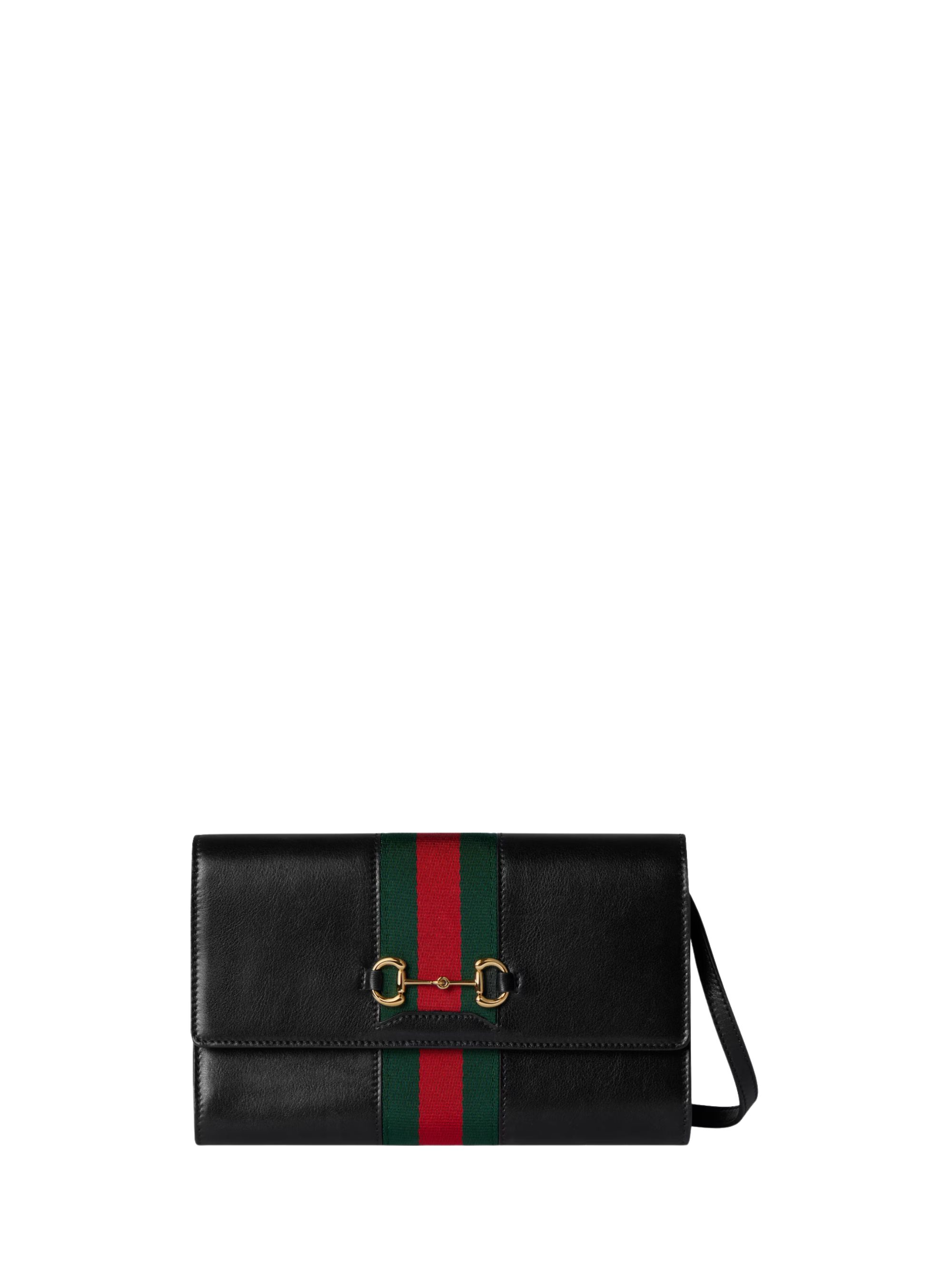 Portafoglio Gucci Horsebit Web di GUCCI nero in pelle, caratterizzato da finiture oro, morsetto, dettaglio Web, logo, cinturino in pelle regolabime e rimovibile e pattina con chiusura a bottone automatico. Dimensioni: 21 x 12,5 x 4 CM.
