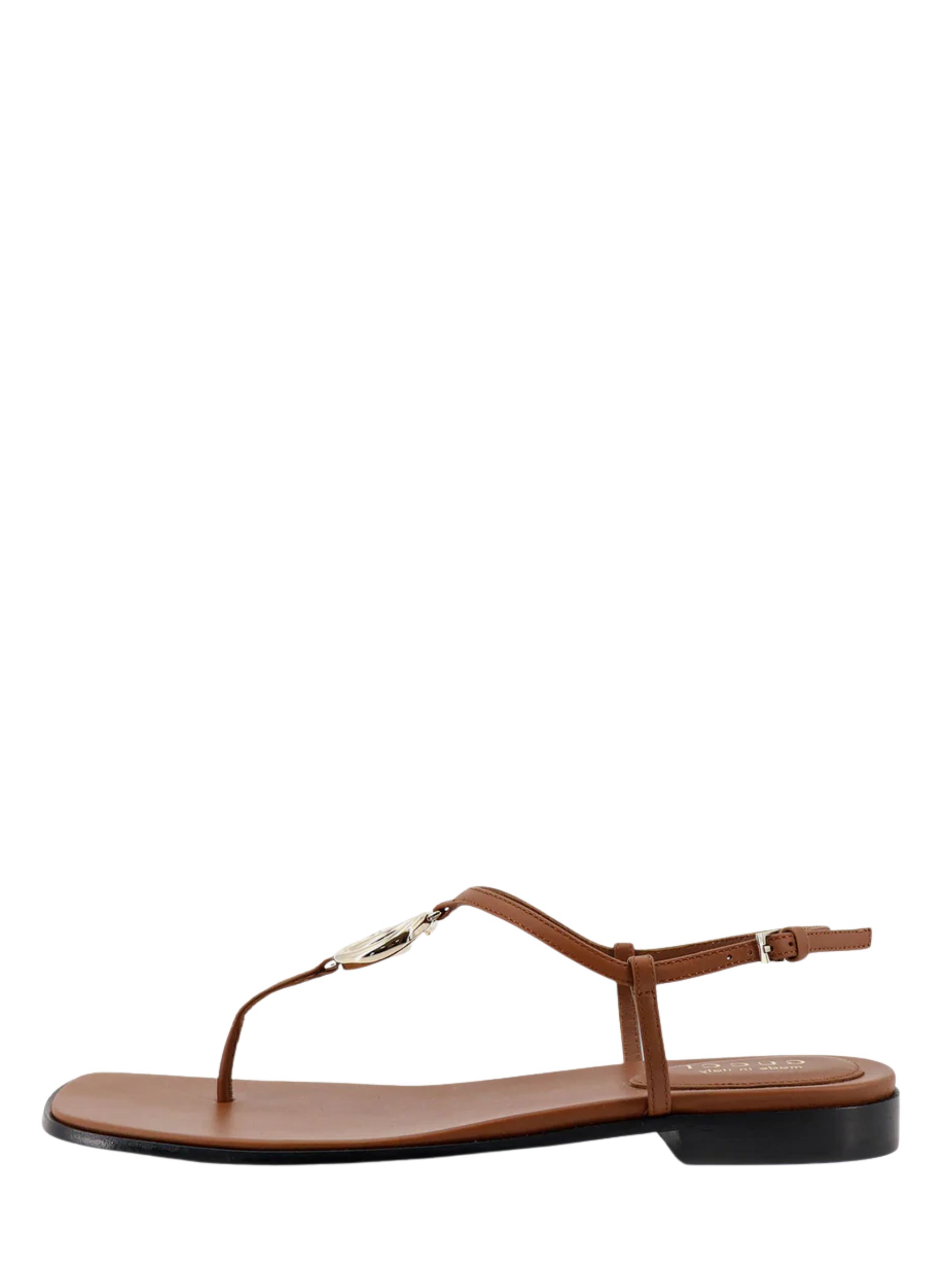 Sandalo Lifford di GUCCI marrone in pelle, caratterizzato da punta squadrata, logo GG, chiusura regolabile con cinturino e suola in pelle.