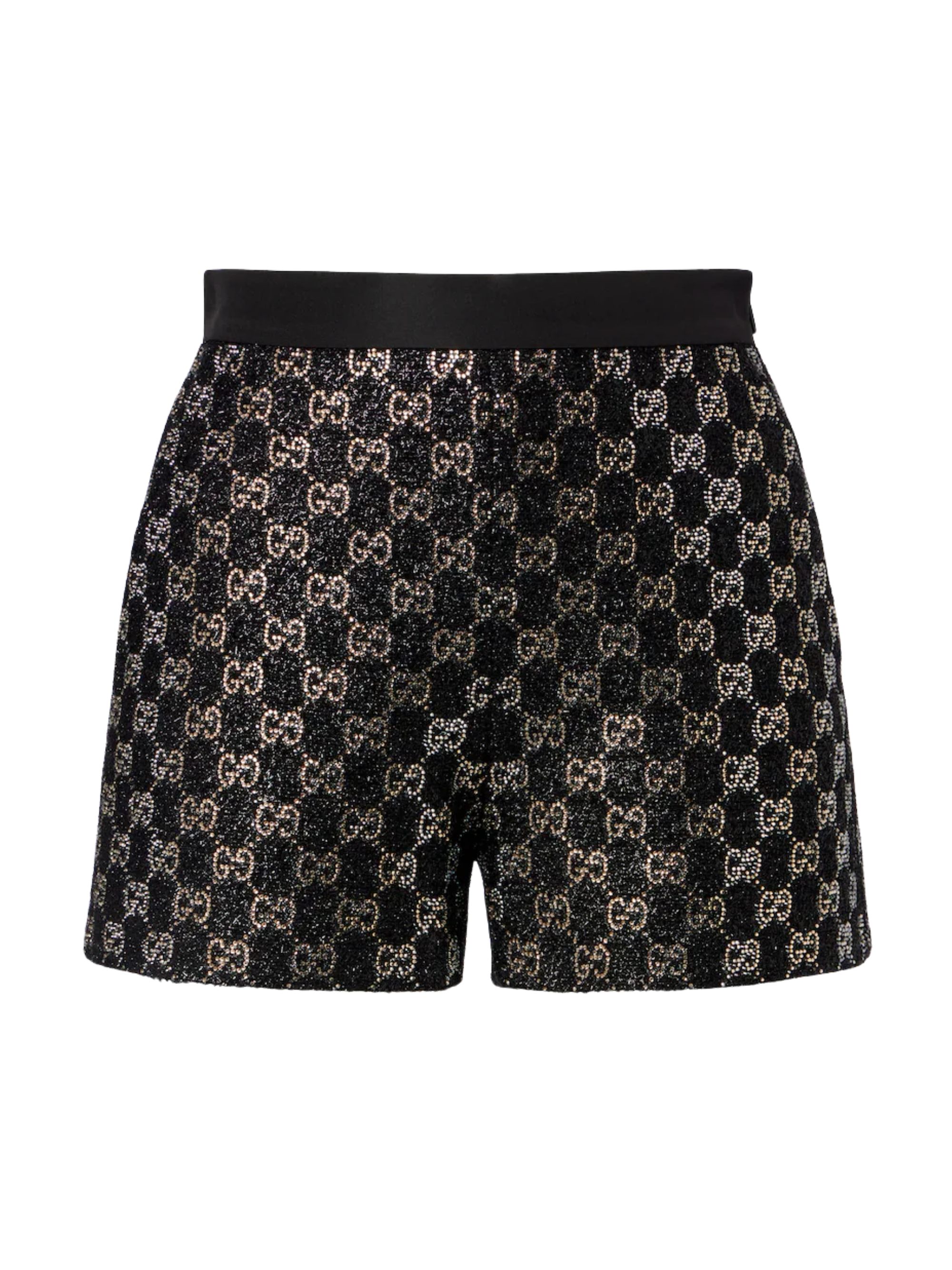 Shorts in tweed di lana lamé di GUCCI neri in acetato e viscosa, caratterizzati das ricamo GG con cristalli all-over, due tasche laterali e modello foderato.