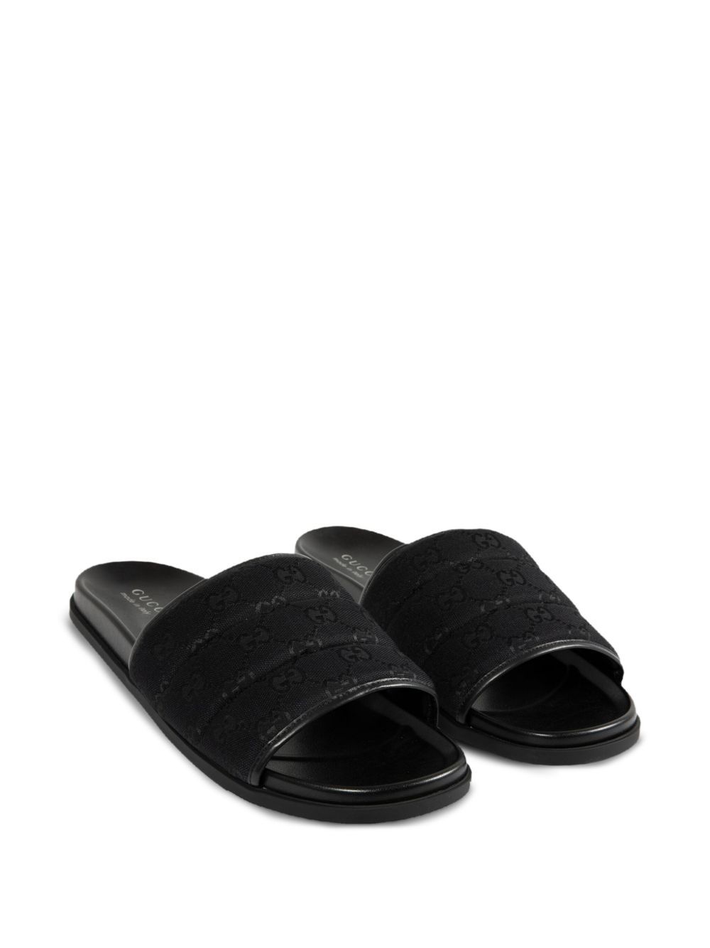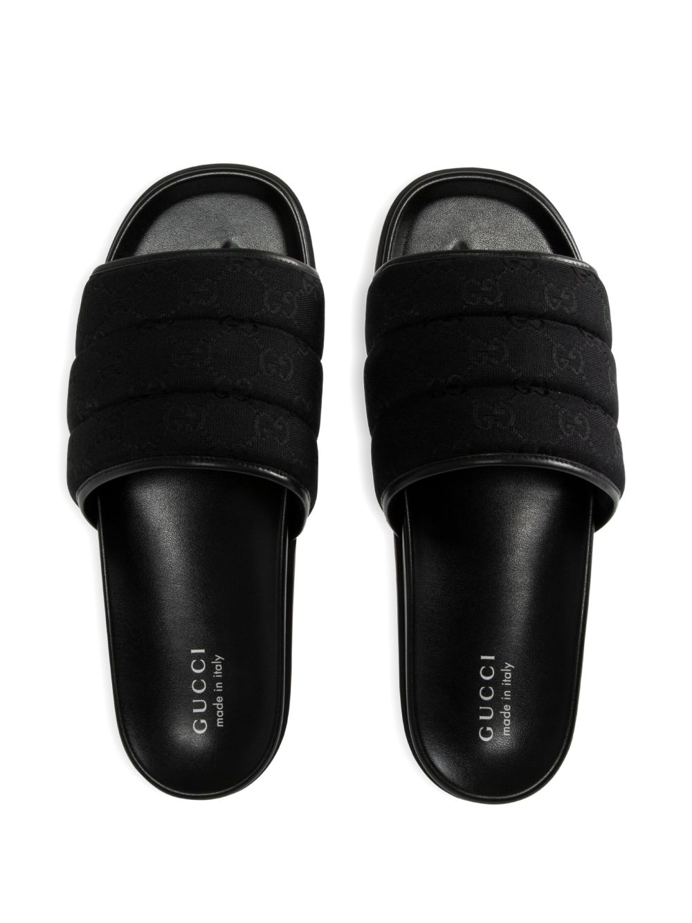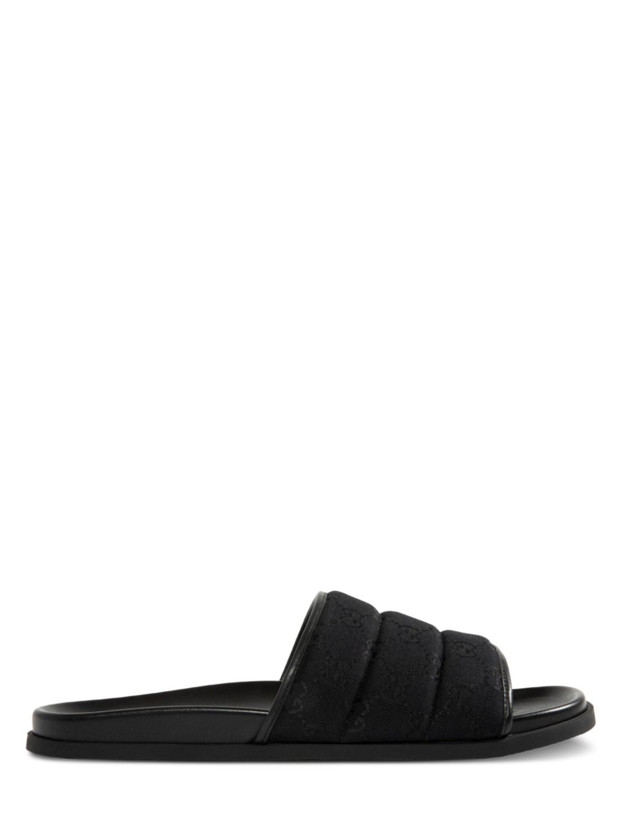 Slider neri di GUCCI caratterizzati da tessuto GG, tomaia imbottita e suola in gomma.