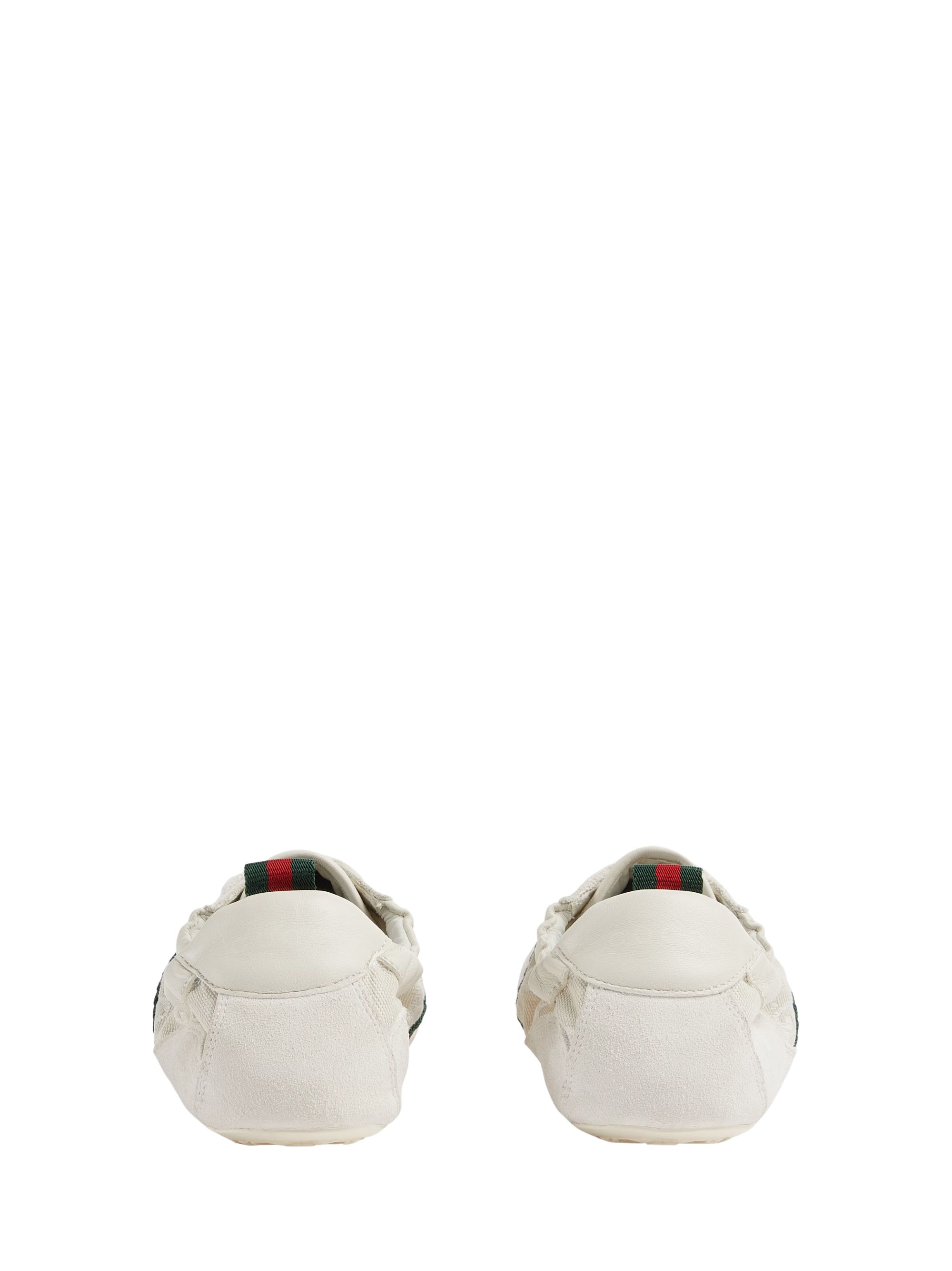 Sneaker Gucci Shift di GUCCI bianca in tessuto GG, caratterizzata da finiture in pelle scamosciata, dettaglio Web, fodera in nylon, dettaglio Incrocio GG in metallo sui laccci, tallone elasticizzato e chiusura con lacci.