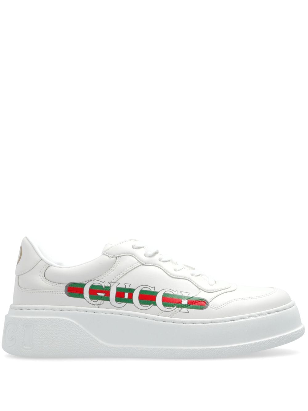 Sneaker in pelle cruelty-free di GUCCI bianca con stampa logo, punta tonda e suola piatta in gomma.