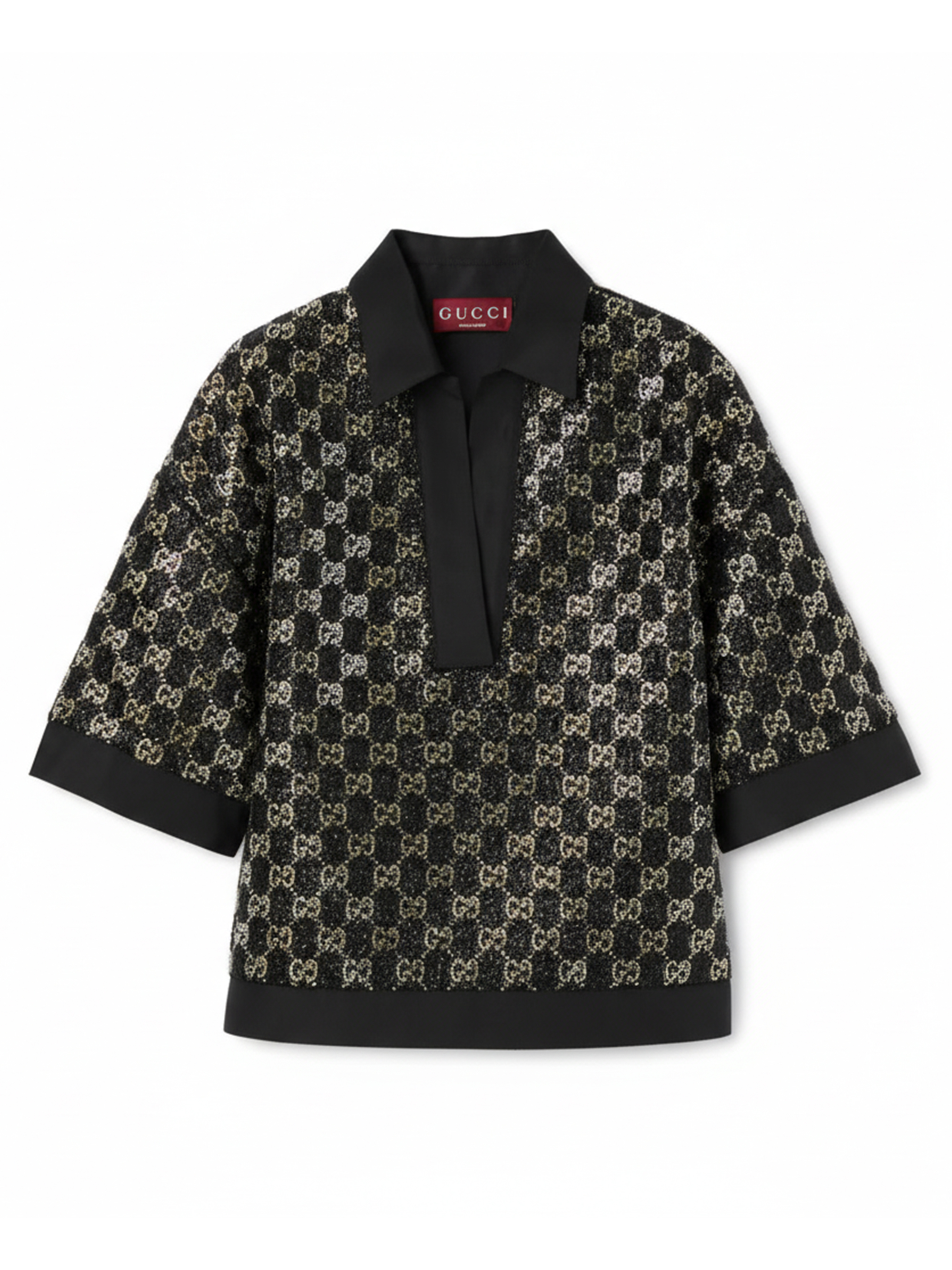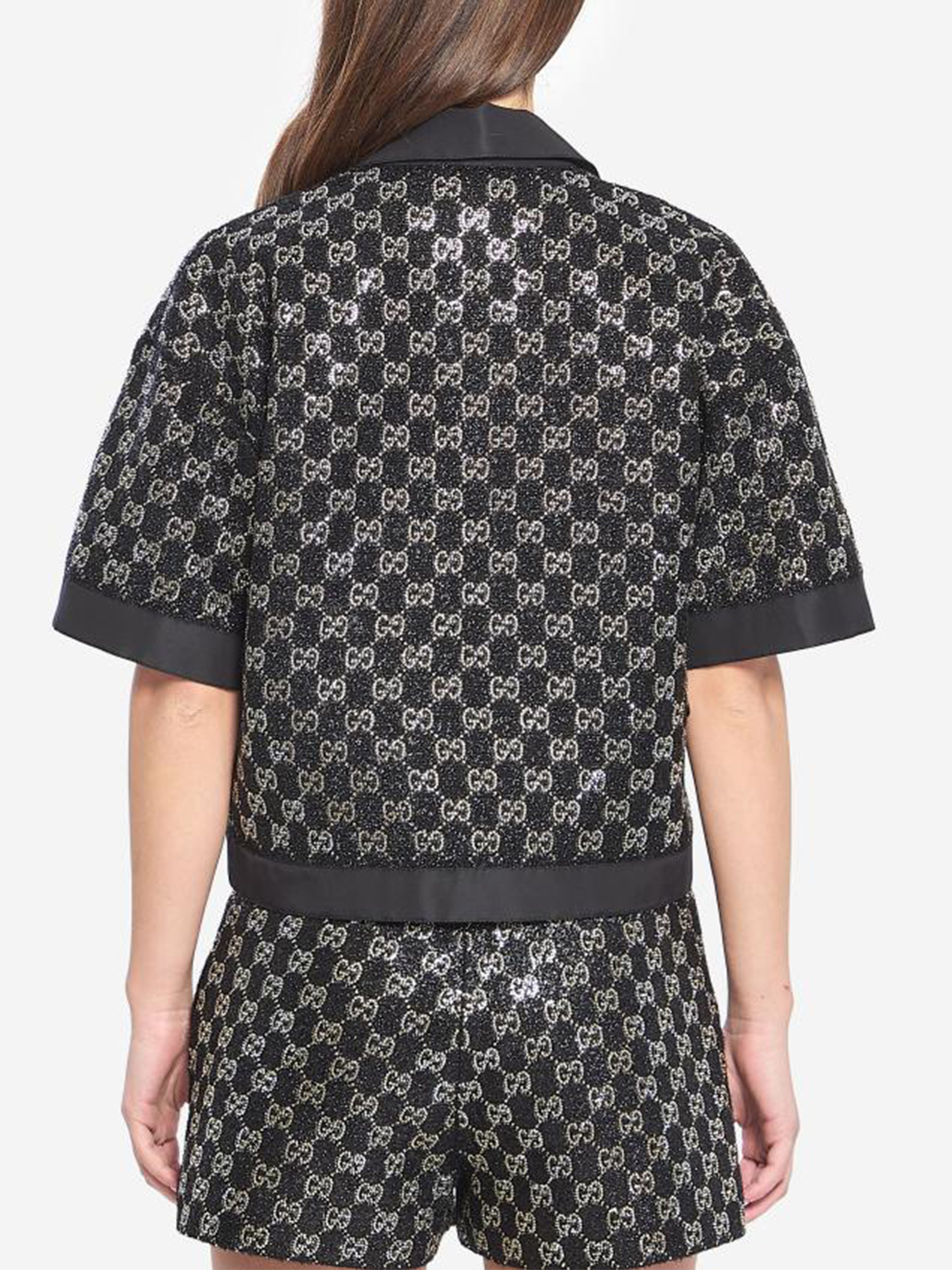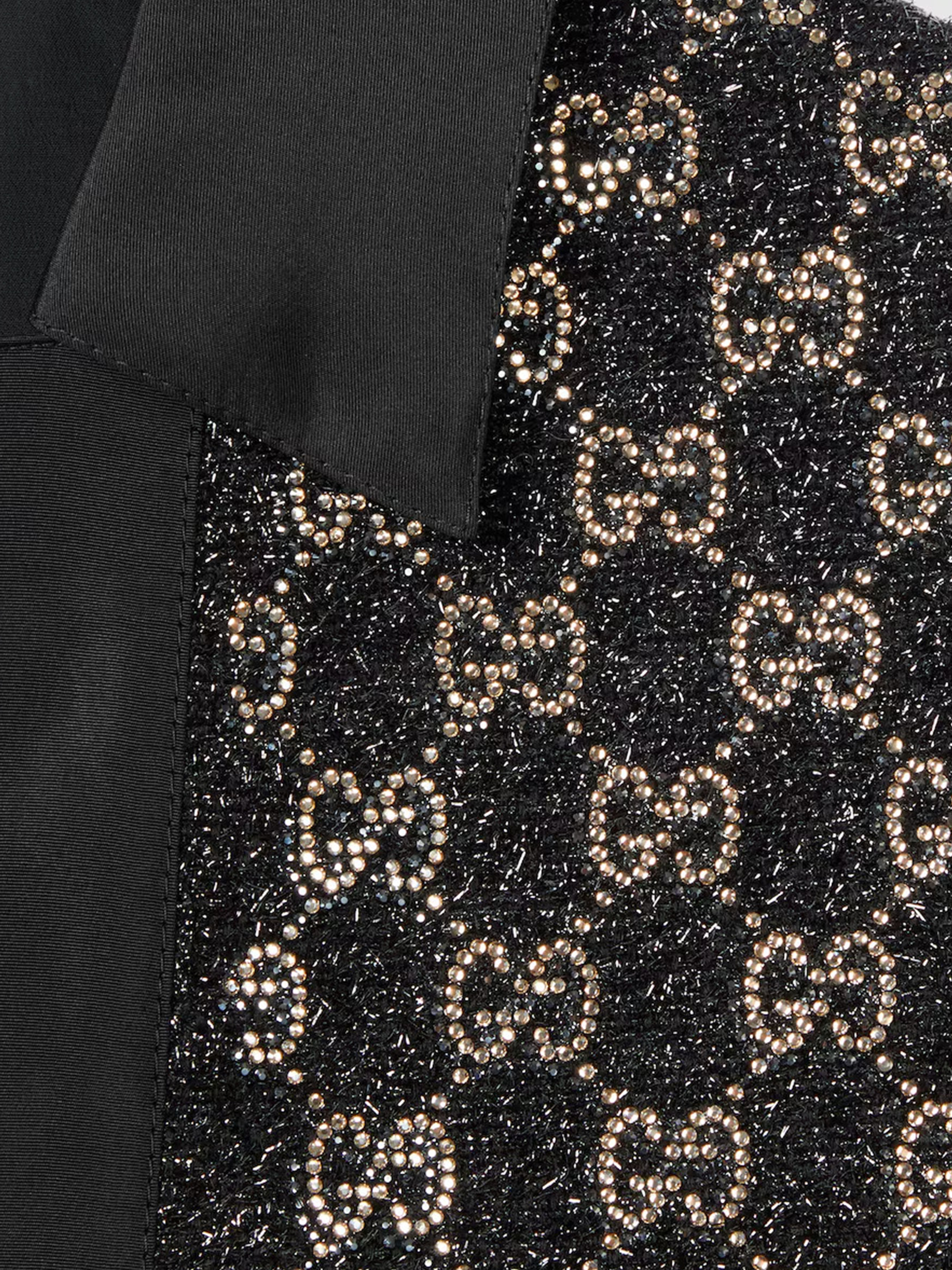 Top in tweed di lana lamé di GUCCI nero in acetato e seta, caratterizzato da cristalli GG, maniche corte, spalle basse e modello foderato.