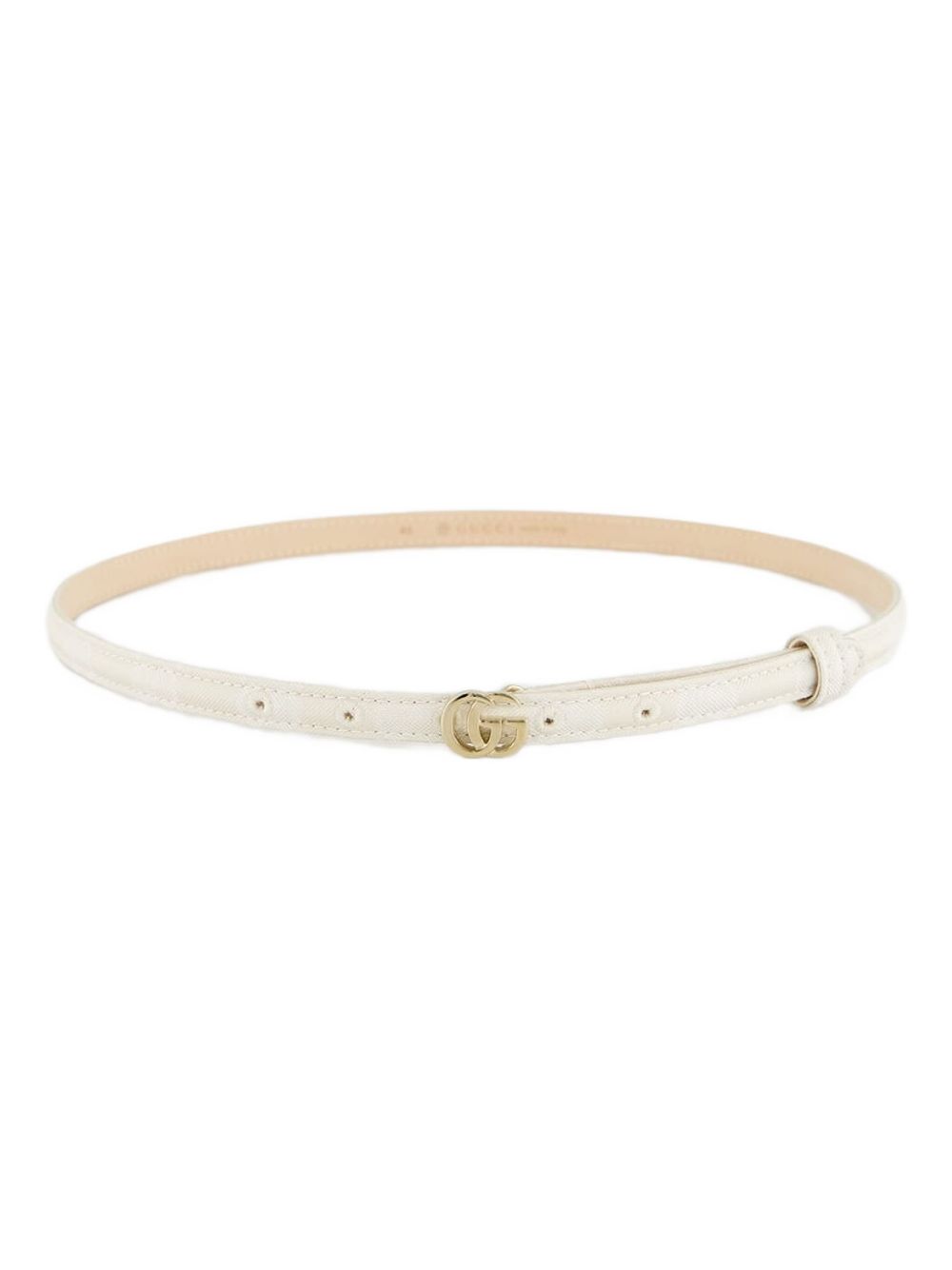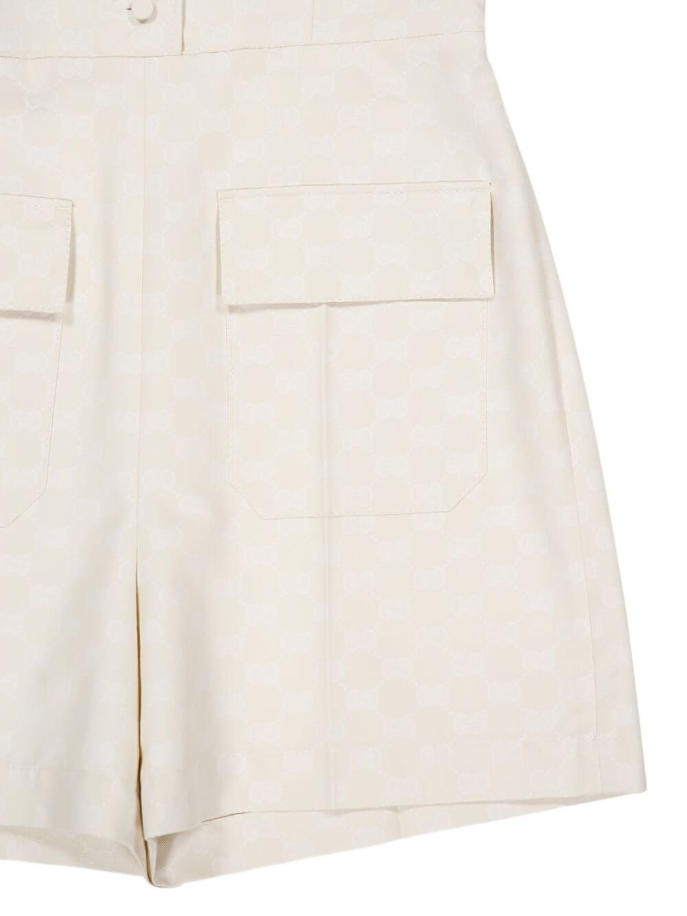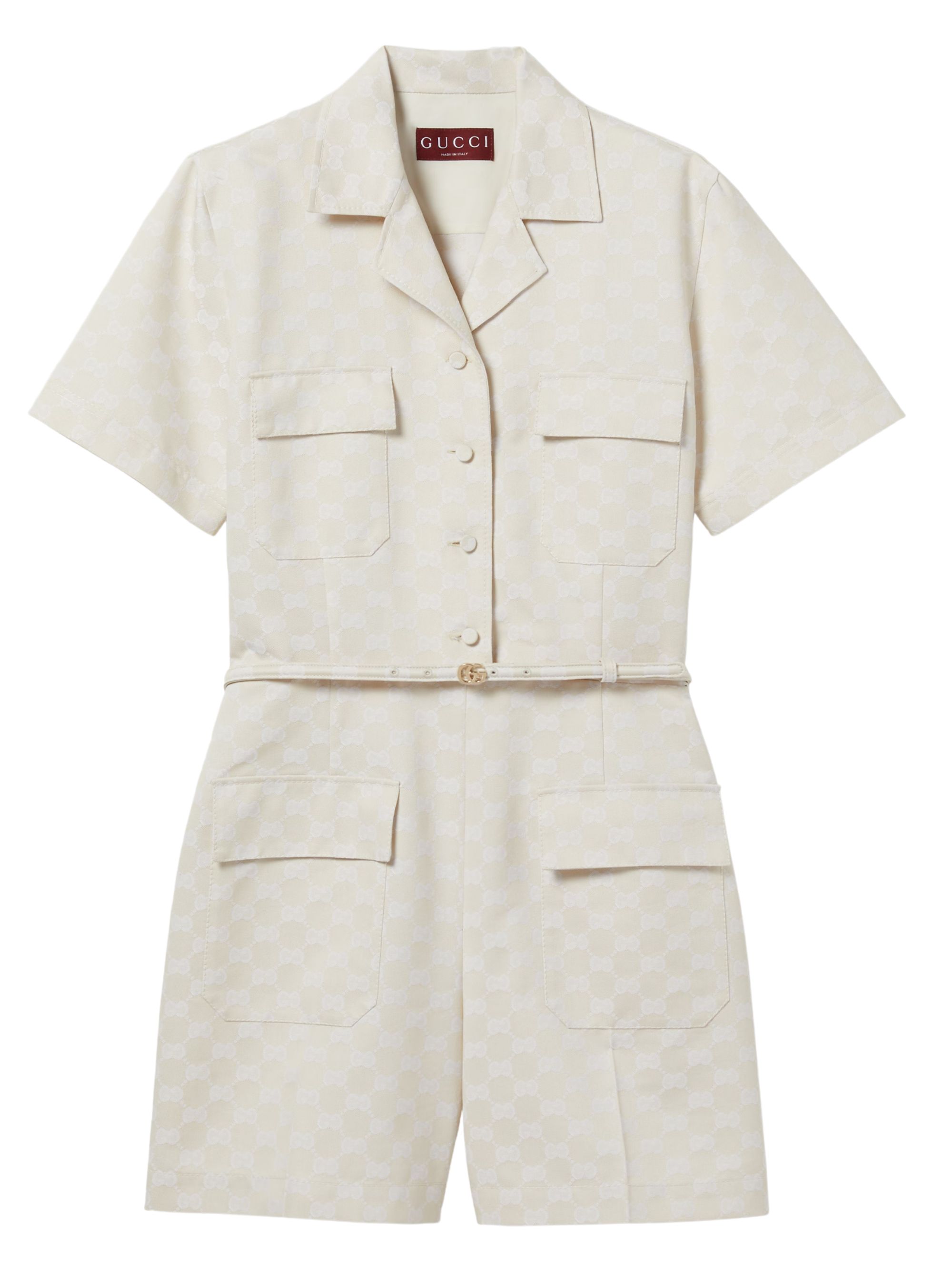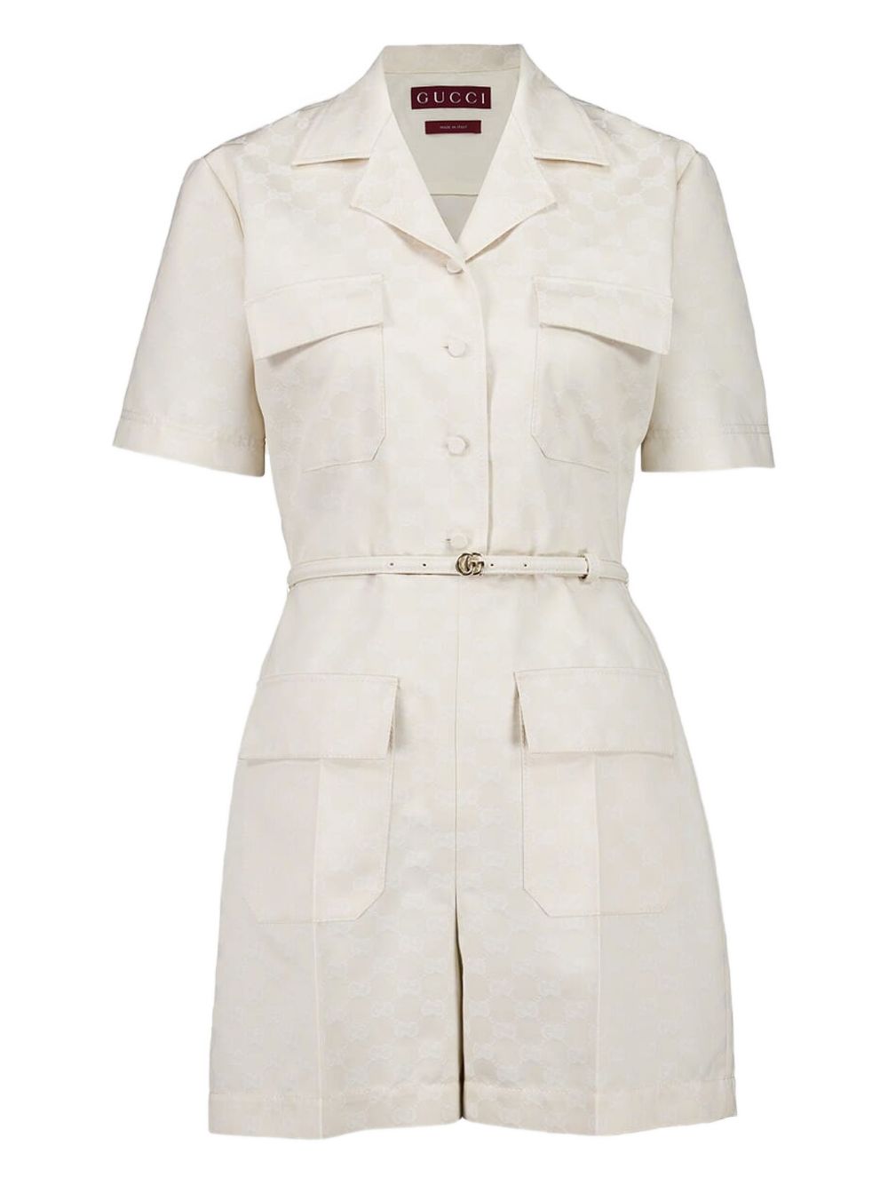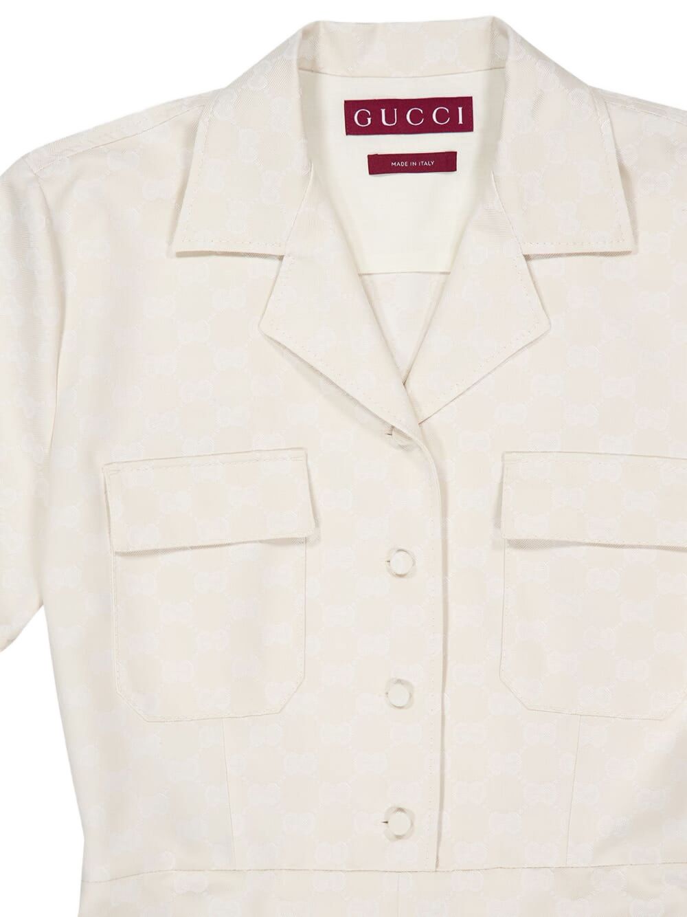 Tuta GG di GUCCI bianca in gabardine di cotone con colletto, tasche, maniche corte, cintura rimovibile con fibbia doppia G oro, tasche posteriori e chiusura con bottoni.