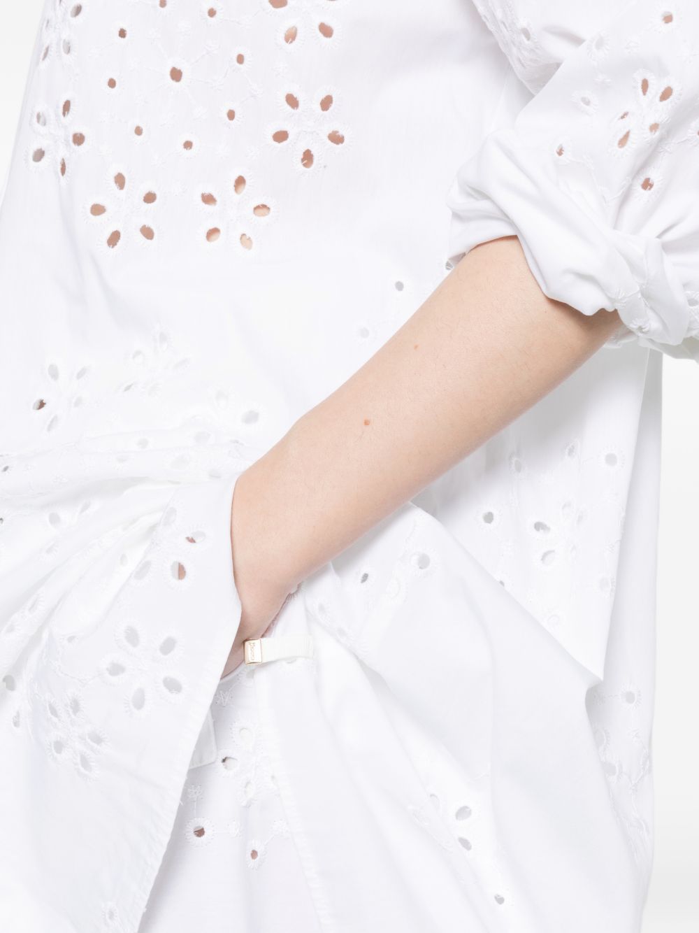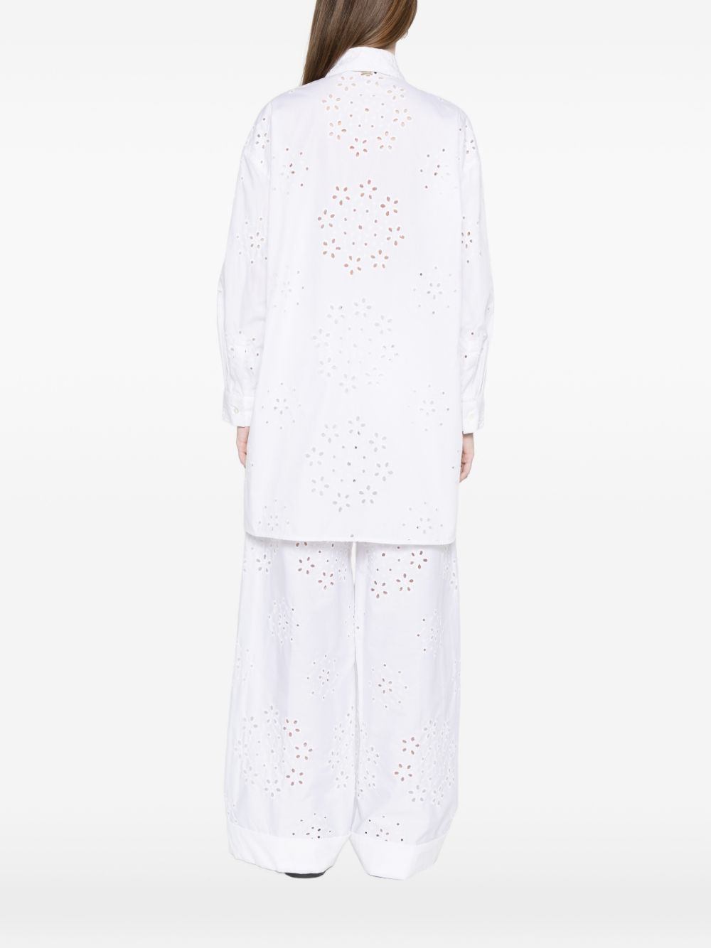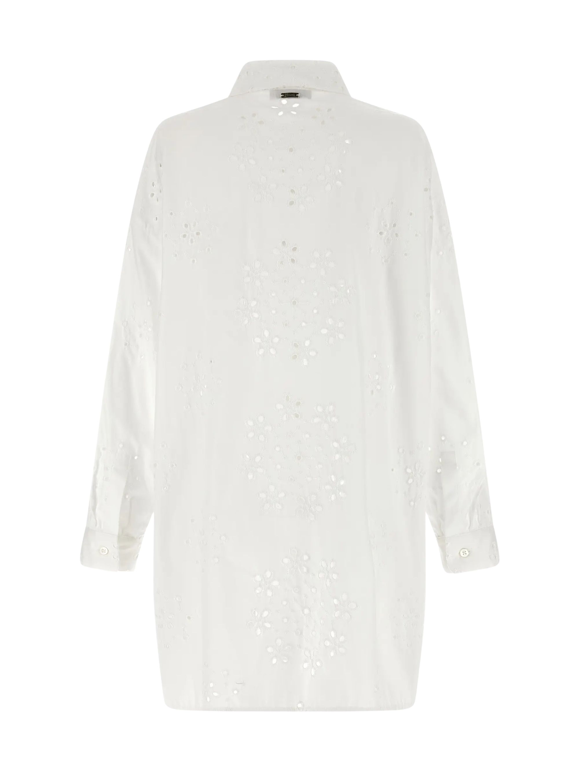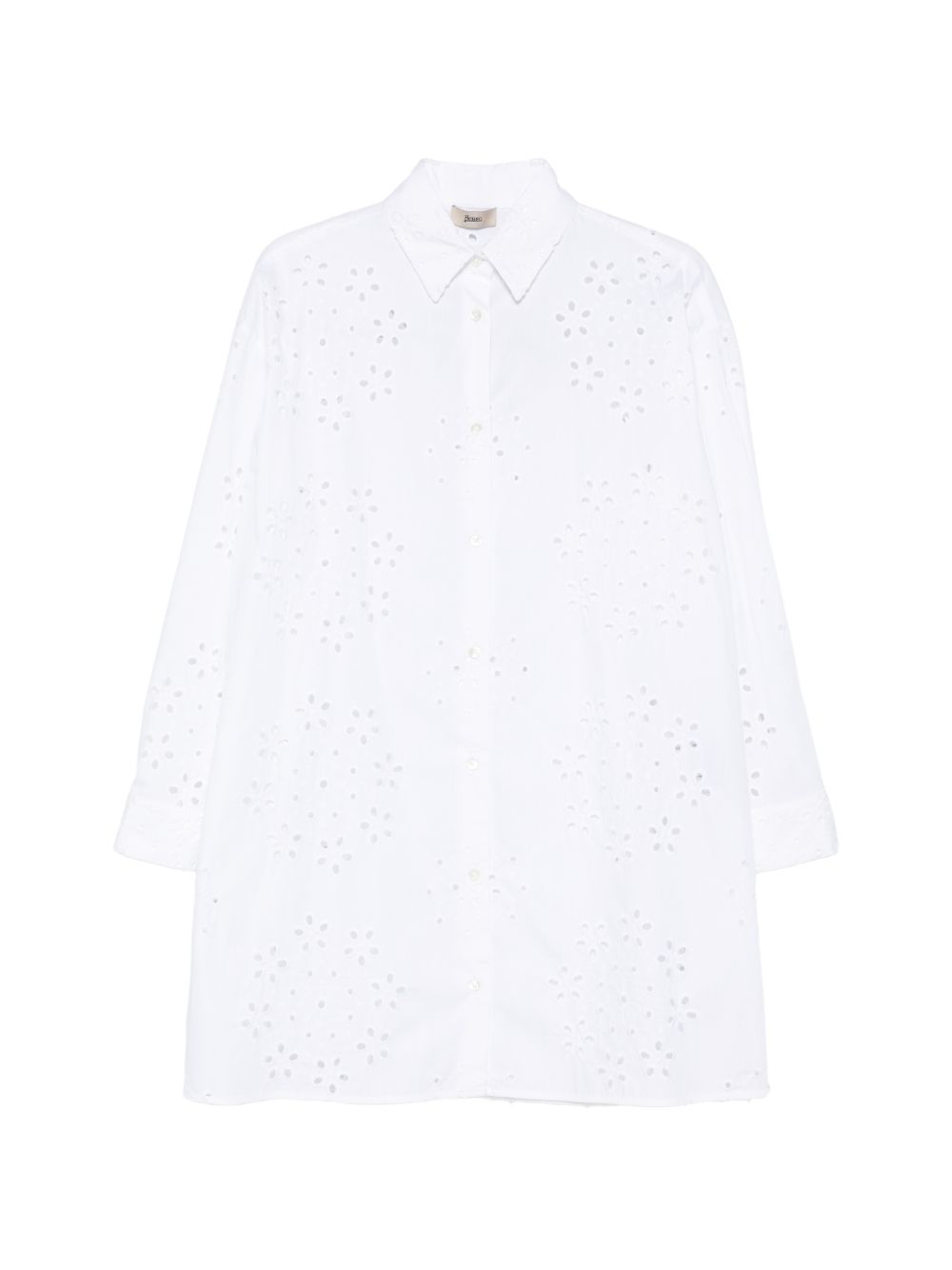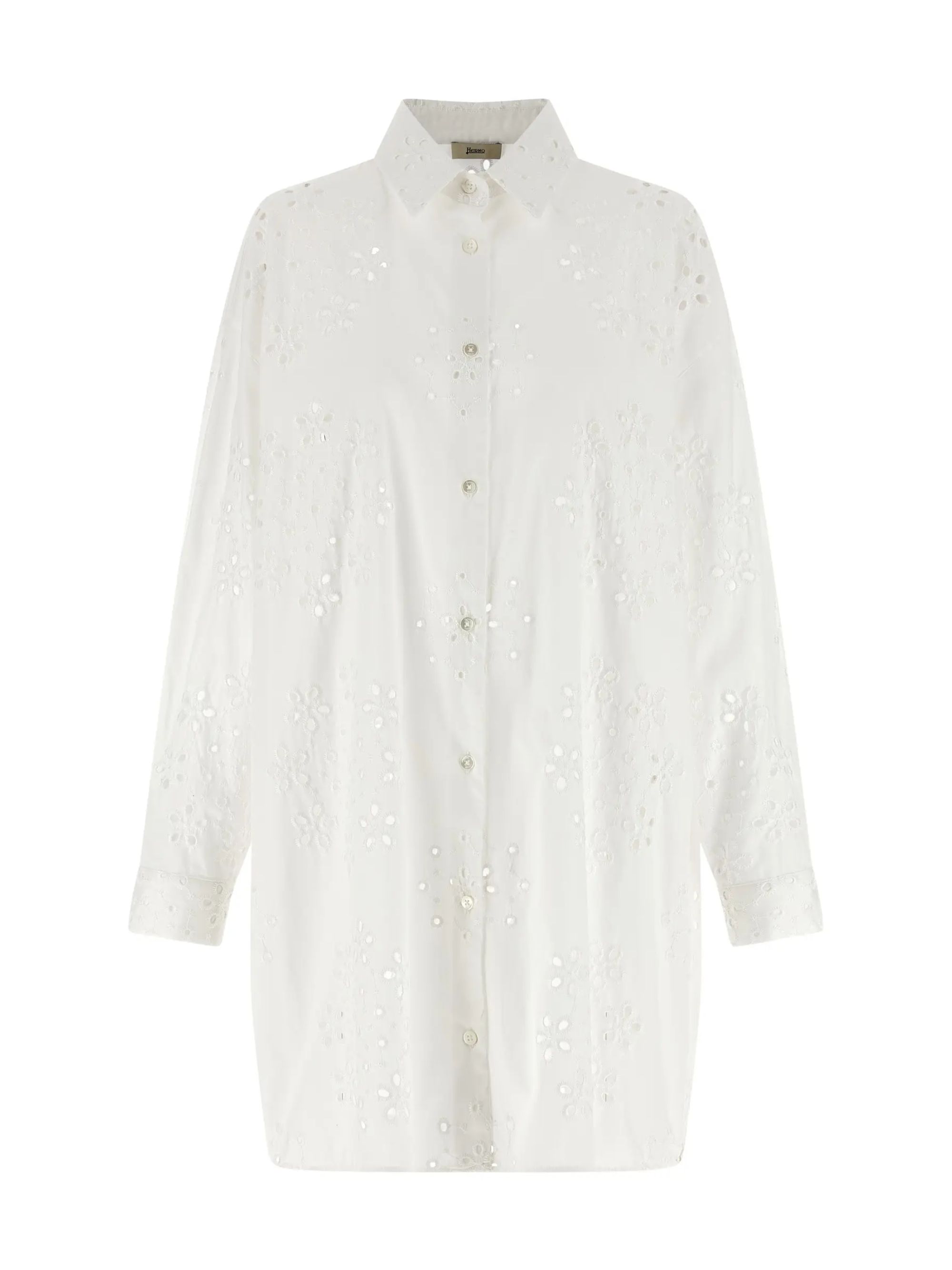 Camicia Borderie Anglaise di HERNO bianca in cotone, caratterizzata da ricami a rilievo, motivi traforati, colletto alla francese, chiusura con bottoni in madreperla e maniche lunghe con polsini.