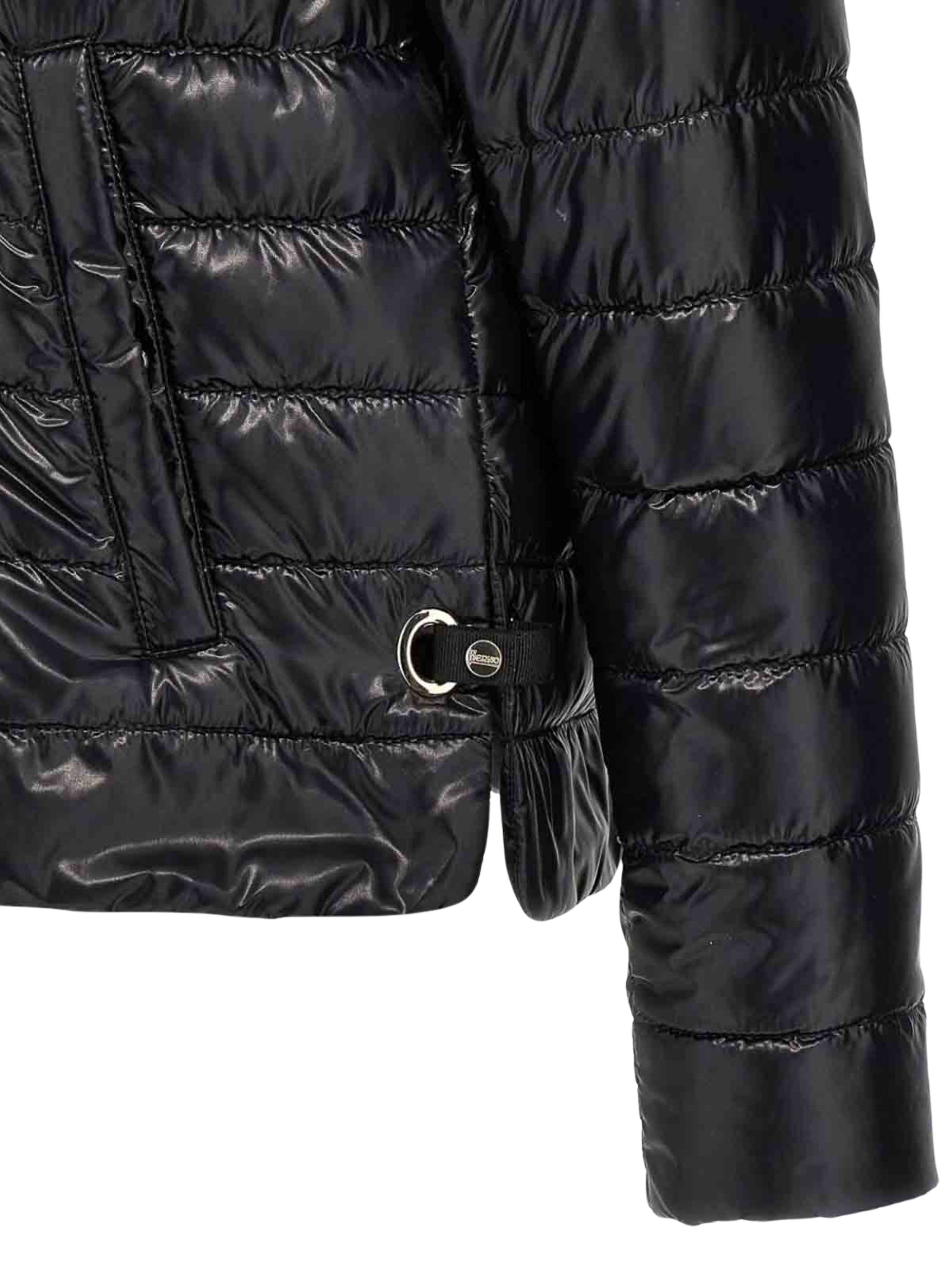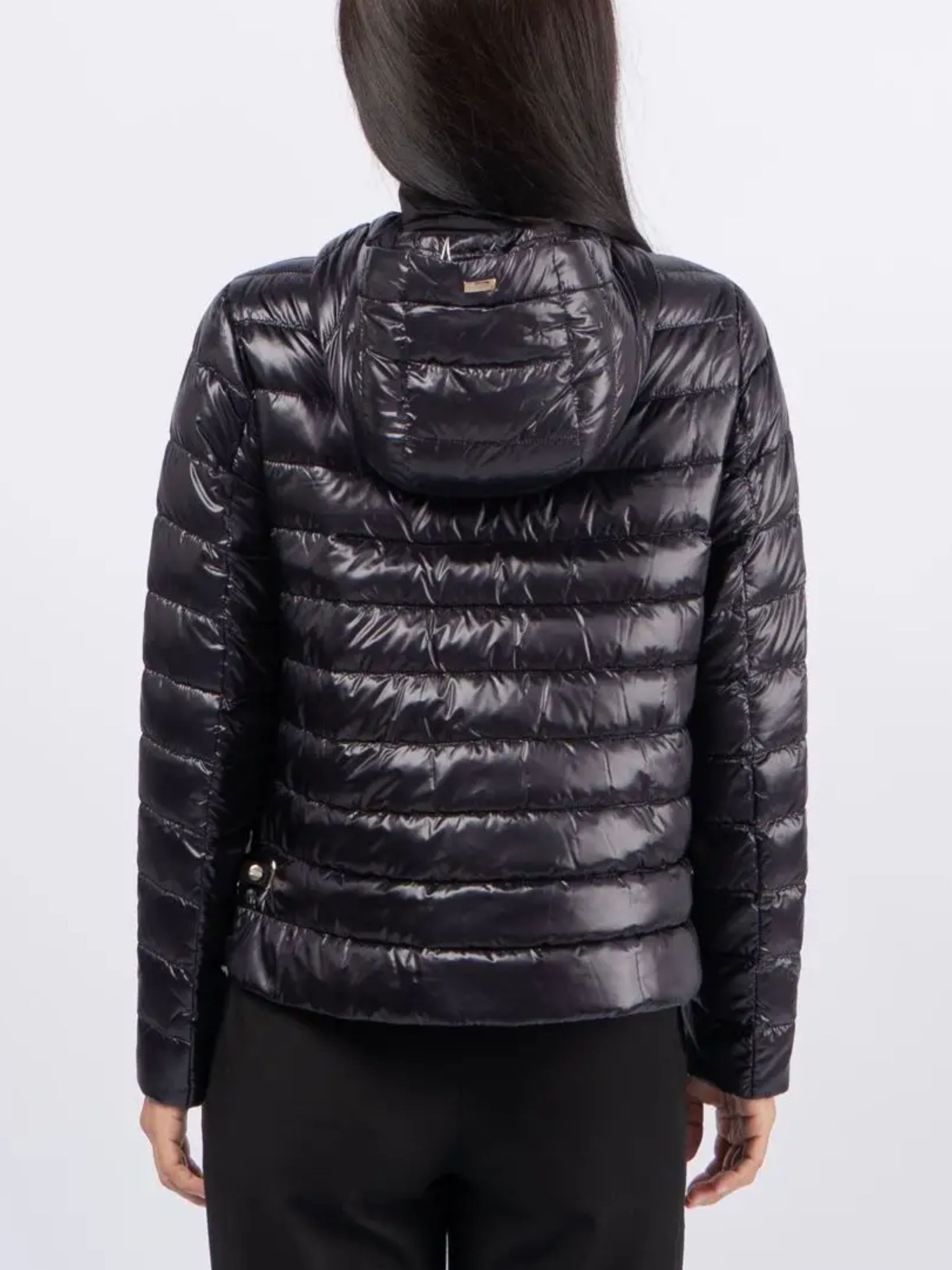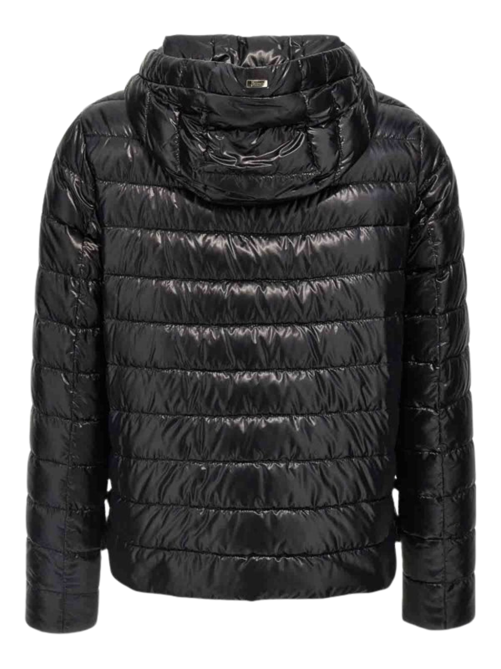 Piumino leggero di HERNO nero in nylon, caratterizzato da chiusura con bottoni nascosti, collo alto con cappuccio, girocollo con maxi coulisse in gros grain con finali in metallo logato e tasche a filetto.