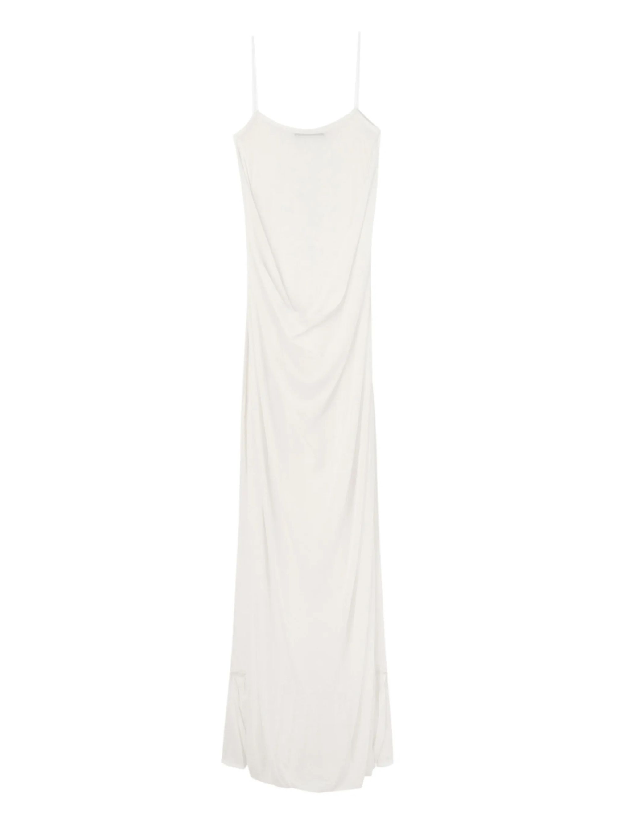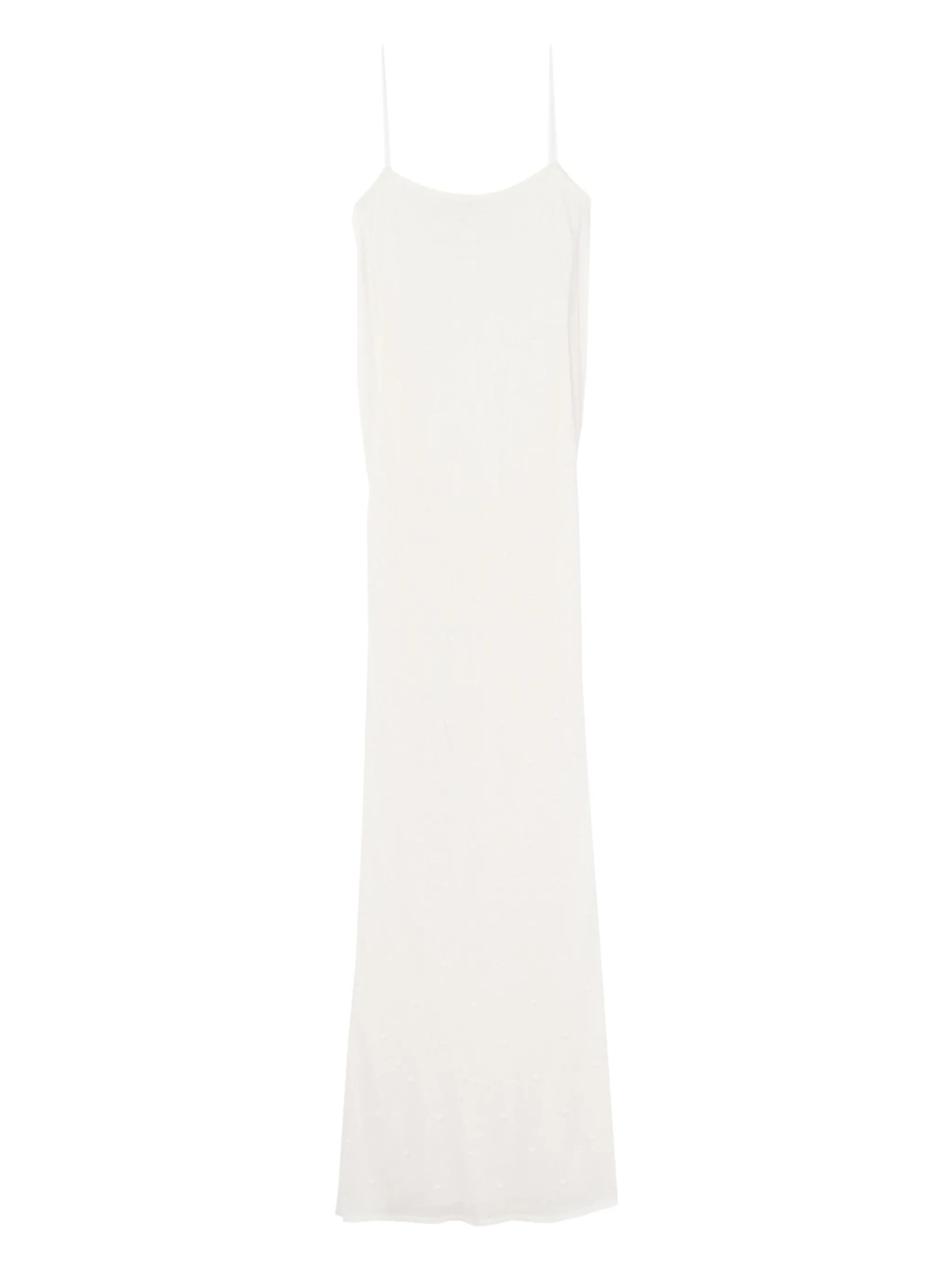 Abito Plumetis di JACQUEMUS bianco in viscosa, caratterizzato da taglioa derente, tessuto trasparente con motivo a pois, spalline sottili, scollo dritto, retro con scollo a cappuccio drappeggiato e lunghezza alla caviglia.