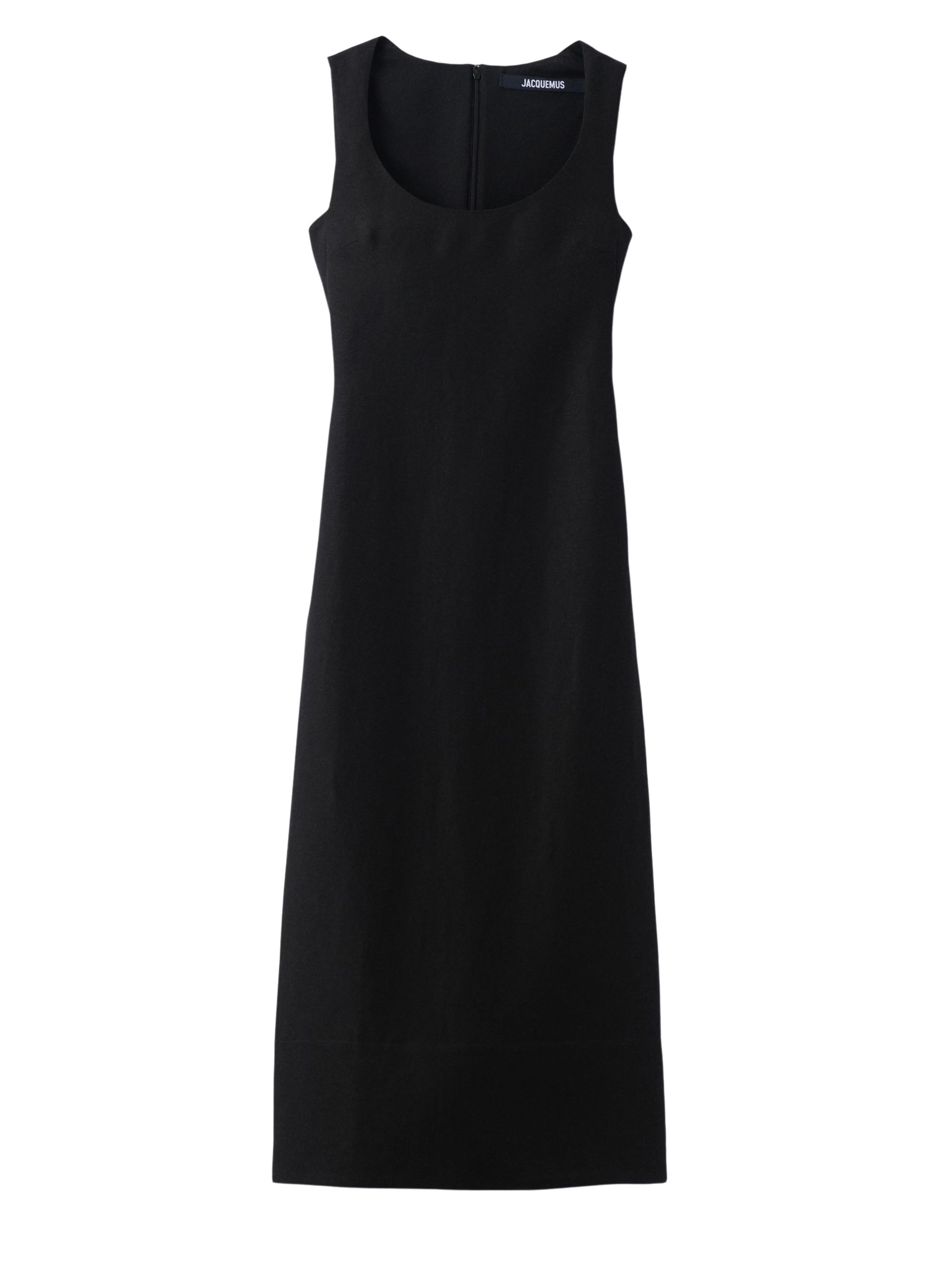 Abito Tablier di JACQUEMUS nero in lino e viscosa, caratterizzato da taglio aderente, scollatura profonda, giromanica squadrato, silhouette a grembiule con pighe su ogni lato, zip invisibile sul retro e spacco posteriore.
