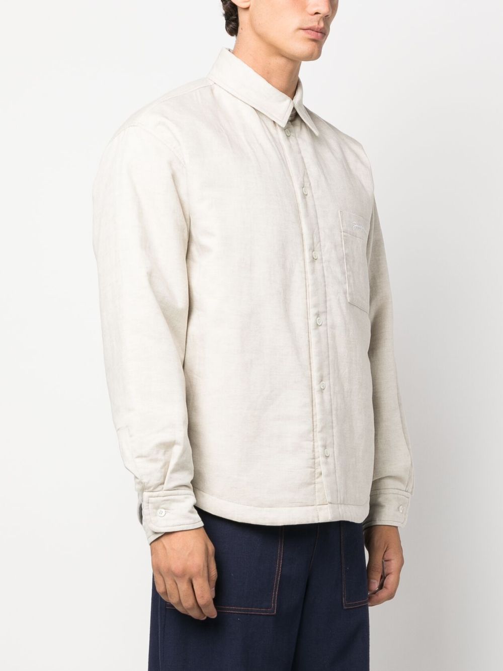 Camicia La Chemise Boulanger di JACQUEMUS écru in misto cotone e lino con logo ricamato sul petto, colletto classico, tasca applicata sul petto, orlo curvo e chiusura con bottoni.