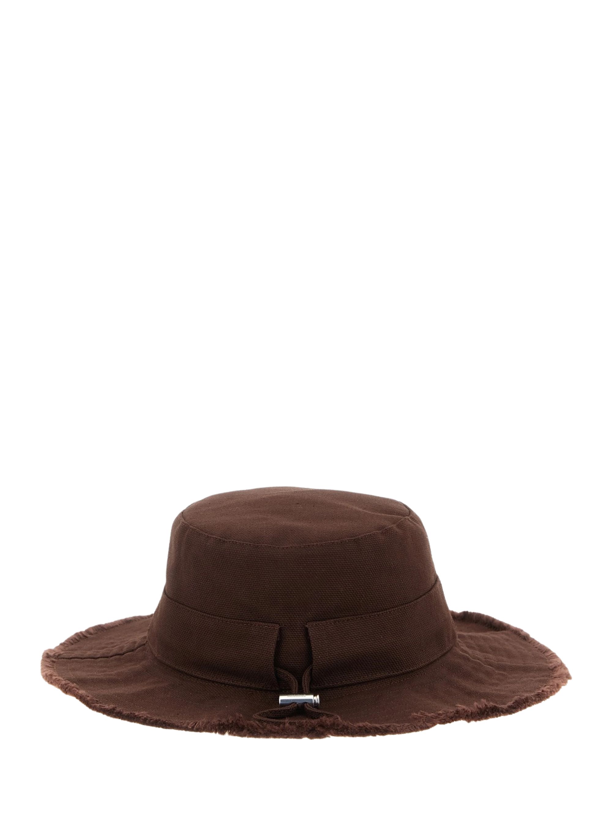 Cappello da pescatore Artichaut di JACQUEMUS marrone in cotone, caratterizzato da cordoncino lungo e regolabile, frange sui bordi, logo in metallo argentato e tesa con impunture.