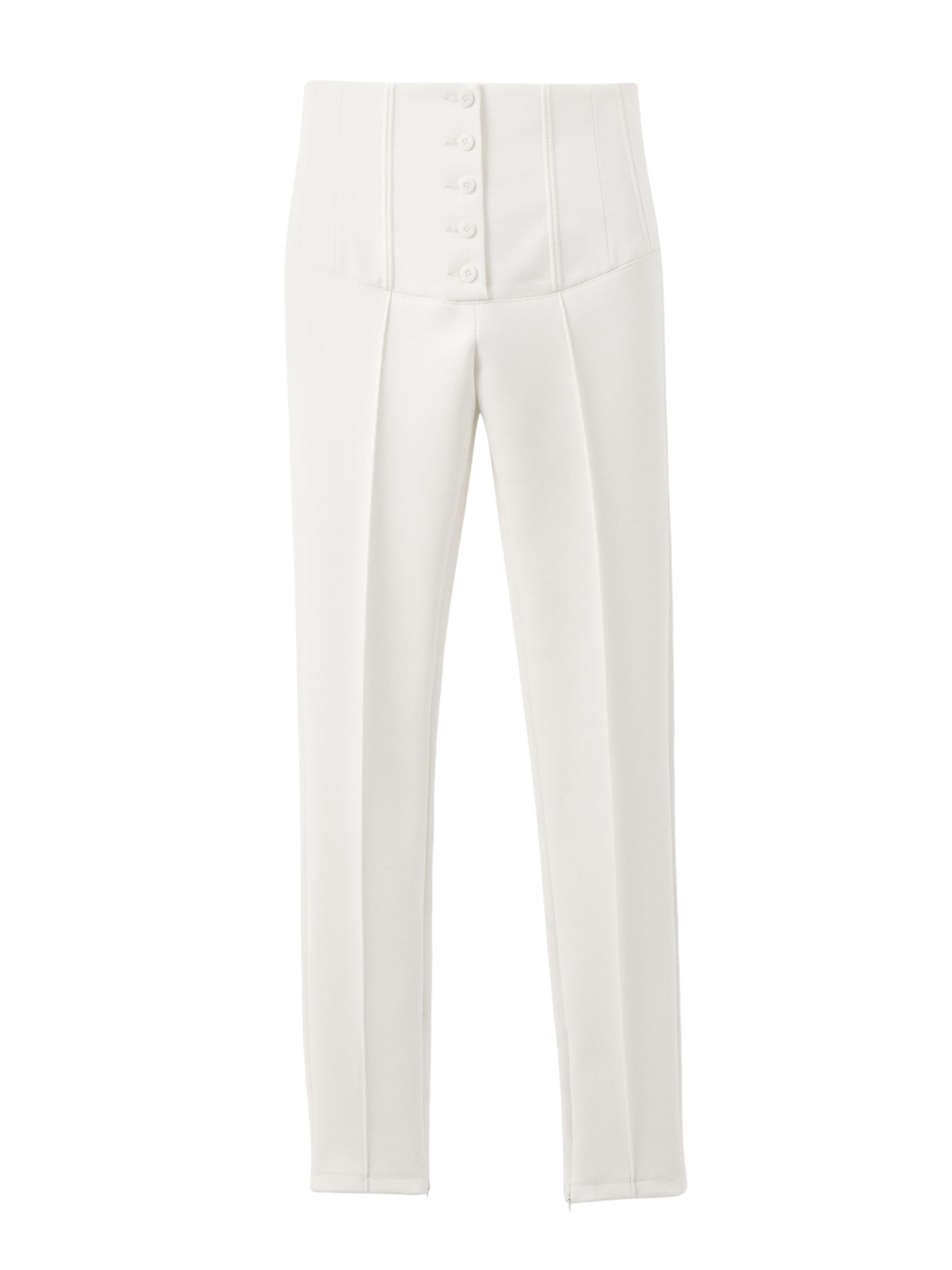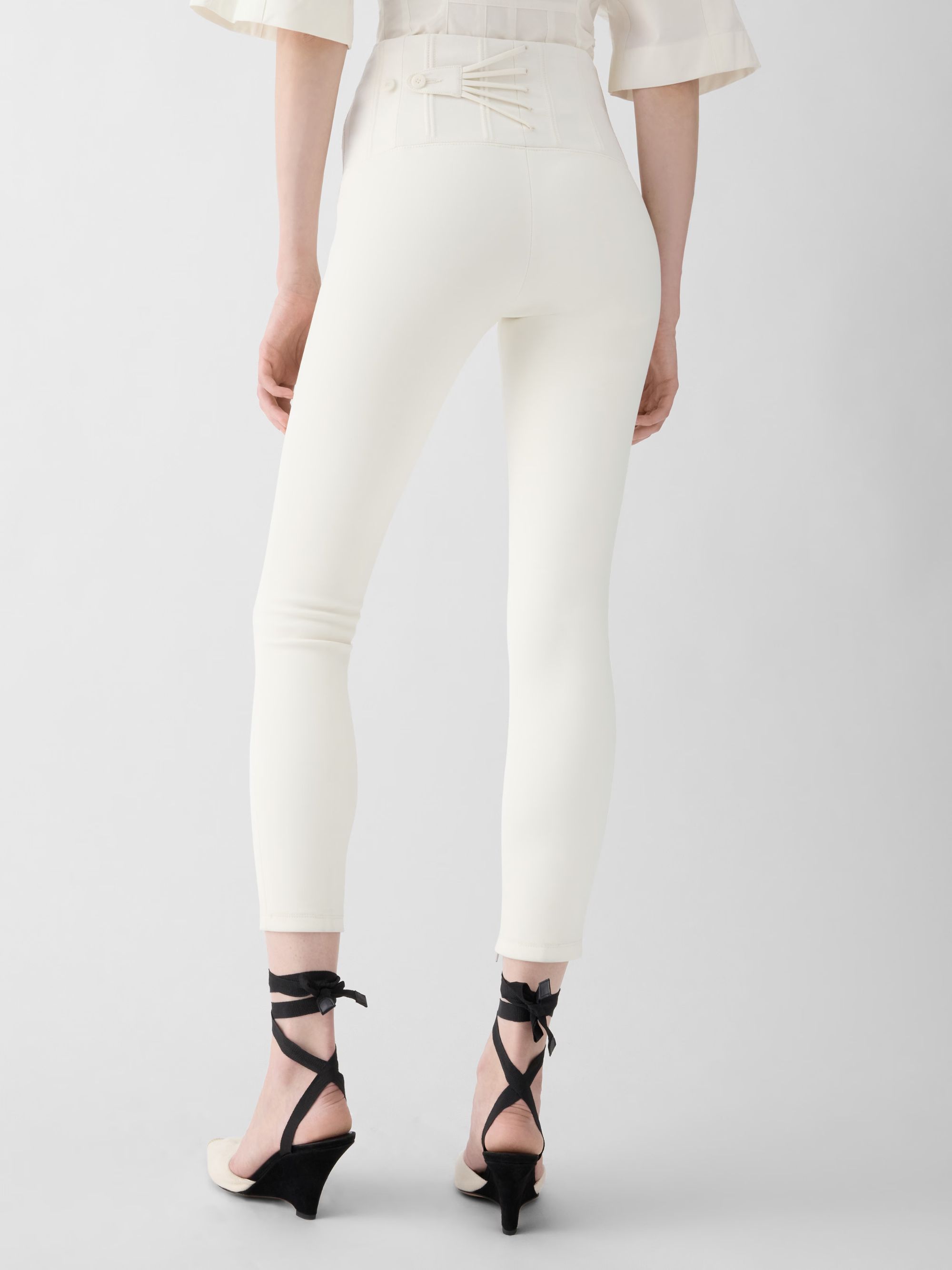 Pantalone Arlesien di JACQUEMUS bianco in crêpe elasticizzato, skinny, caratterizzato da vita alta ispirata al corsetto, impreziosita da cuciture scultoree e bottoni tono su tono e chiusura con bottoni.