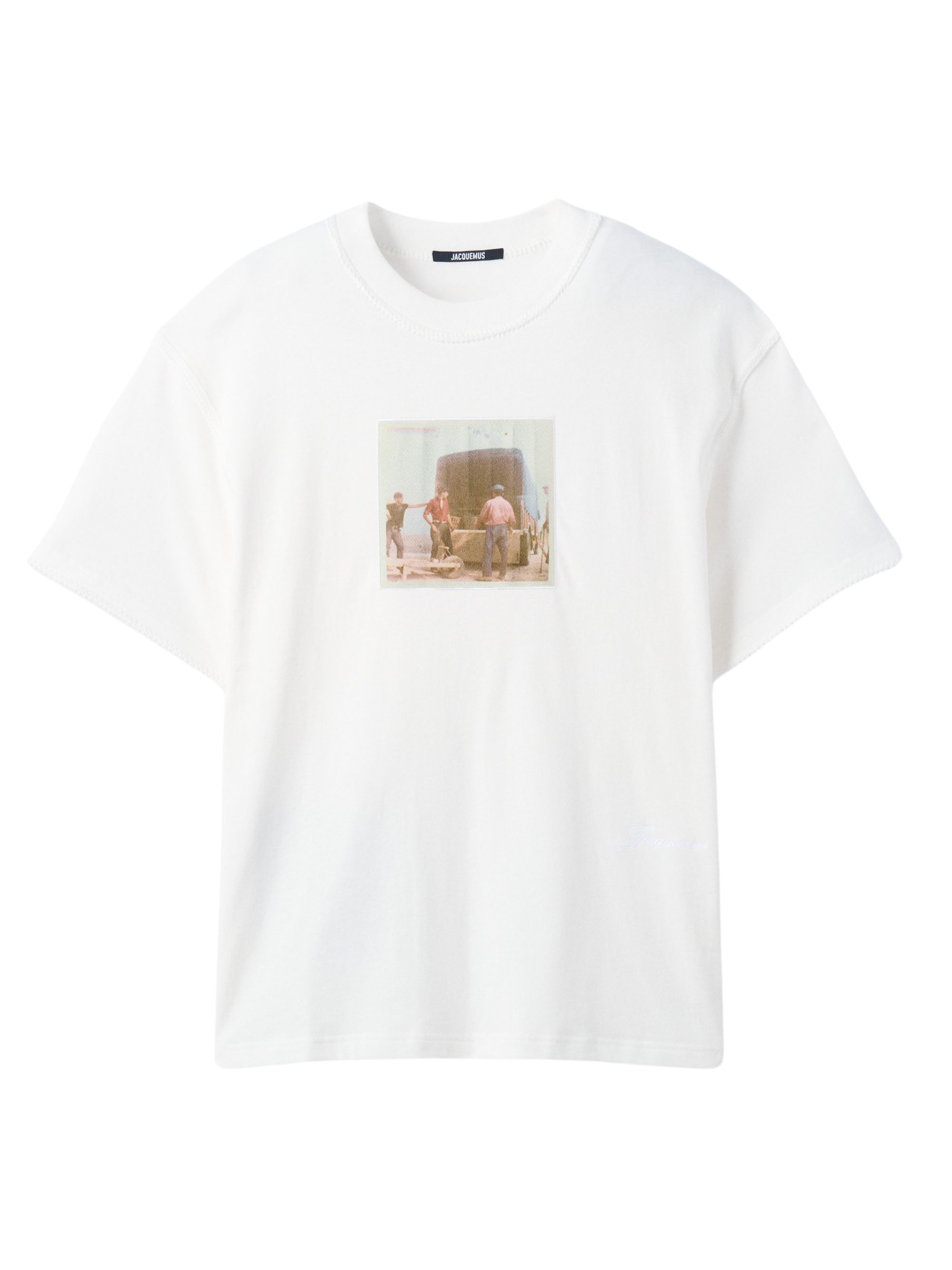 T-shirt Paysan di JACQUEMUS bianca in cotone, caratterizzata da girocollo a coste, maniche corte boxy, foto vintage stampate su fronte e retro, logo ricamato e cuciture overlock.