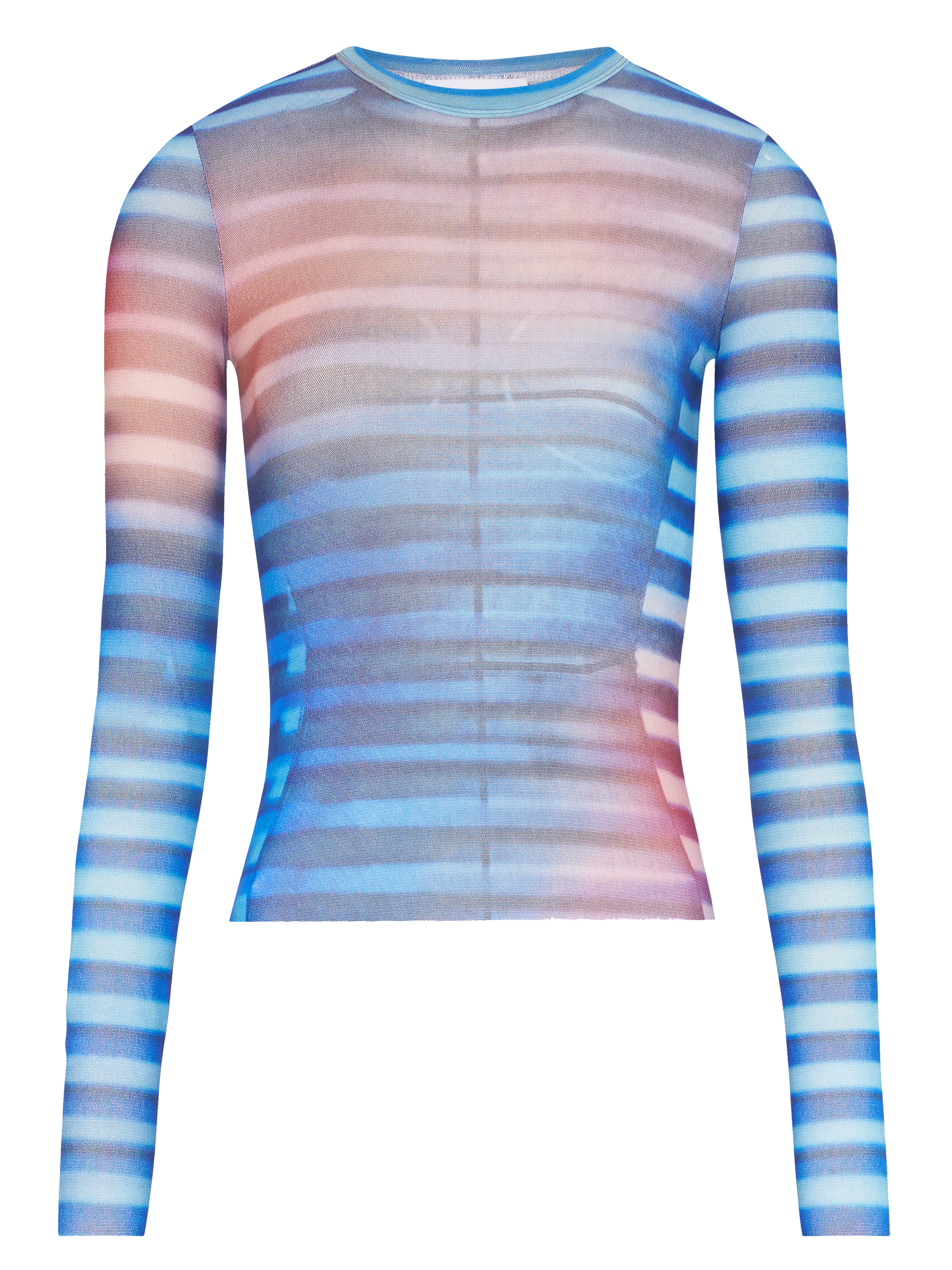 Maglia manica lunga di JEAN PAUL GAULTIER blu e rosa in rete con stampa Air e girocollo.